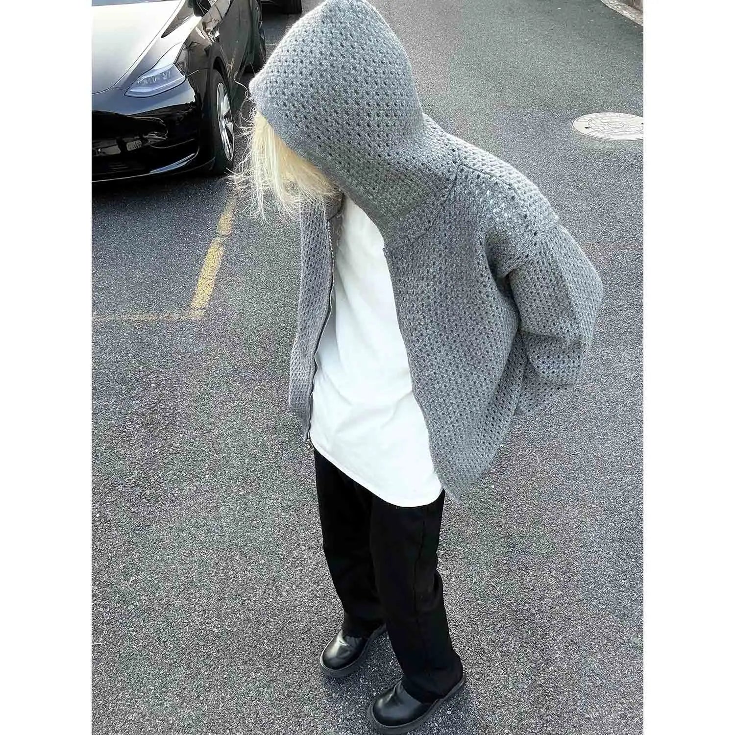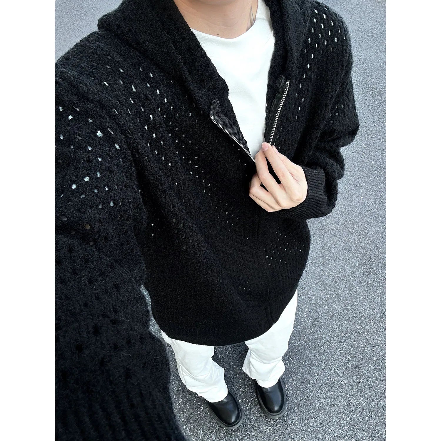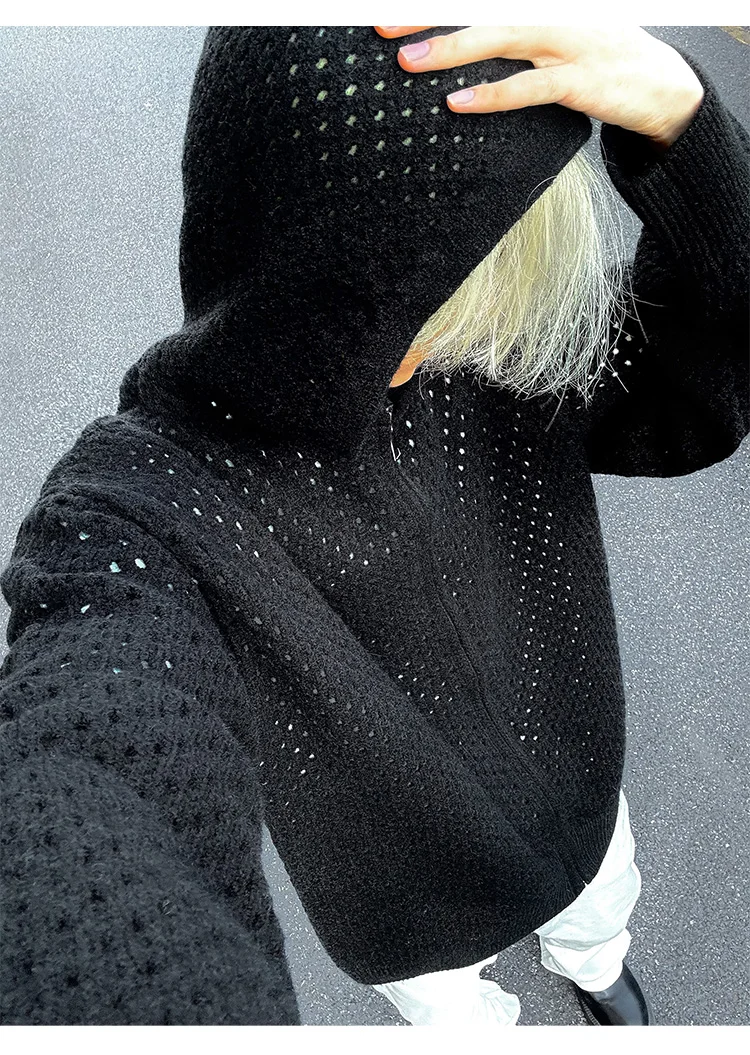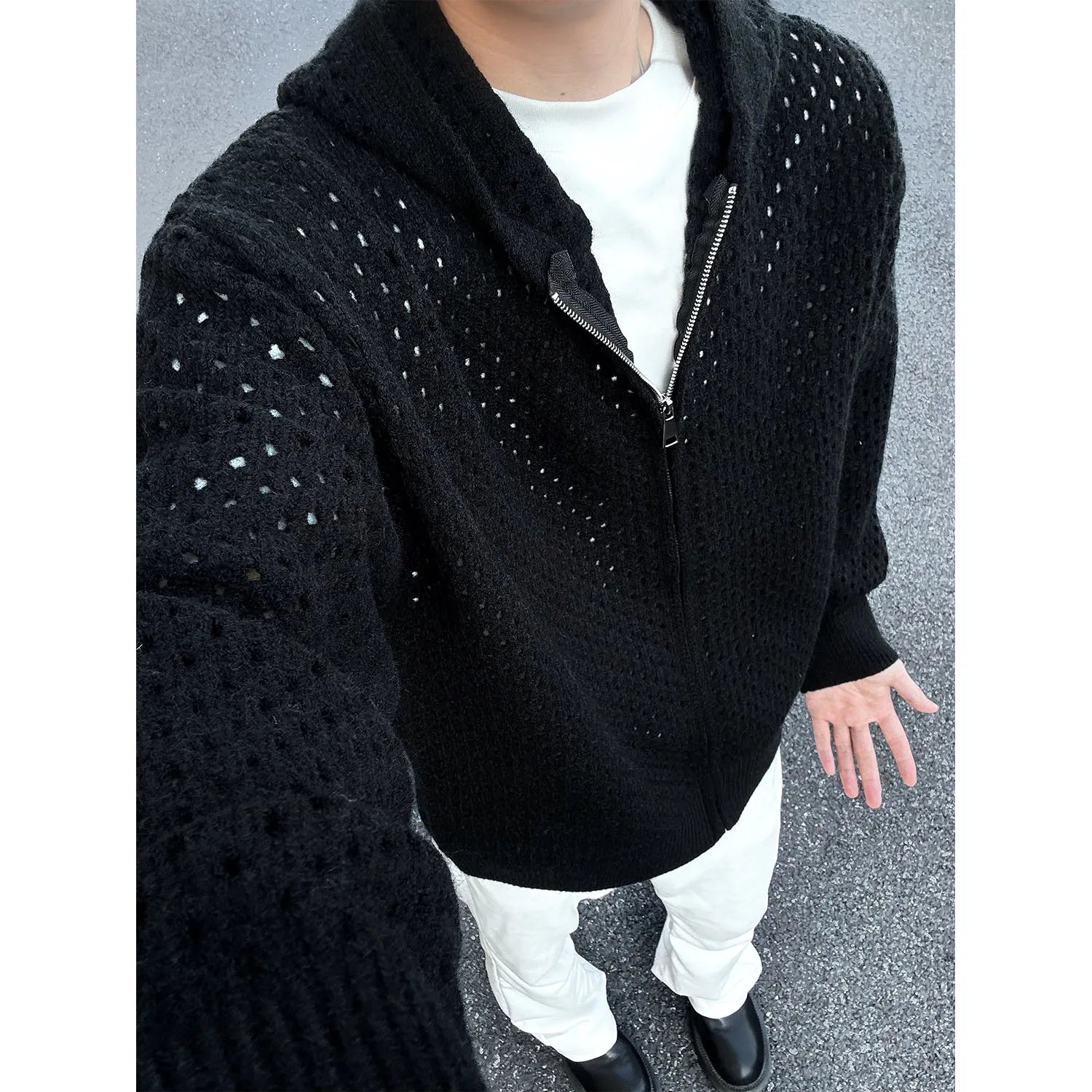 Hollow Out Knit Sweater Men Women Casual Loose Fishing Net Long Sleeve Male Tops 2024 Autumn Streetwear Hooded Pullovers
