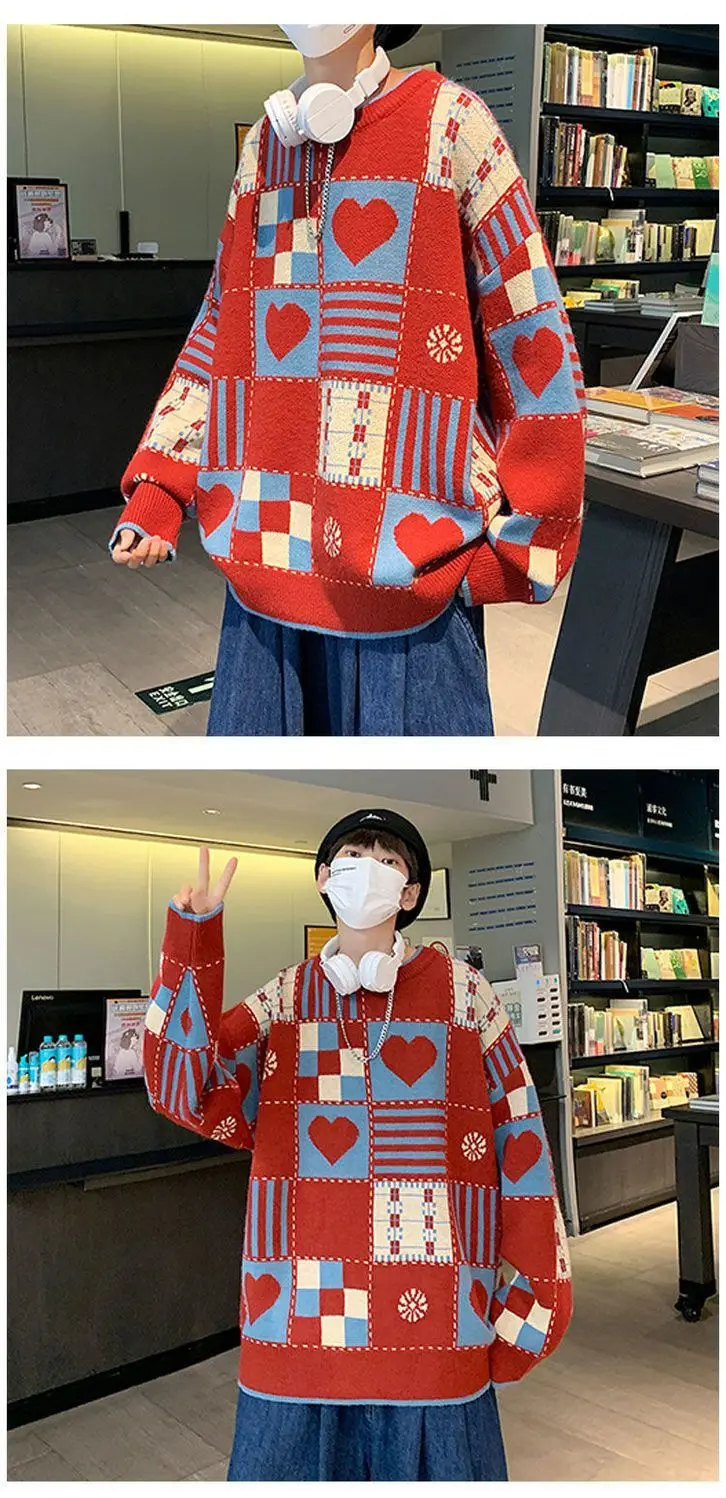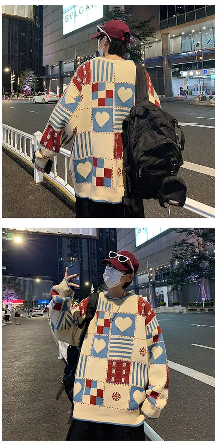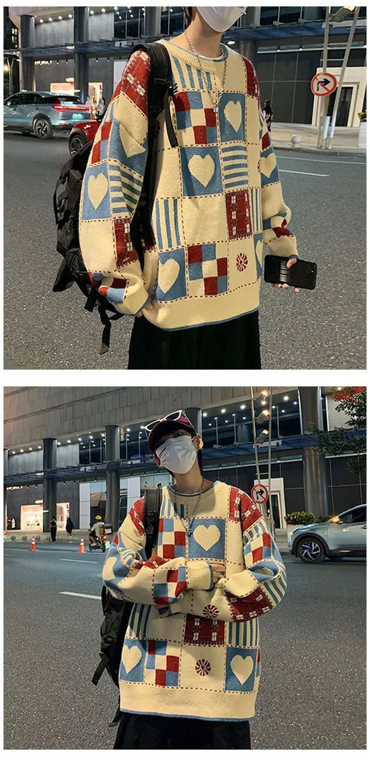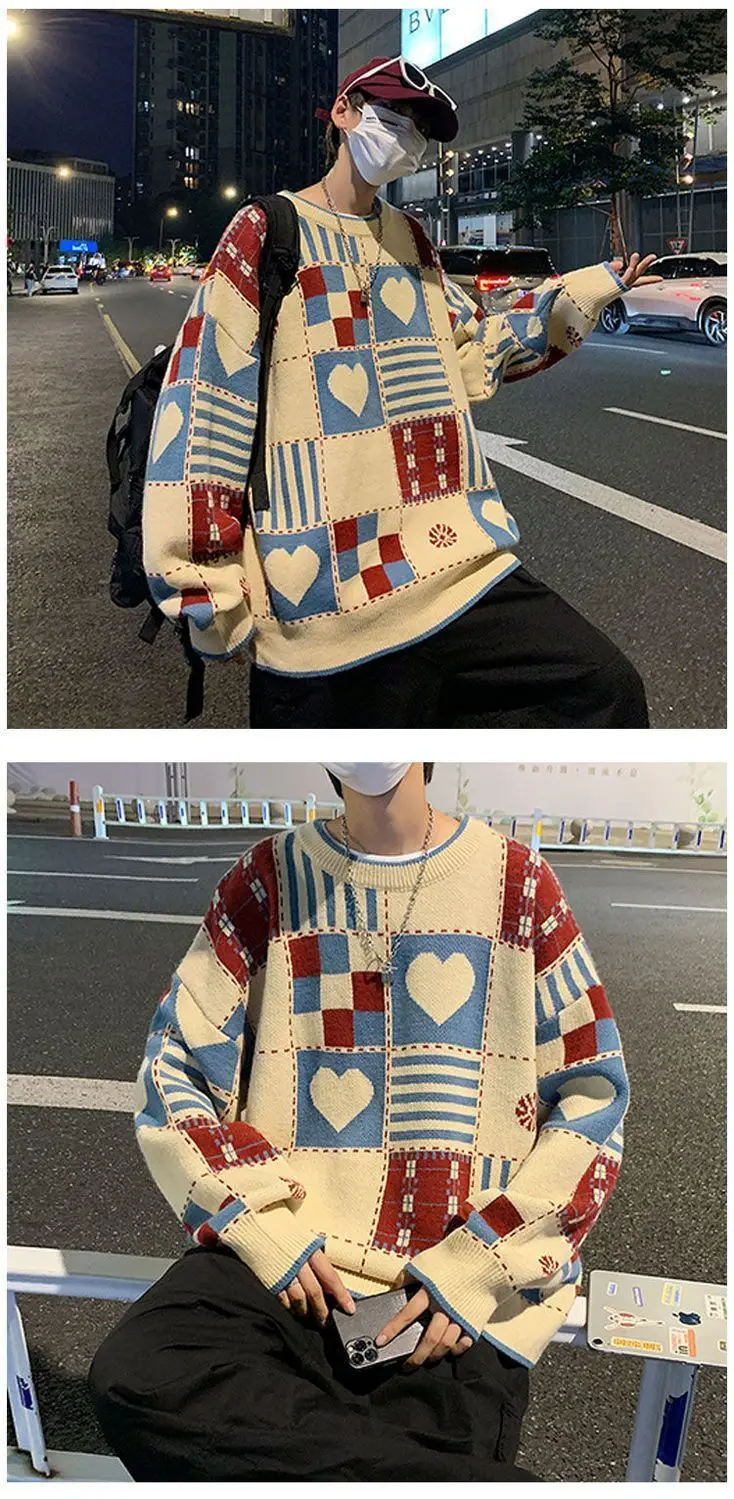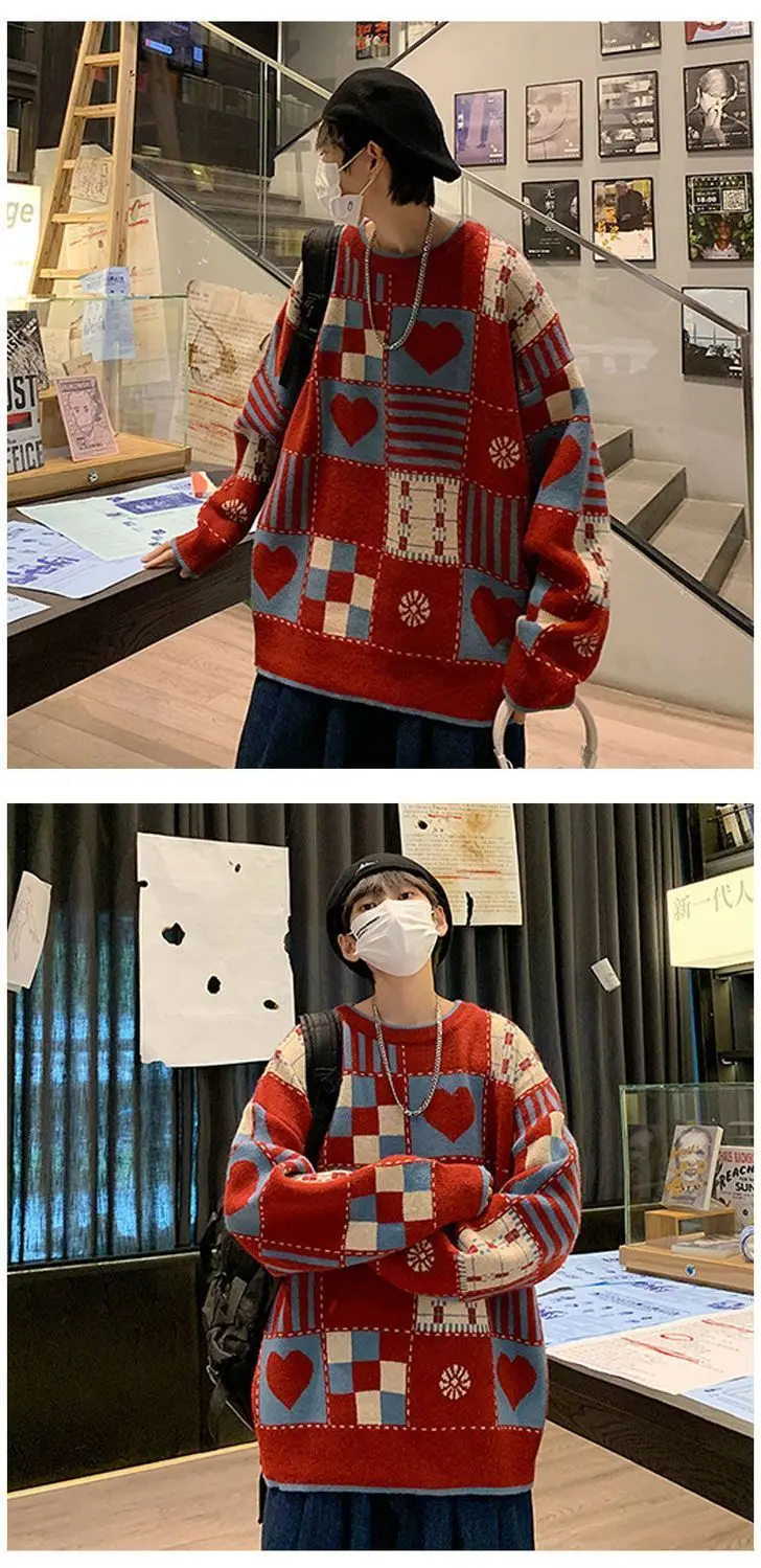 Japanese Retro Contrasting Checkered Heart-shaped Round Neck Sweater Men's and Women's Trendy Brand Loose Fitting Student Couple