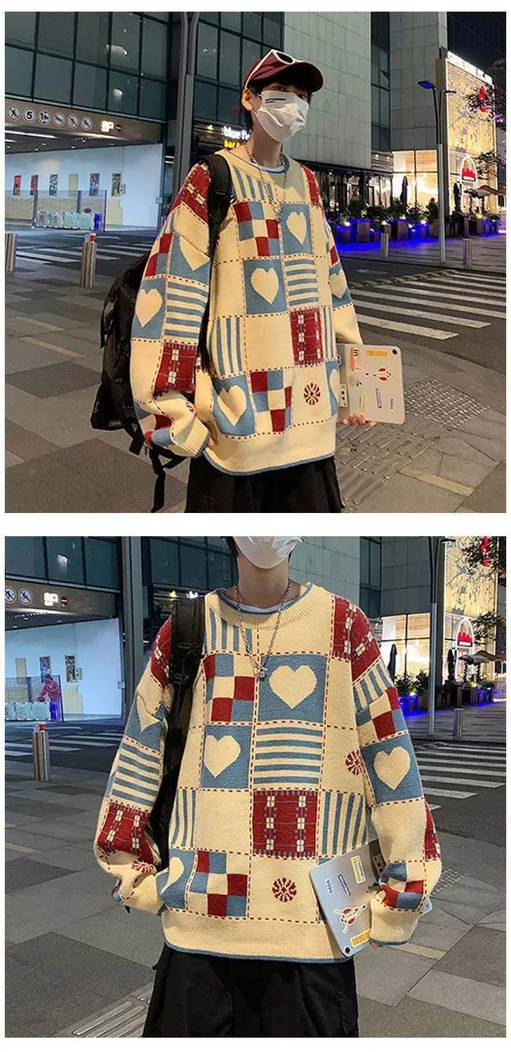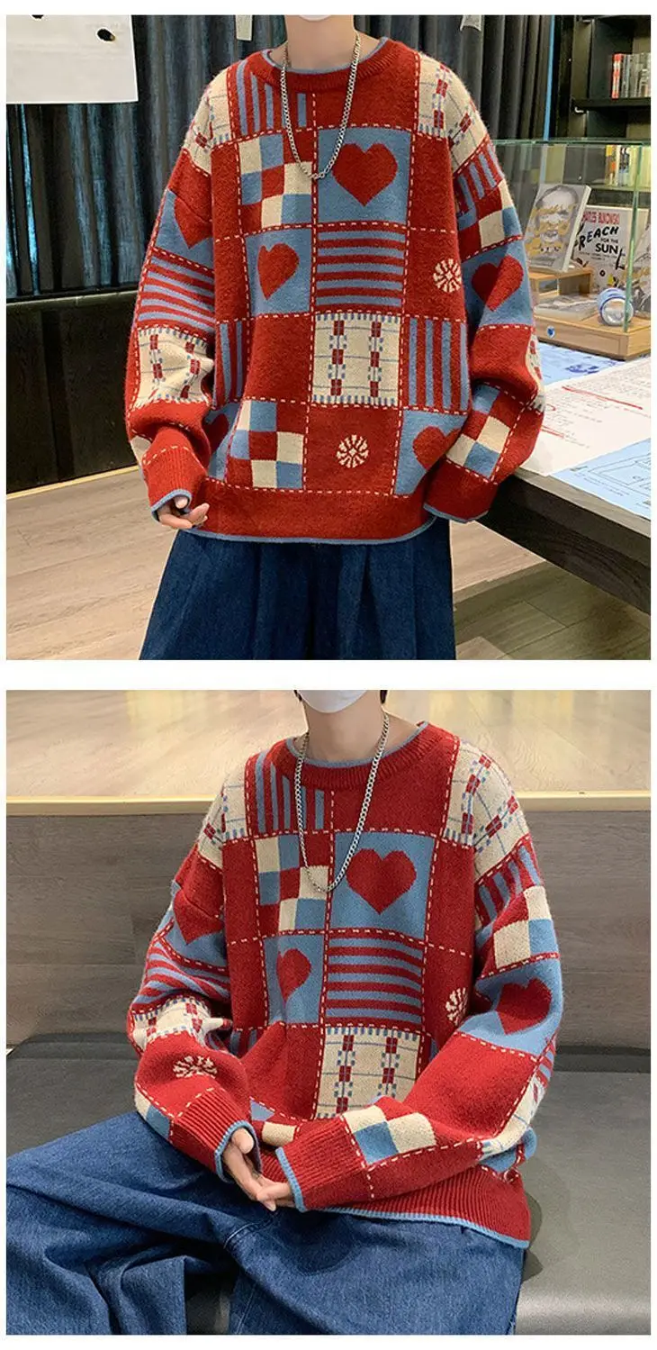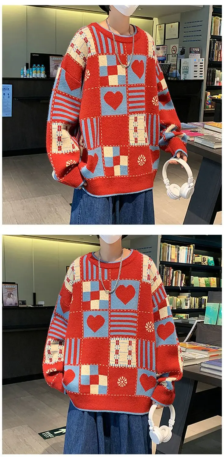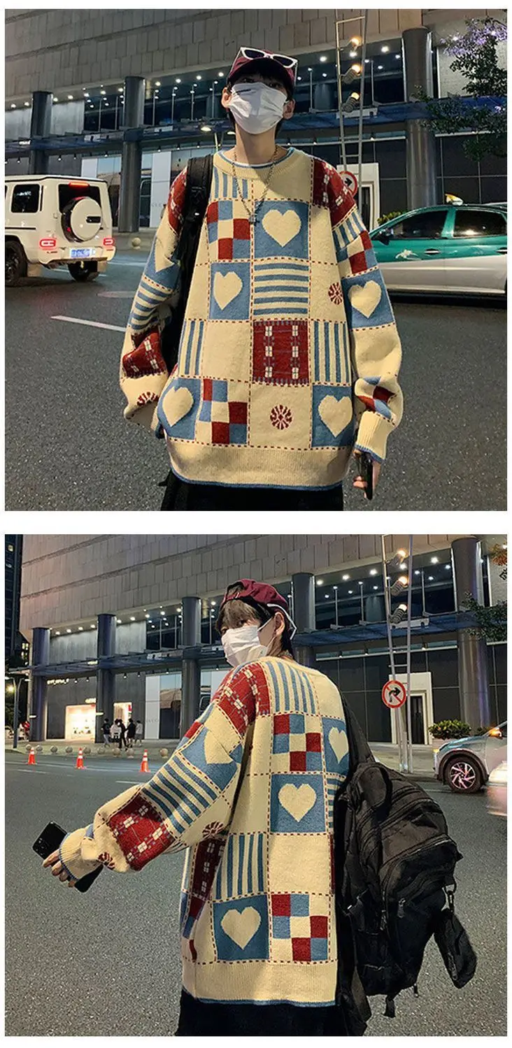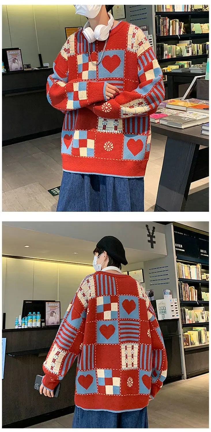 Japanese Retro Contrasting Checkered Heart-shaped Round Neck Sweater Men's and Women's Trendy Brand Loose Fitting Student Couple