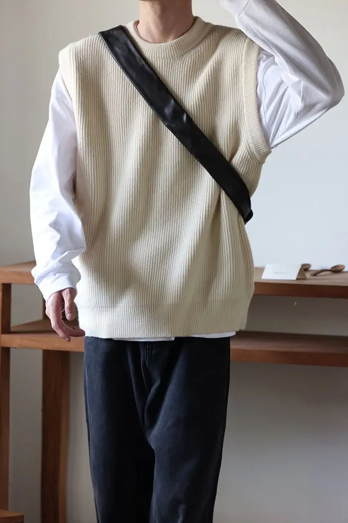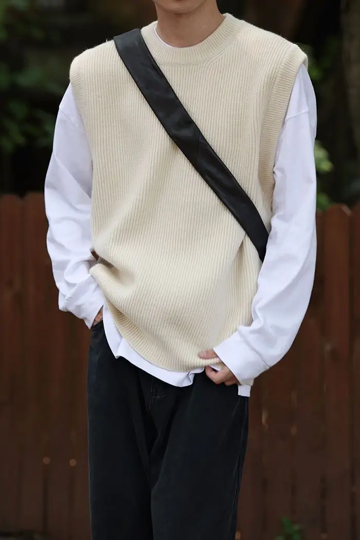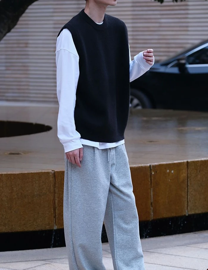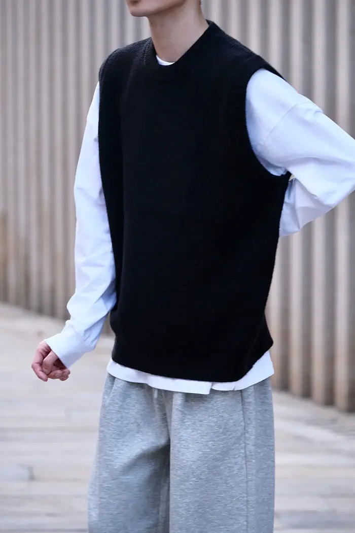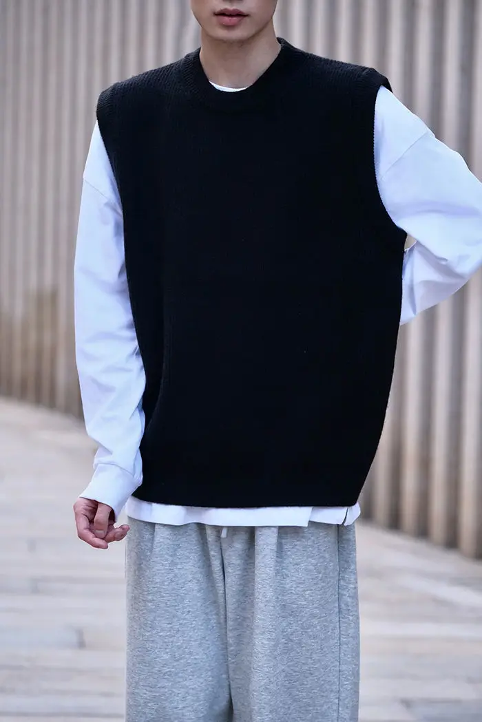 Knit Sweater Male Sleeveless Solid Color Men's Clothing Waistcoat Vest Crewneck Black Round Collar Plain Korean 2024 Autumn Old