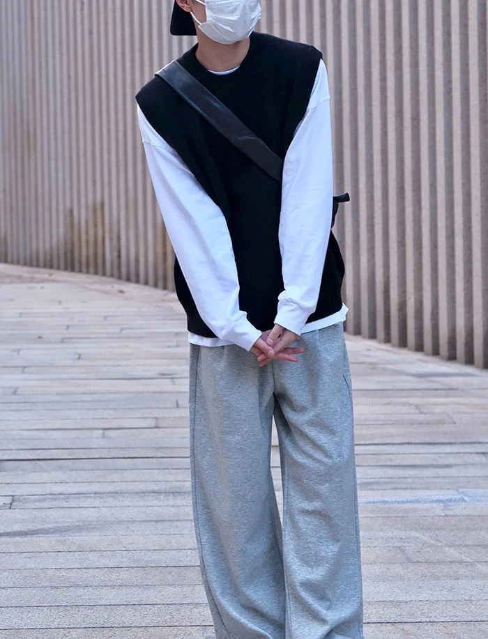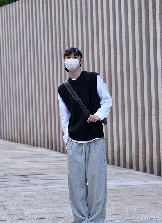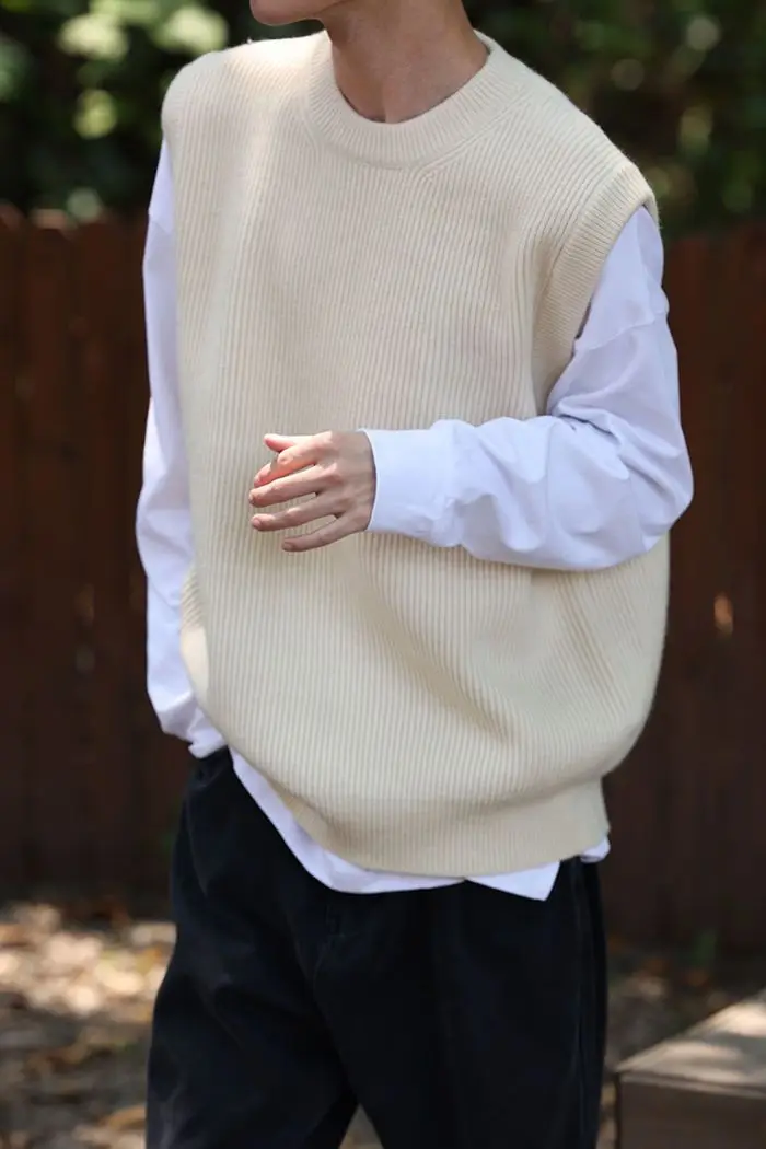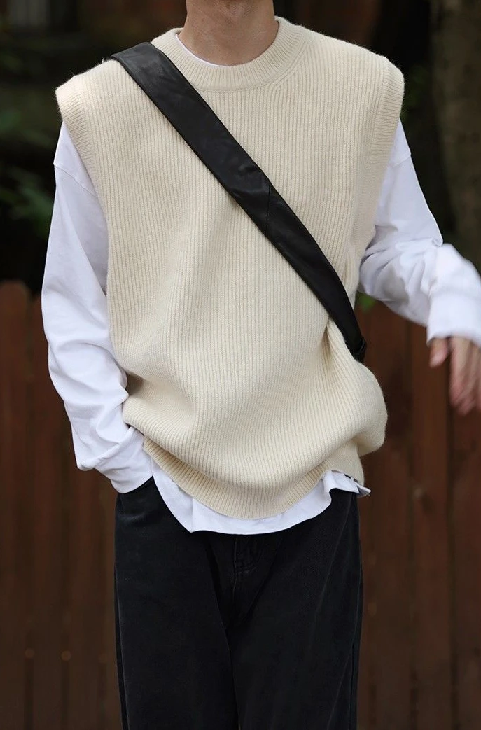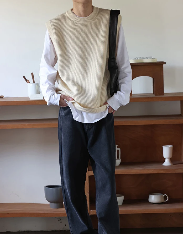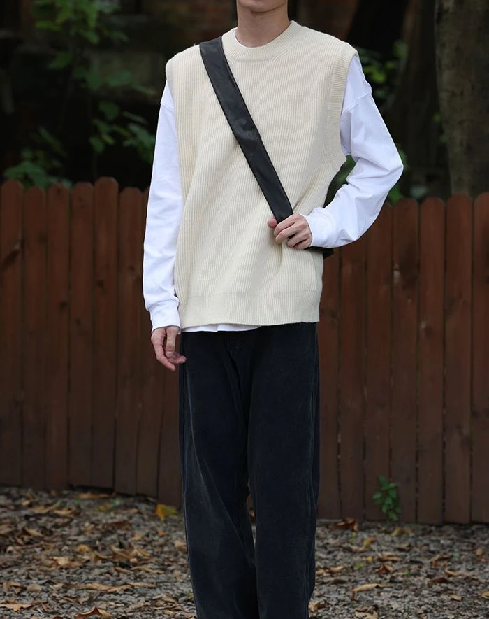 Knit Sweater Male Sleeveless Solid Color Men's Clothing Waistcoat Vest Crewneck Black Round Collar Plain Korean 2024 Autumn Old