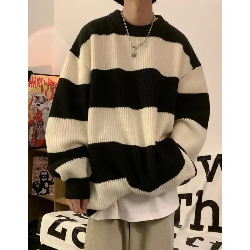 Gotmes Men's Autumn Round Neck Sweater Korean Loose Casual Oversize Knit Pullover Youth Trend Fashion Striped Sweater Men