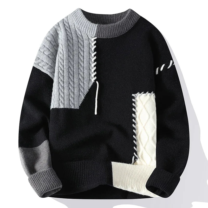 Man Panelled Contrast O-neck Sweater Autumn Winter Vintage Loose Long Sleeves Knitted Pullover Fashion Casual Male Jumper