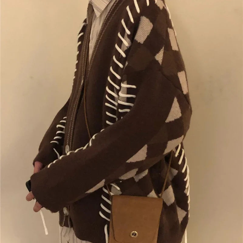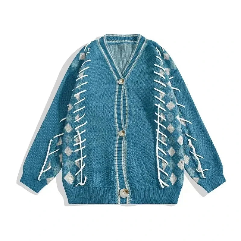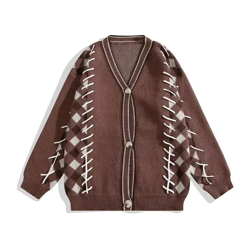 Men Casual Sweater Set Vintage Checkerboard Cardigan+Striped Long Sleeved Shirt+Trendy Wide Leg Pants 3-piece Street Couple Suit