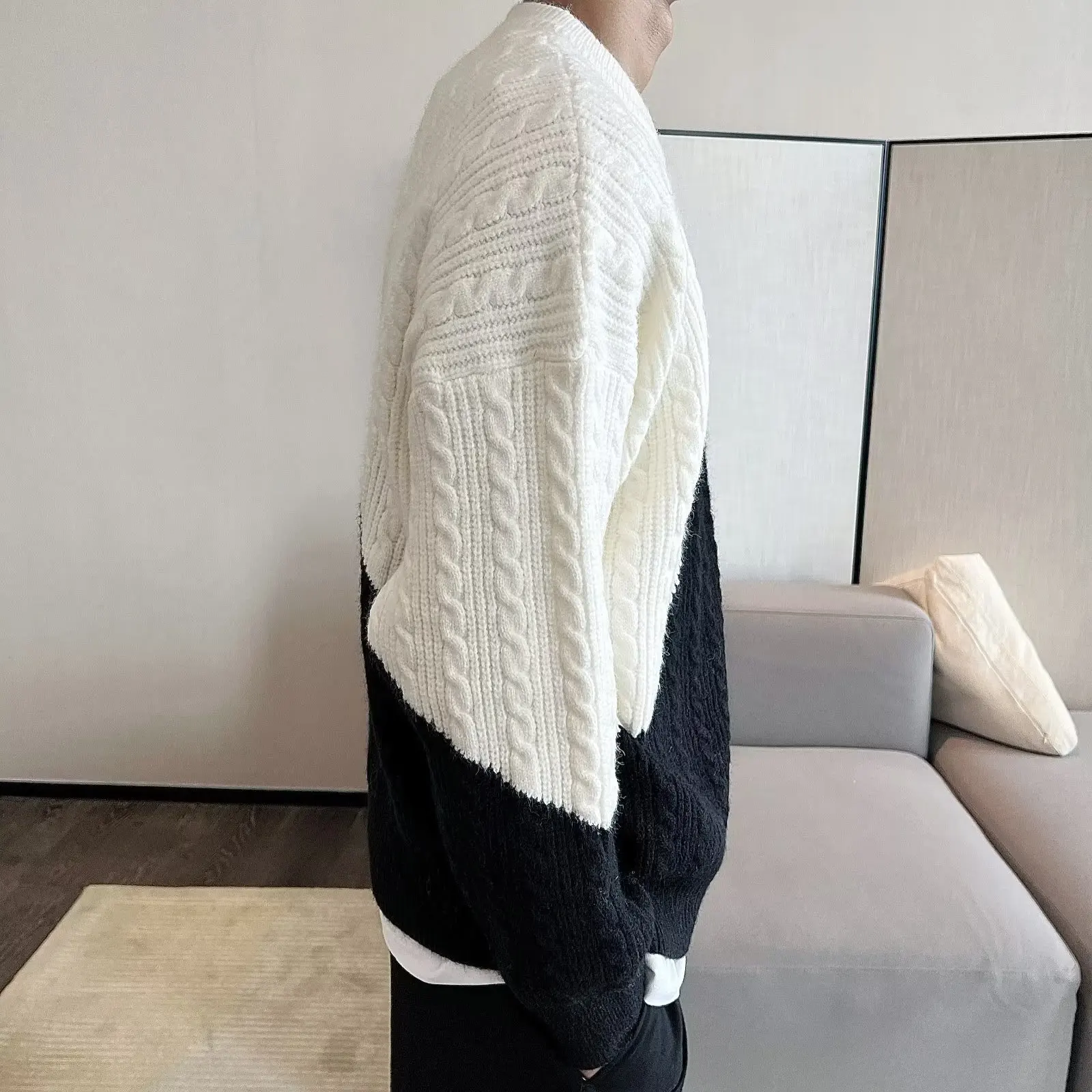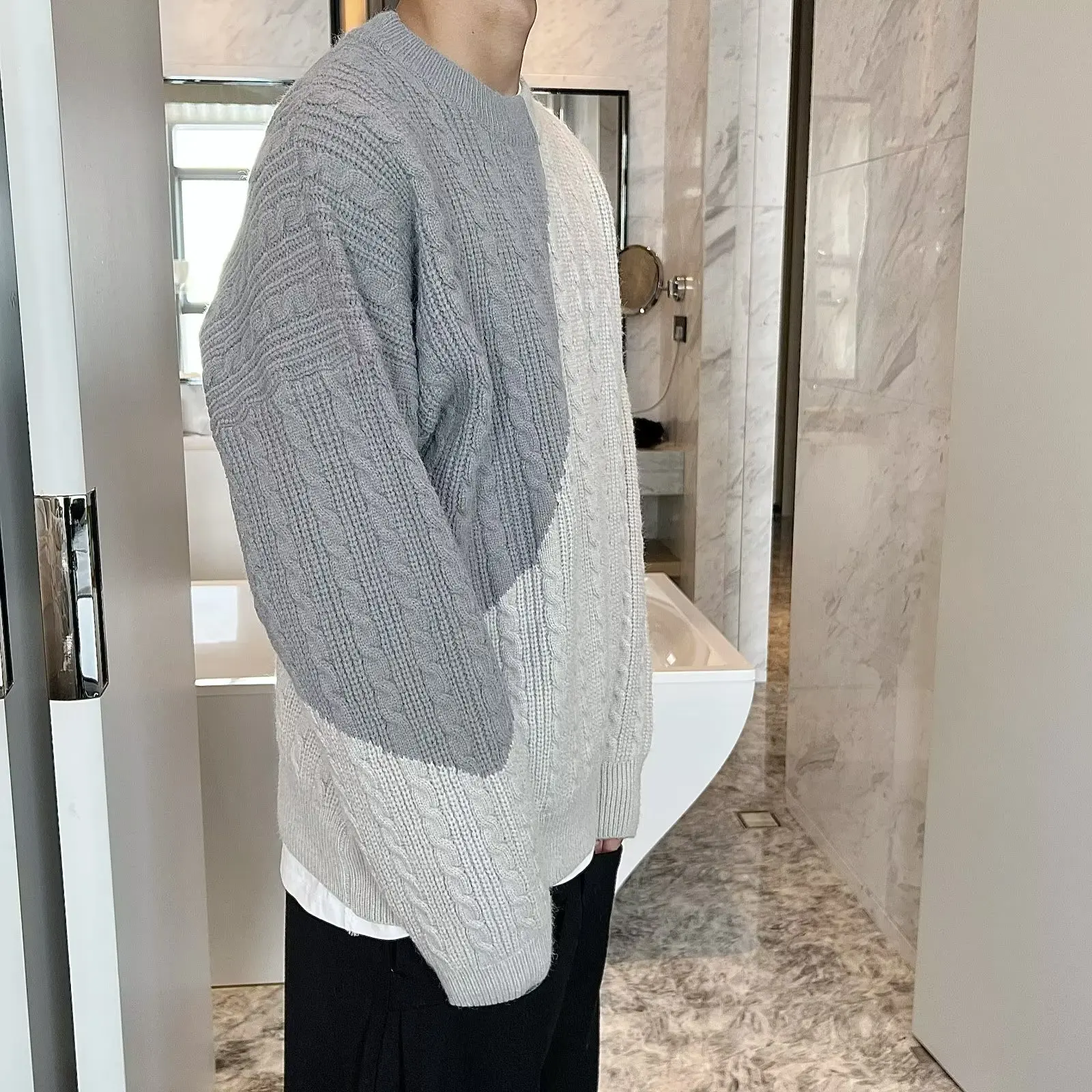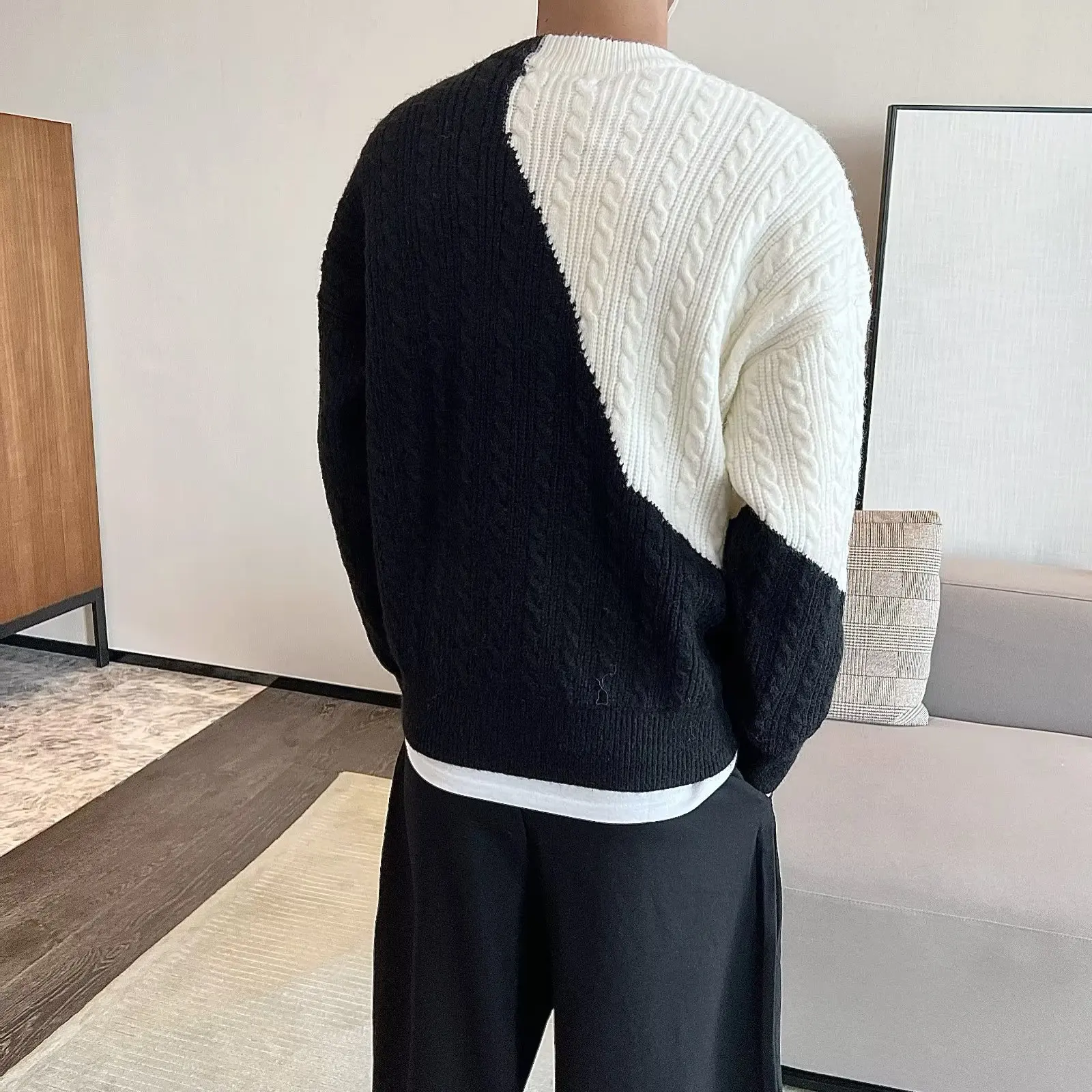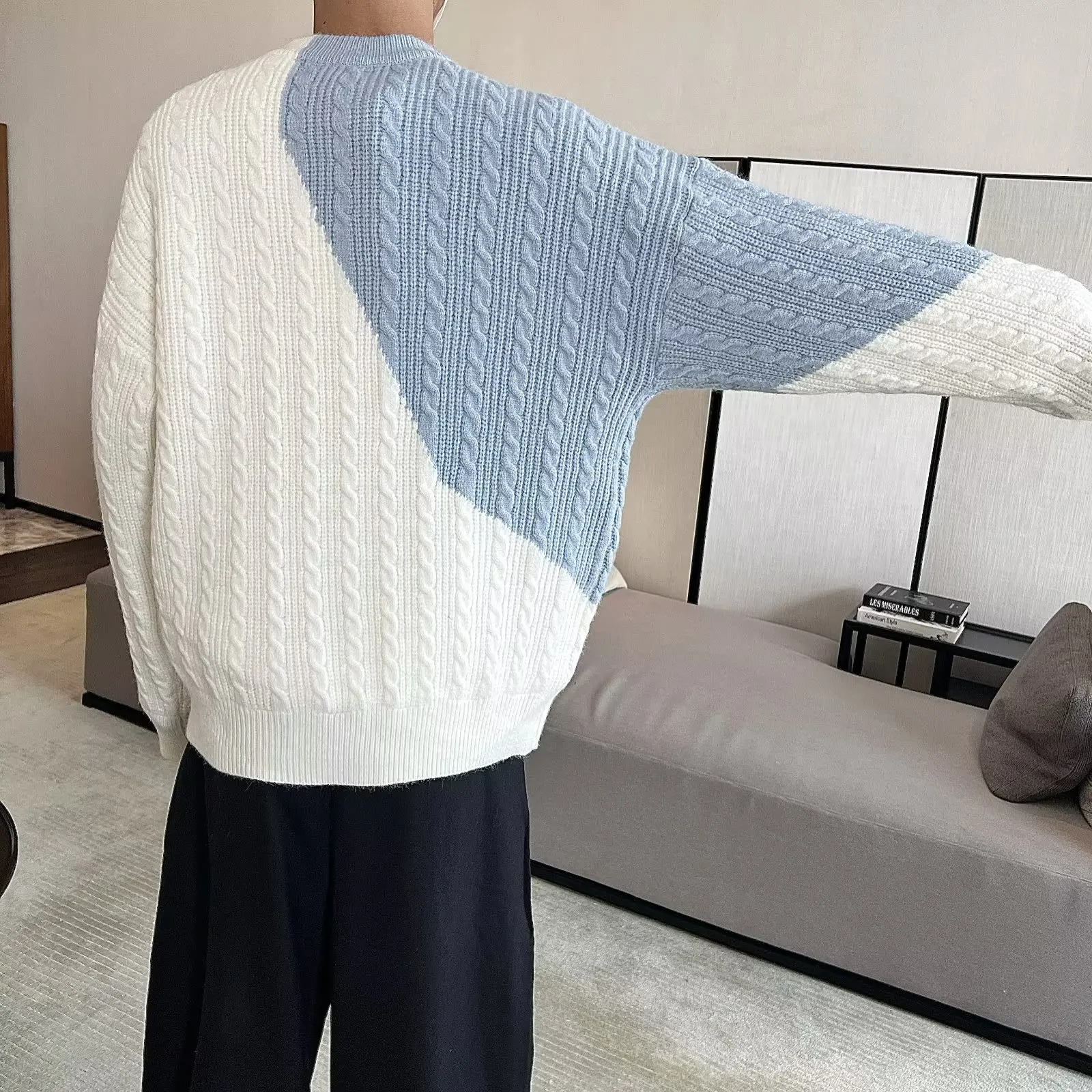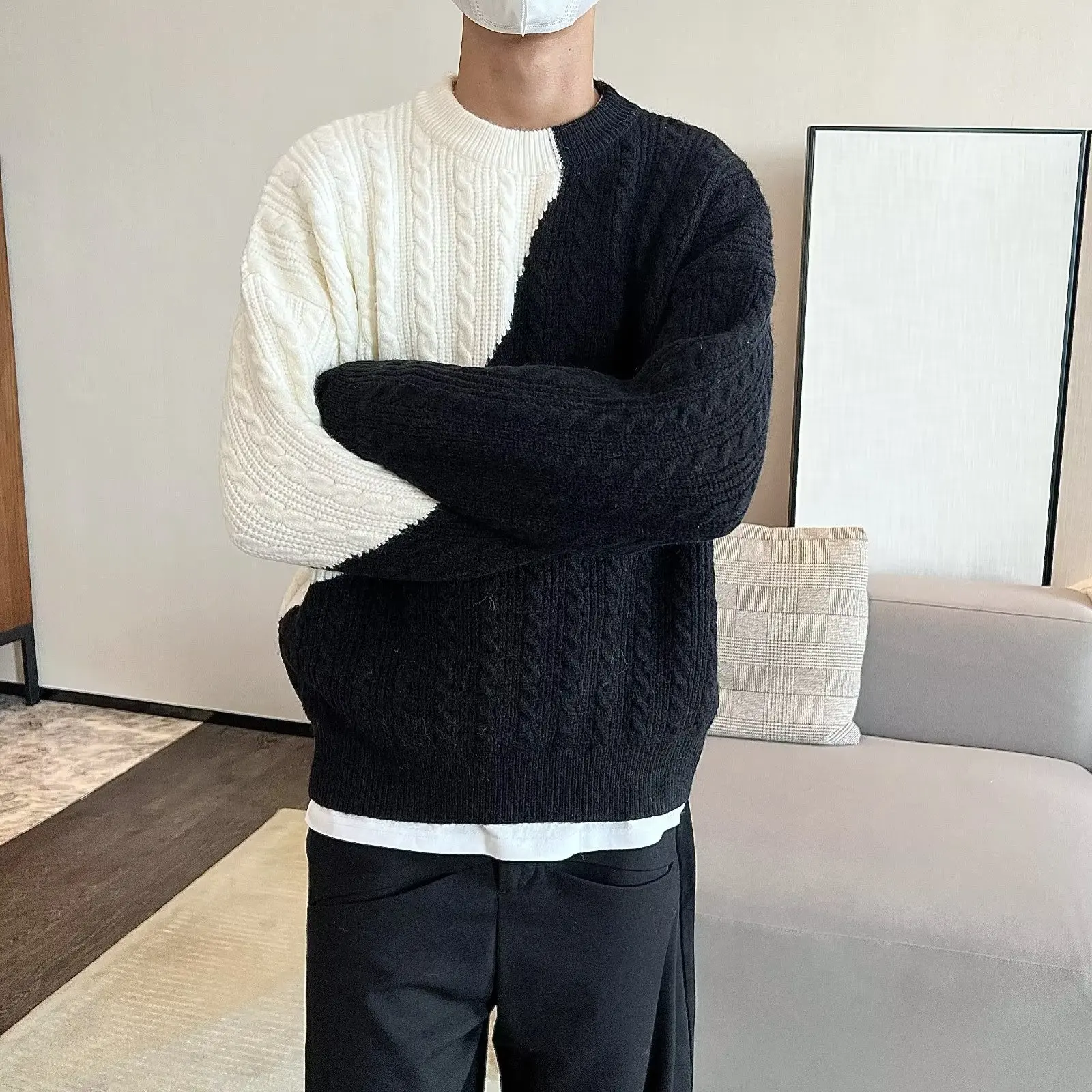 Men's Sweater Color Contrast Round Neck Half High Collar Screw Thread Fashion Solid Slim Casual Knitted Long Sleeve Tops
