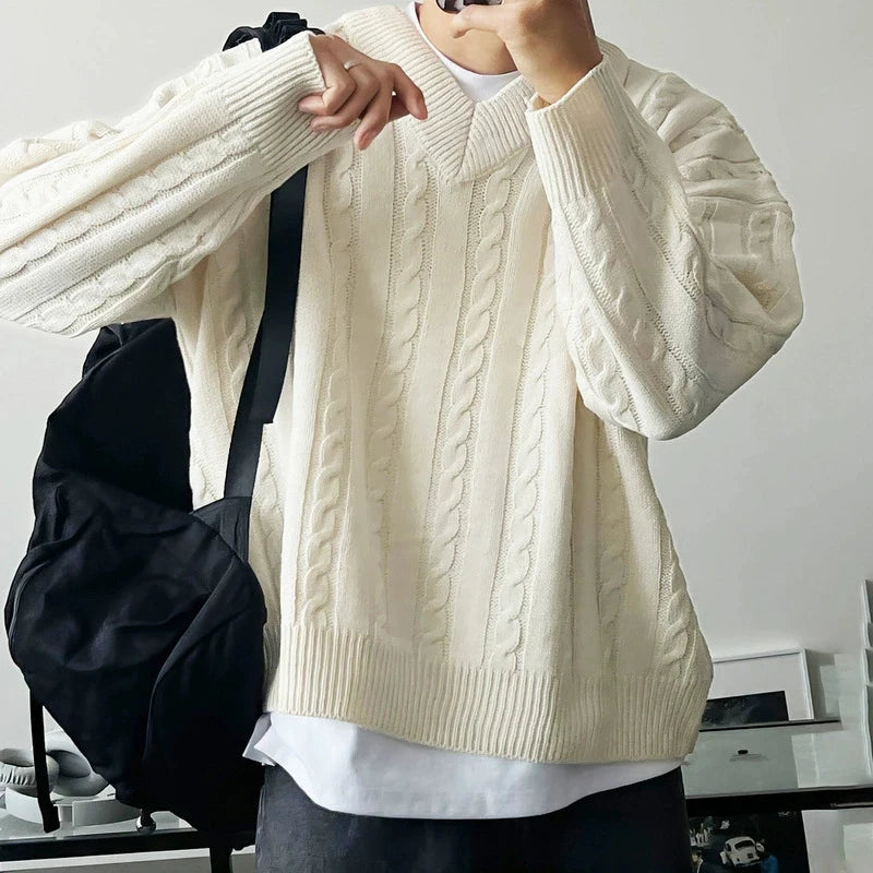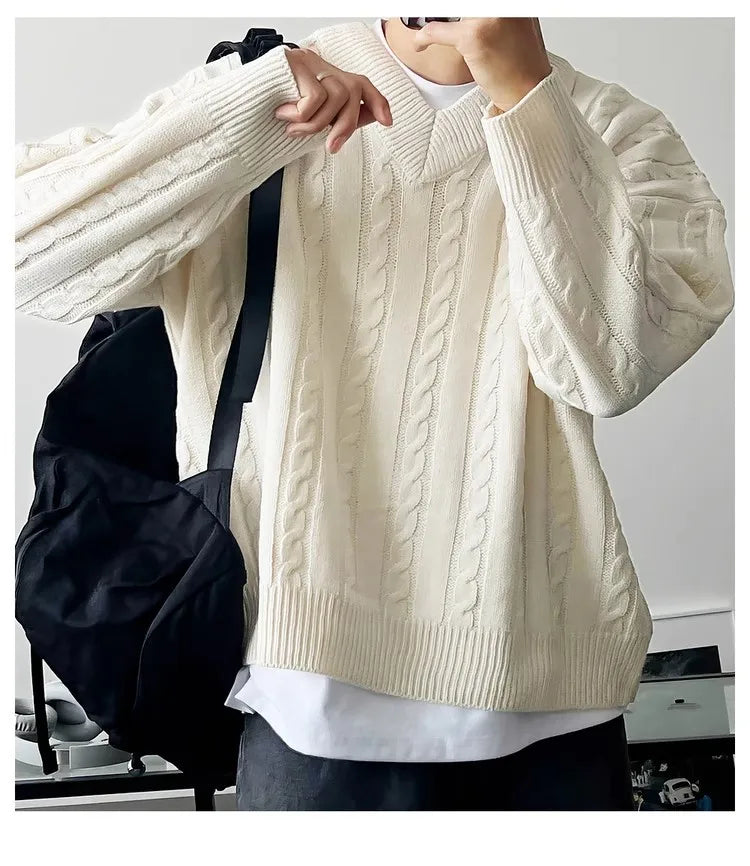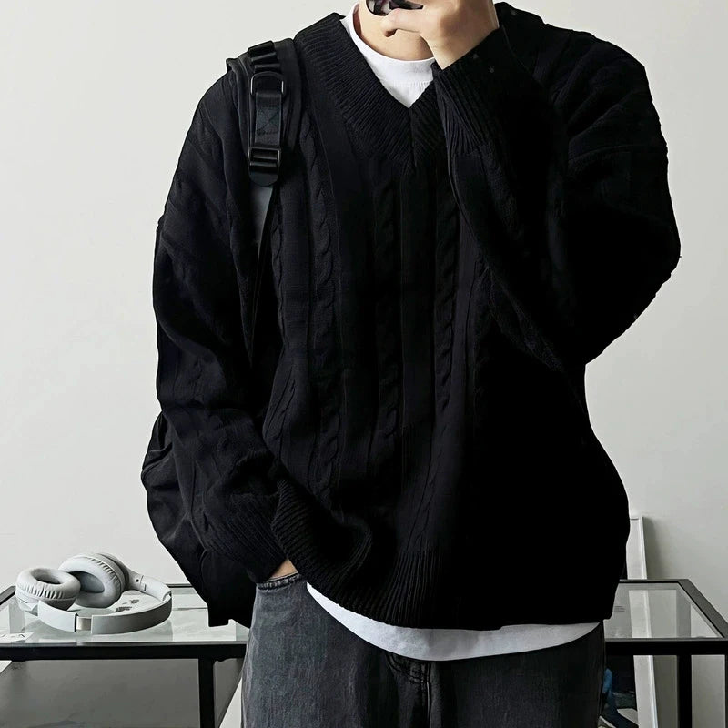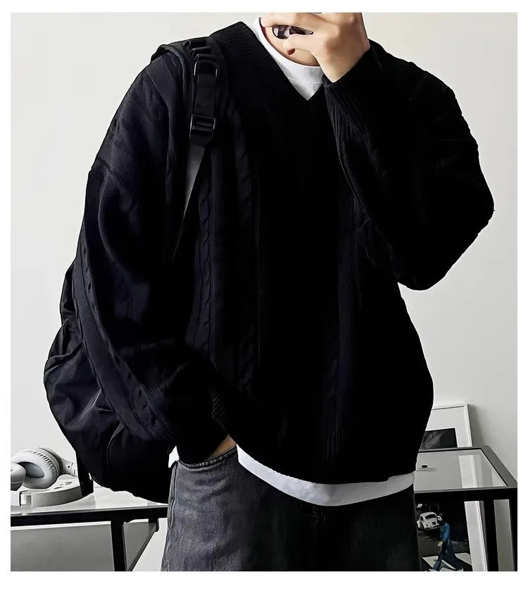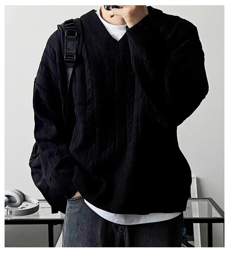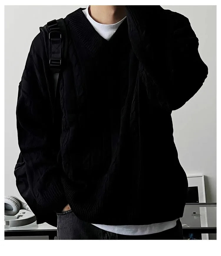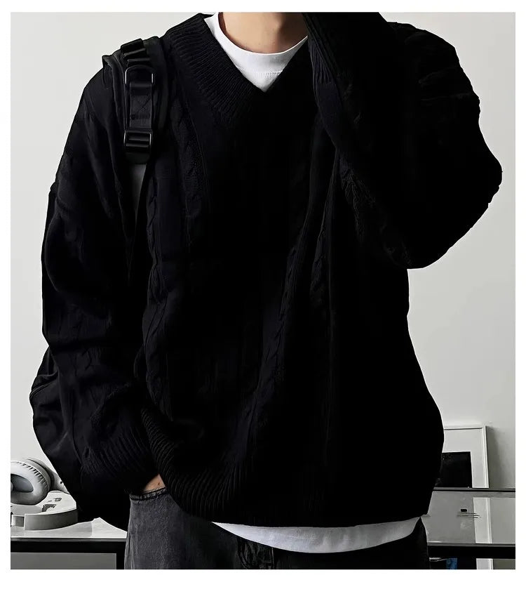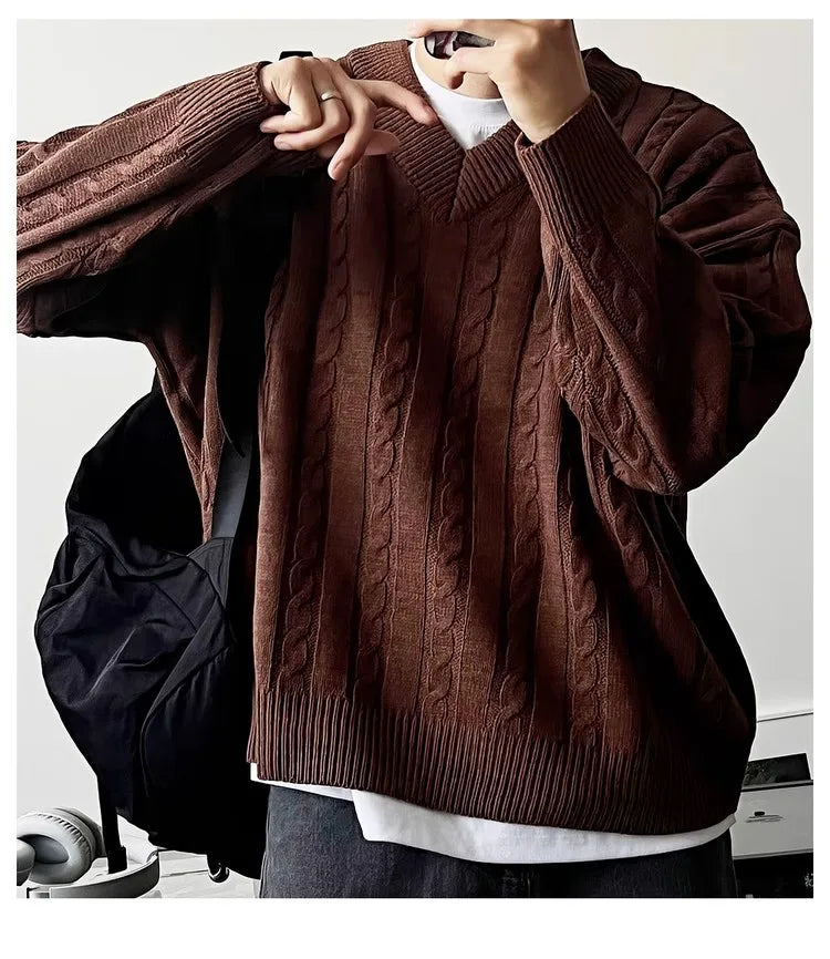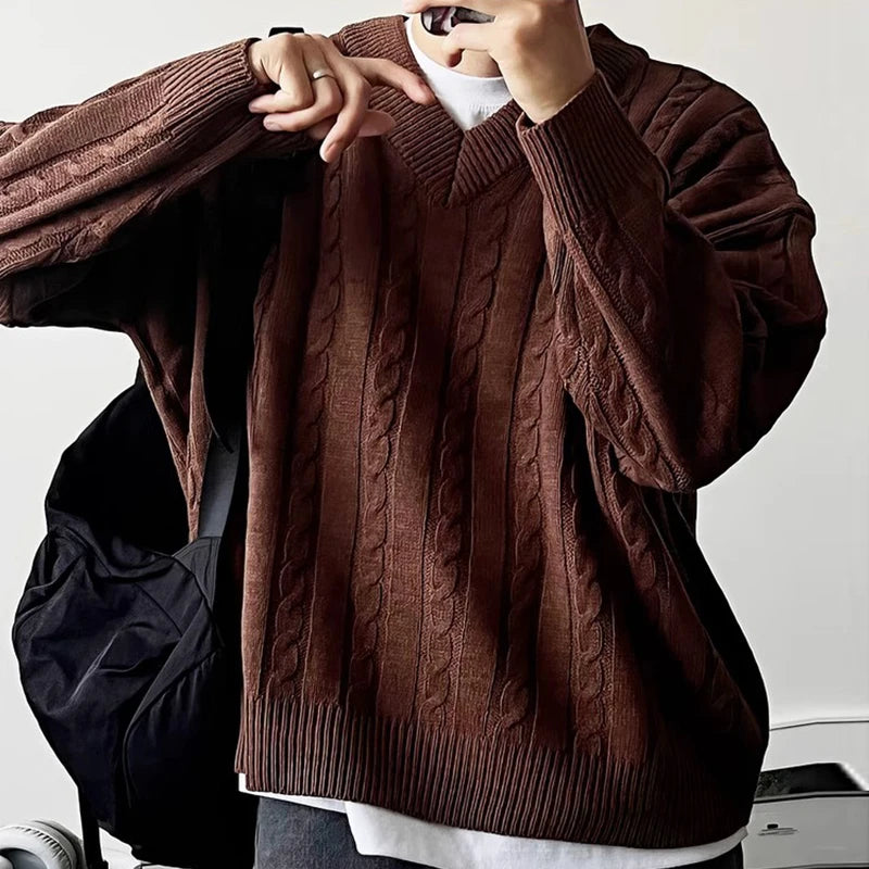 New American Retro Men Jacquarded Sweater Casual V Neck Solid Color Long Sleeve Knitwear Premium Quality Knitted Pullovers M-2XL