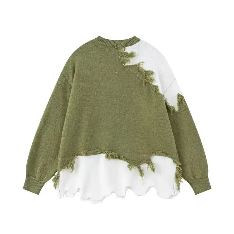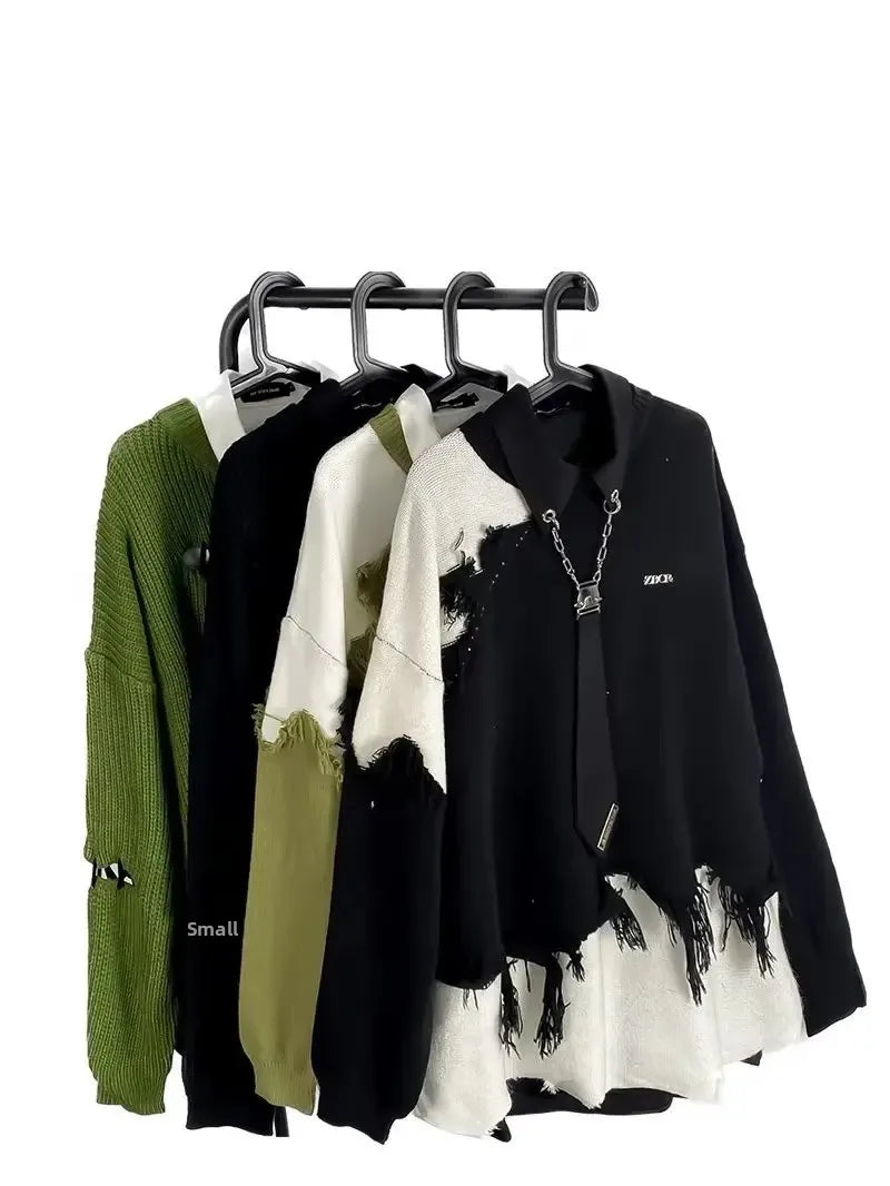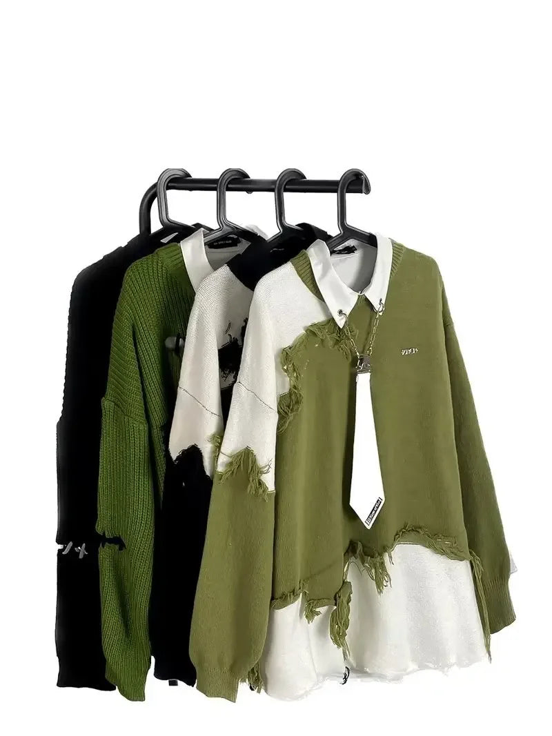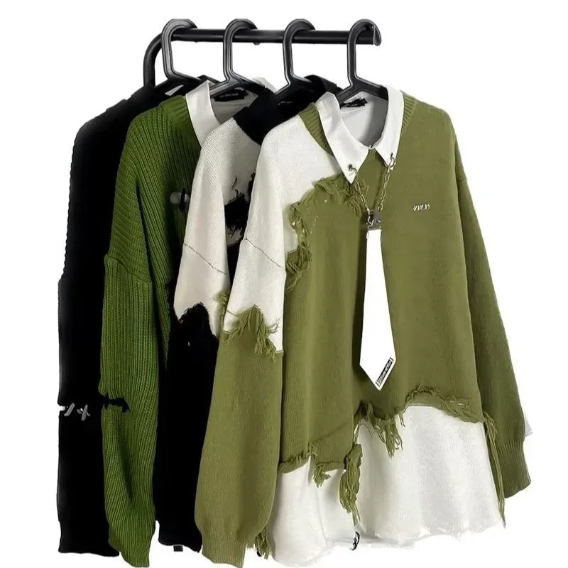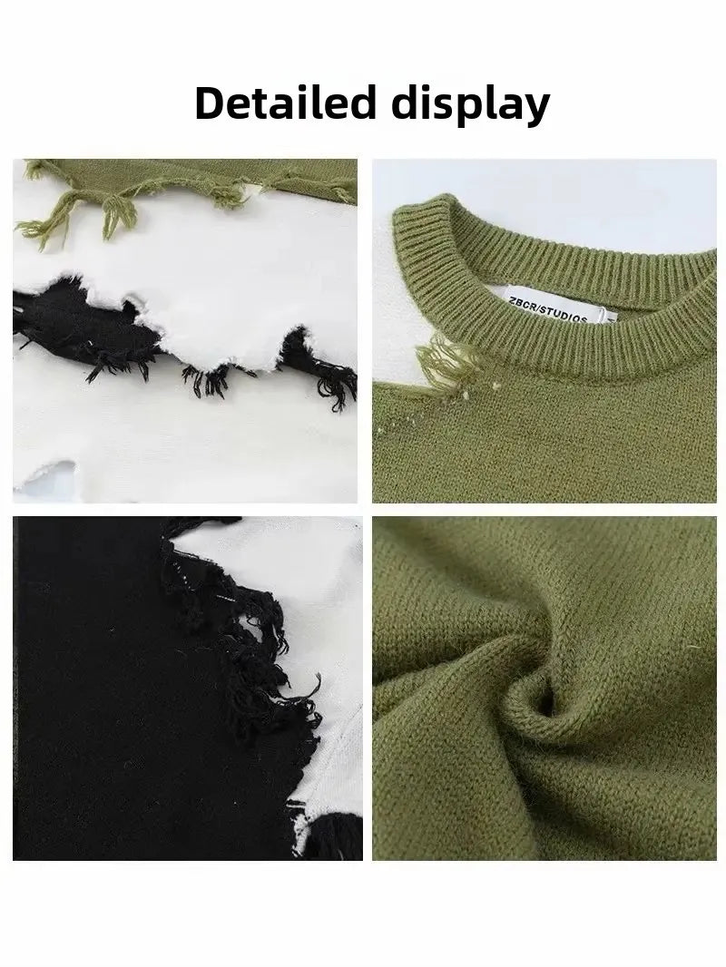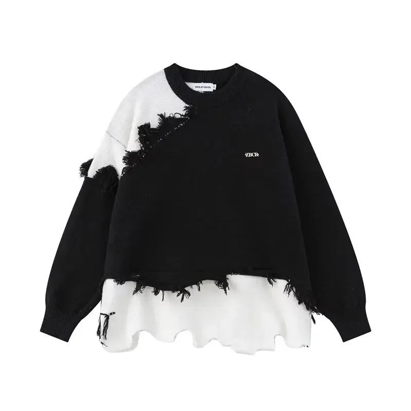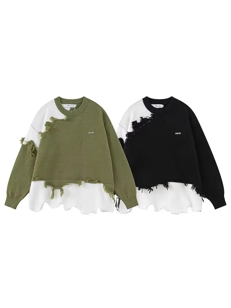Retro Tassel Irregular Men's Sweater Loose American Lazy Style Knitted Shirt Color Block Design Casual Crew Neck Top