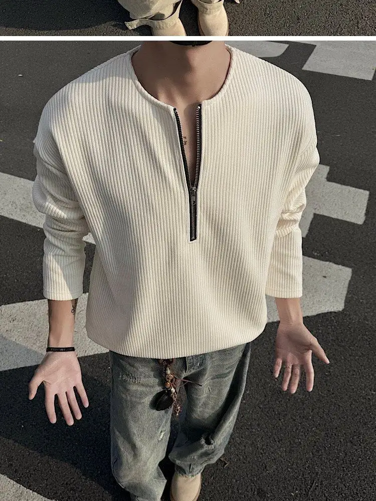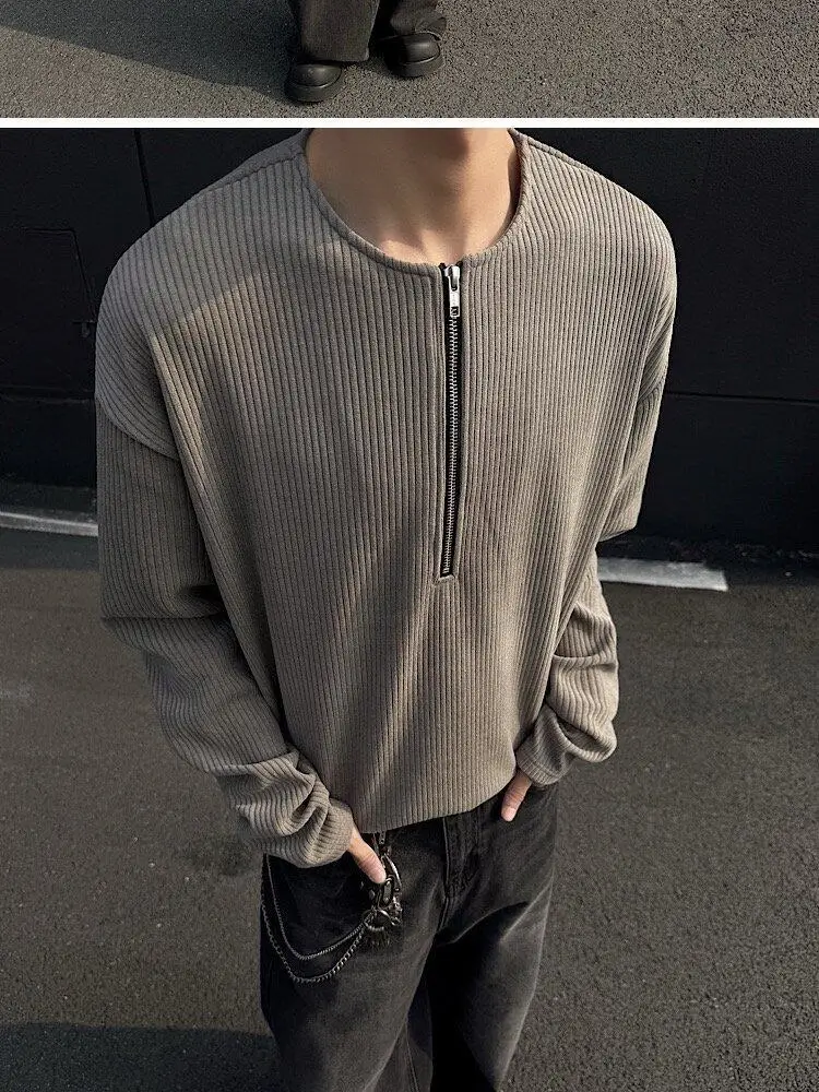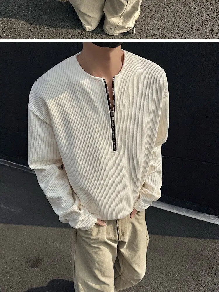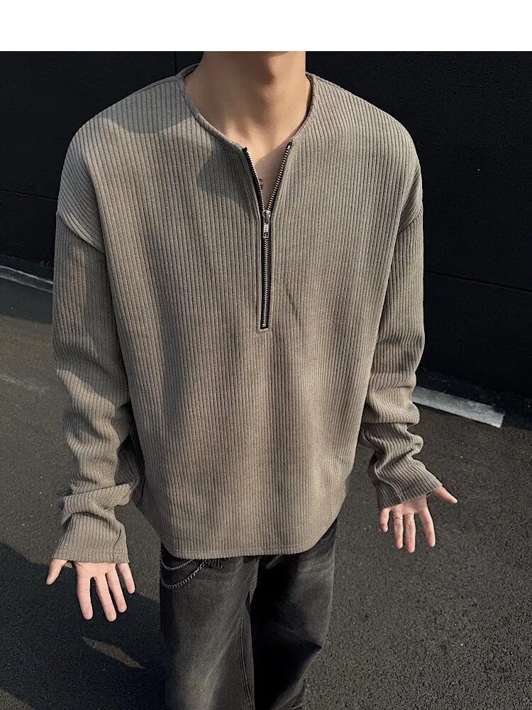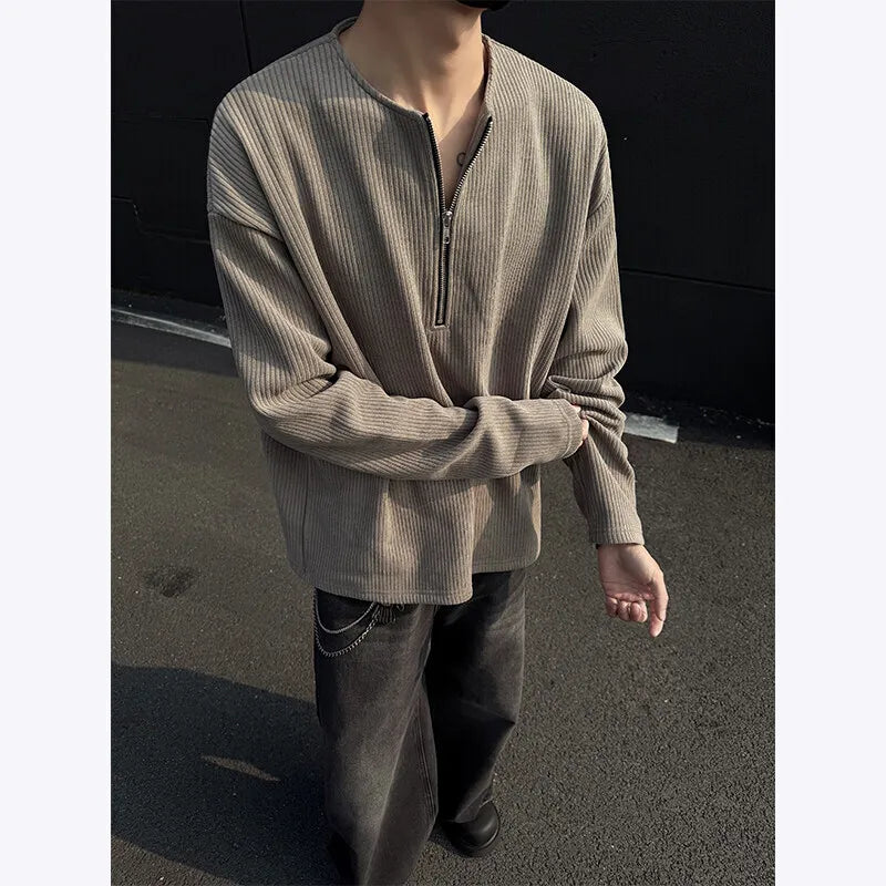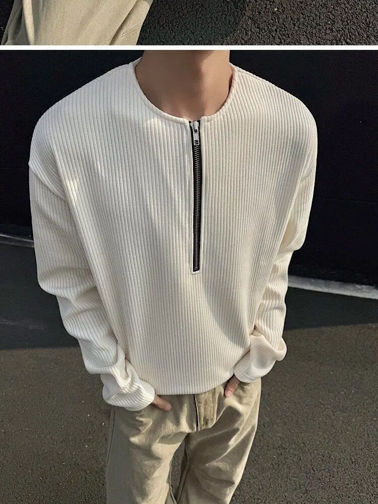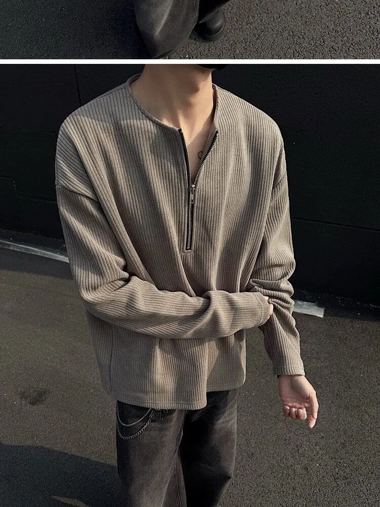 Spring Long Sleeved T-shirt Men Casual Pleated T Shirt Men Streetwear Korean Loose Zipper Pullover T Shirt Mens Sweatshirt