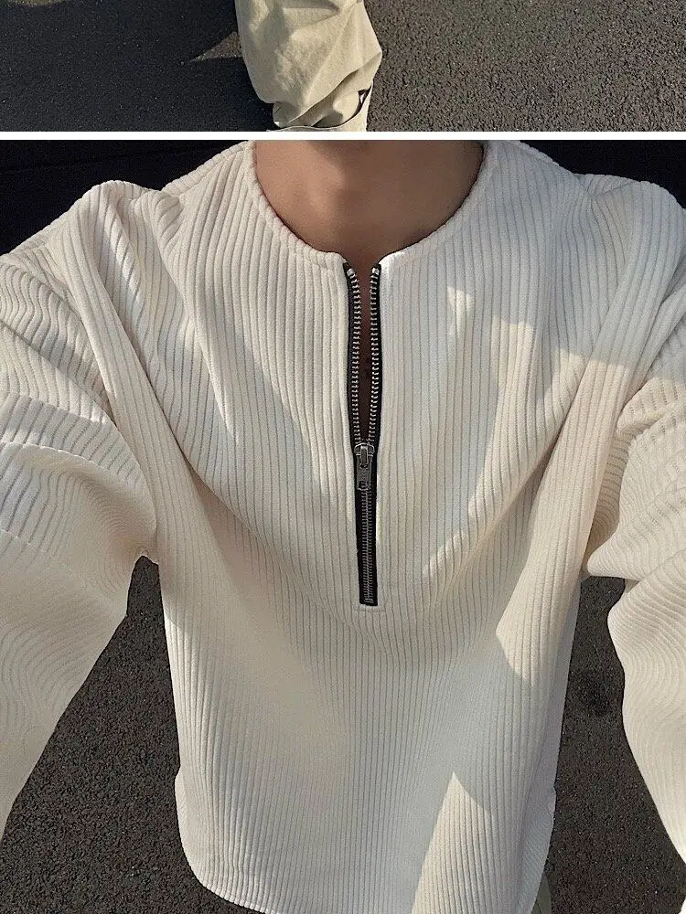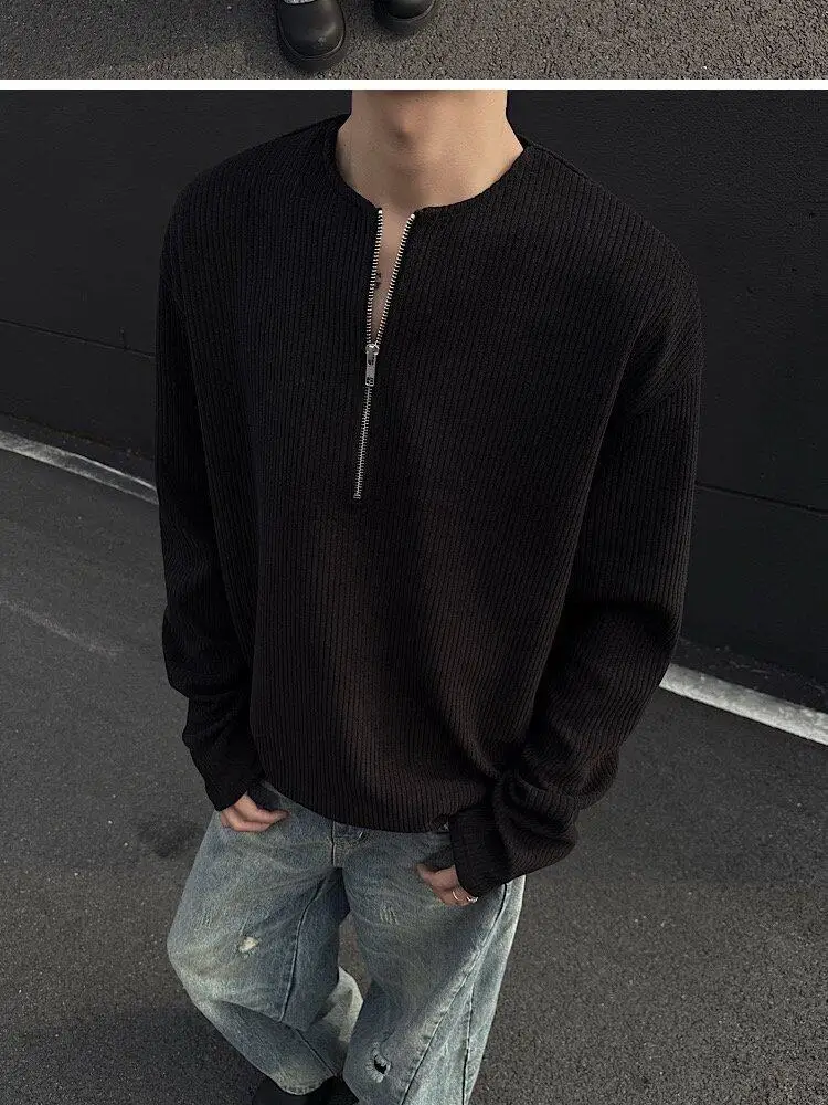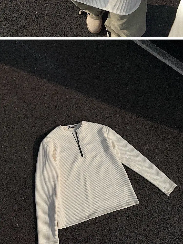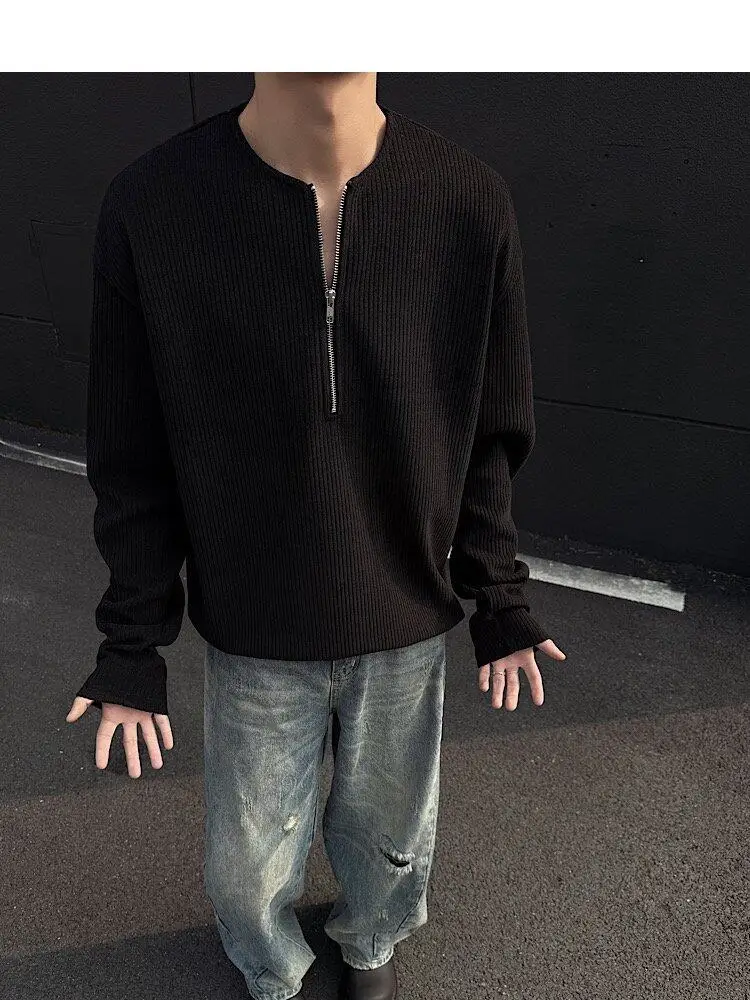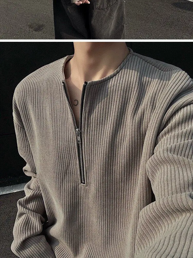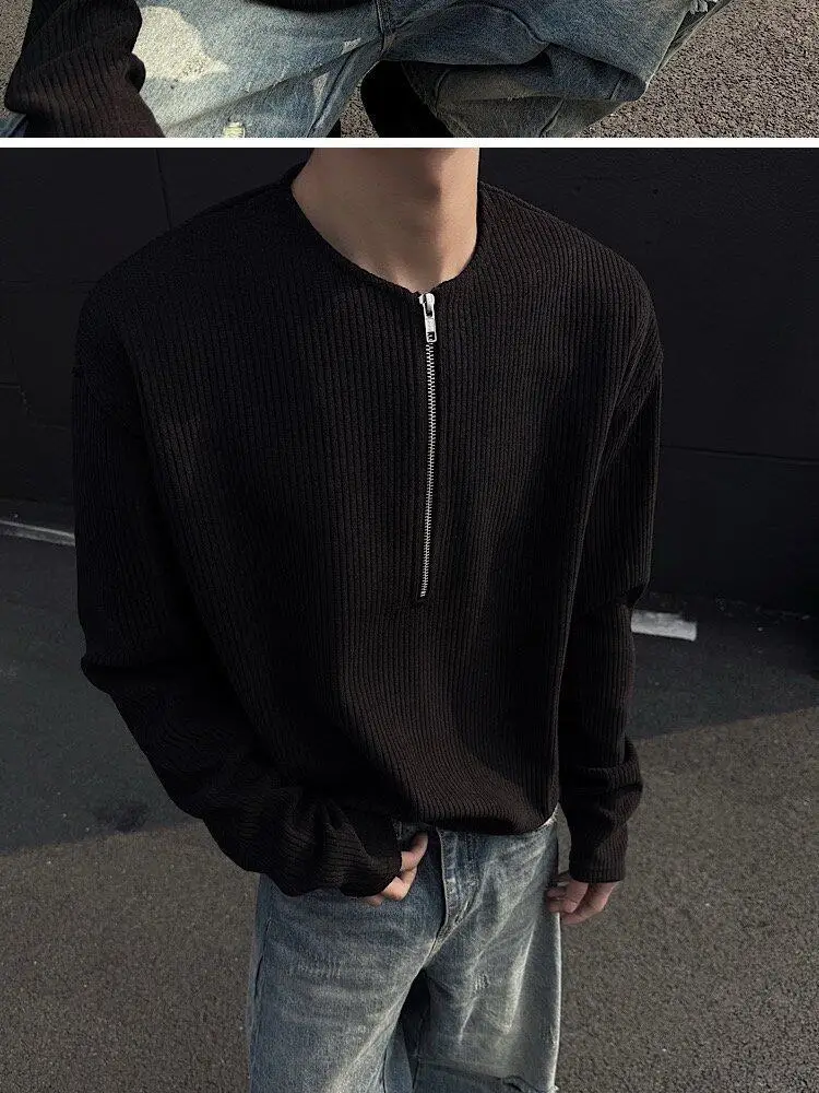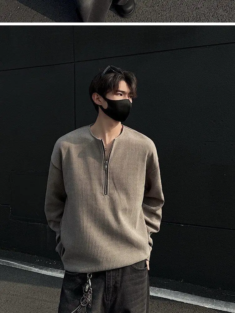 Spring Long Sleeved T-shirt Men Casual Pleated T Shirt Men Streetwear Korean Loose Zipper Pullover T Shirt Mens Sweatshirt
