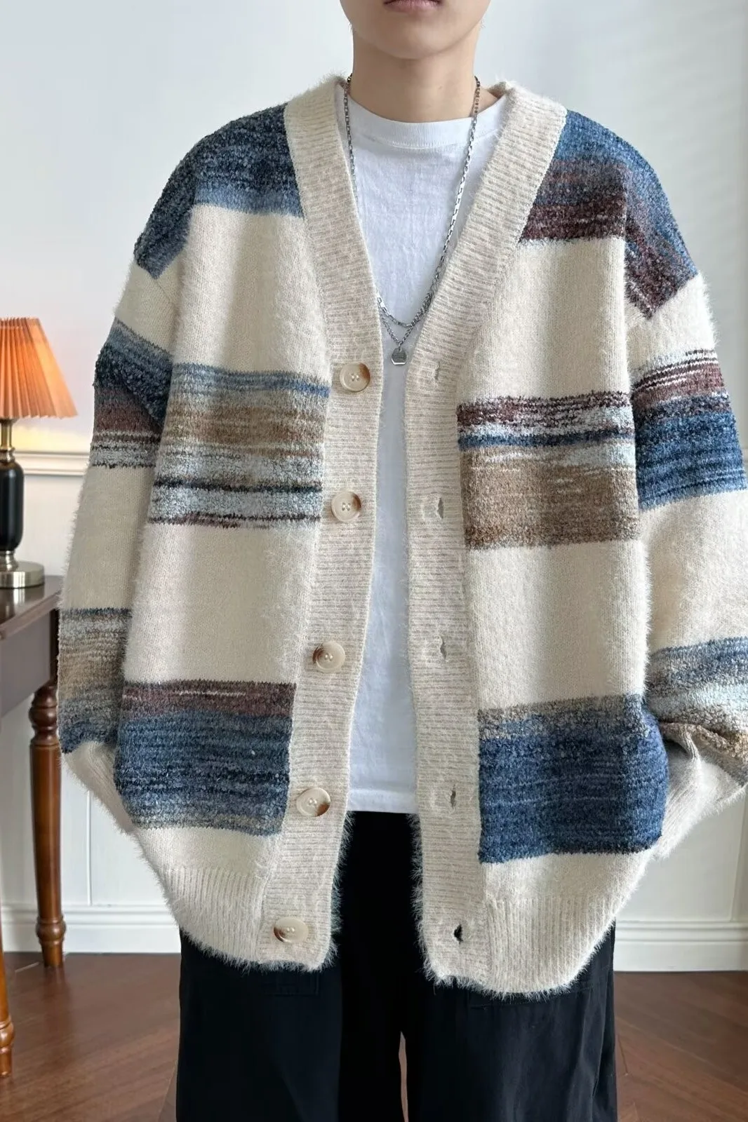 Striped Cardigan Men Chic Baggy Slouchy V-neck Japanese Style Harajuku Vintage High Street Knitting Sweaters All-match Autumn