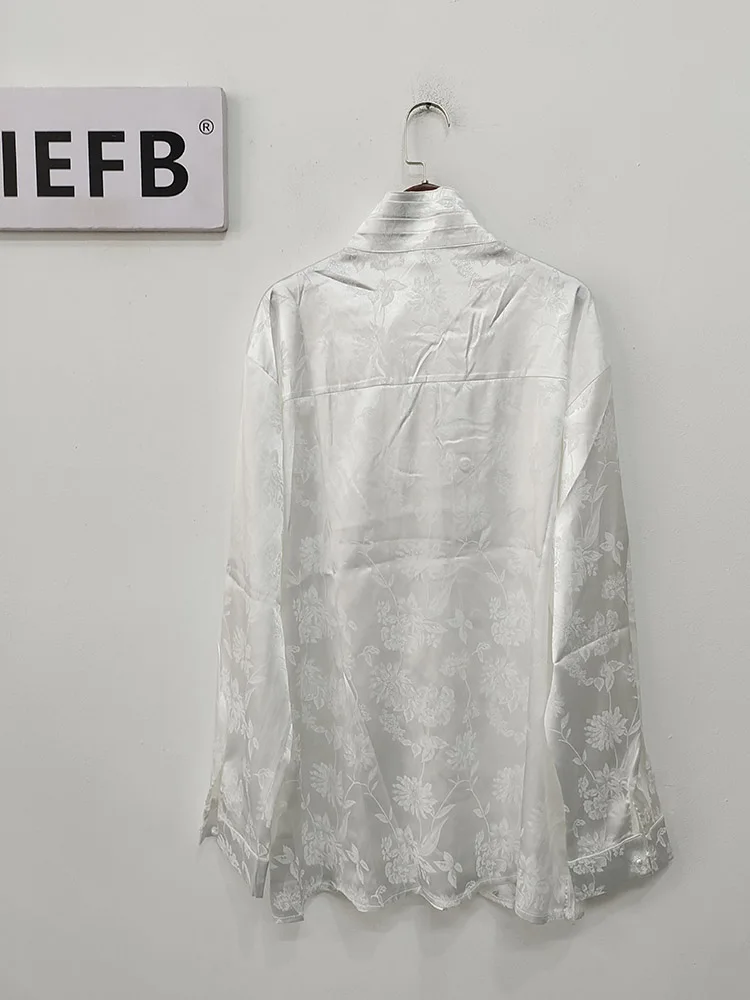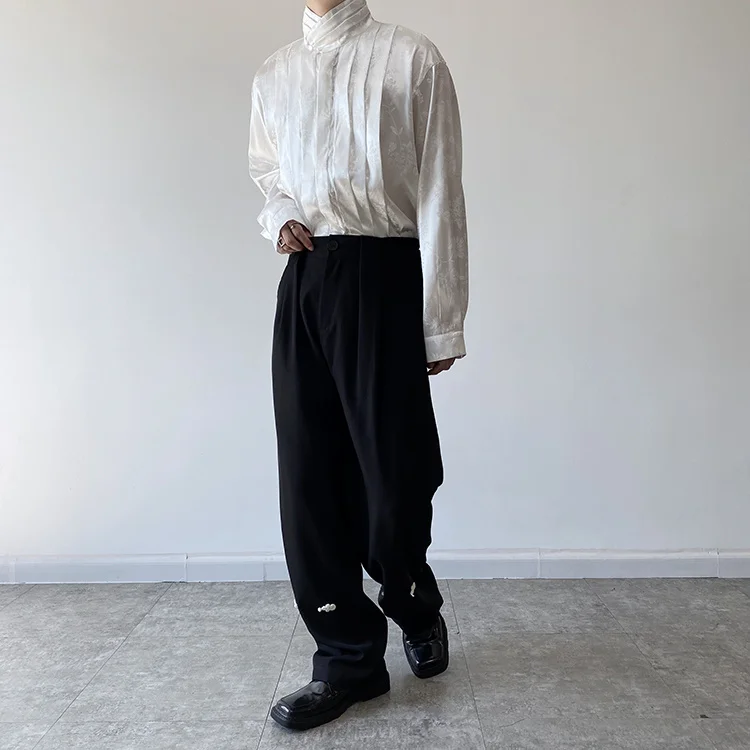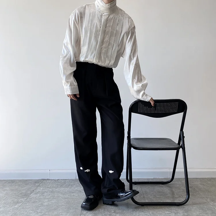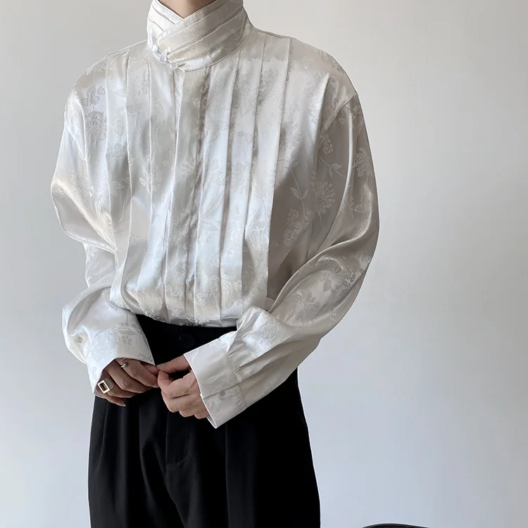 Pleated Stand Collar Jacquard Satin Trend Men's Shirt Long Sleeved Fashionable Autumn Male Tops Solid Color