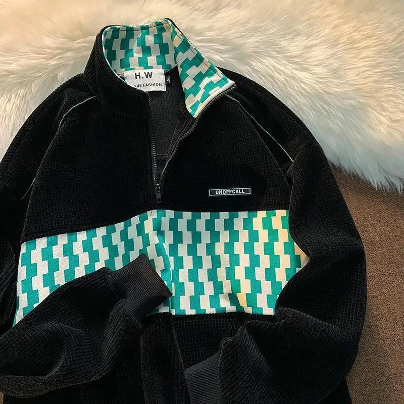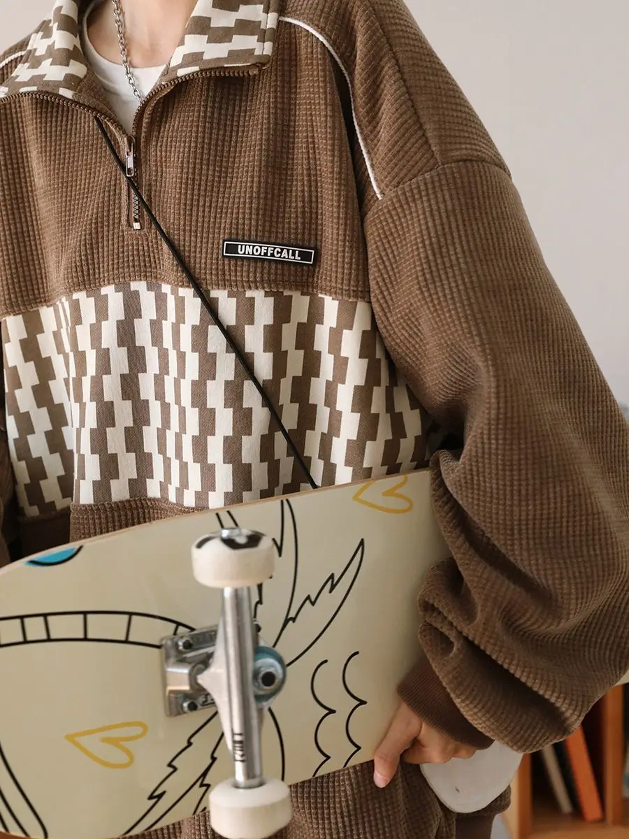 Spring Autumn Patchwork Fashion Plaid Y2K Sweatshirts Man Half Zip Harajuku Pullover Tops Oversized Chic Streetwear Male Clothes