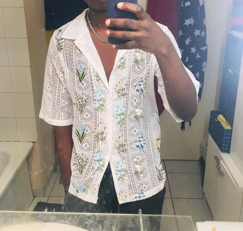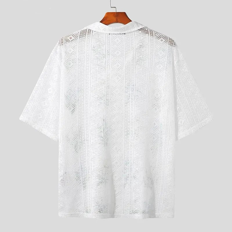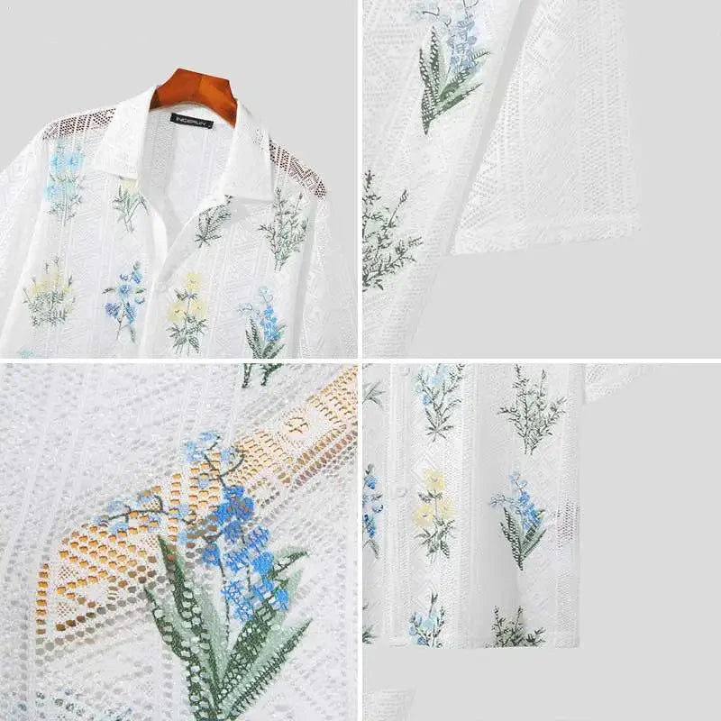 Stylish Casual Style Tops Men's See-through Tracery Printing Pattern Blouse Male Hot Selling Short Sleeved Shirts S-5XL