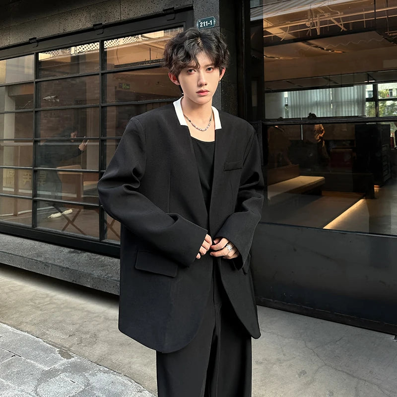 Black/White Men Blazer Collarless Contrast Color Streetwear One Button Long Sleeve Fashion Men Casual Suit Jacket 3XL-M