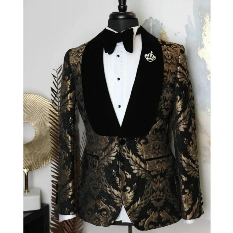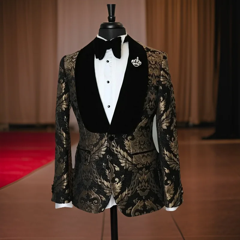 Floral Male Blazer for Men Suit Slim Fit Shawl Lapel Velvet Smoking Jacket 1 Piece Jacquard Fashion Coat