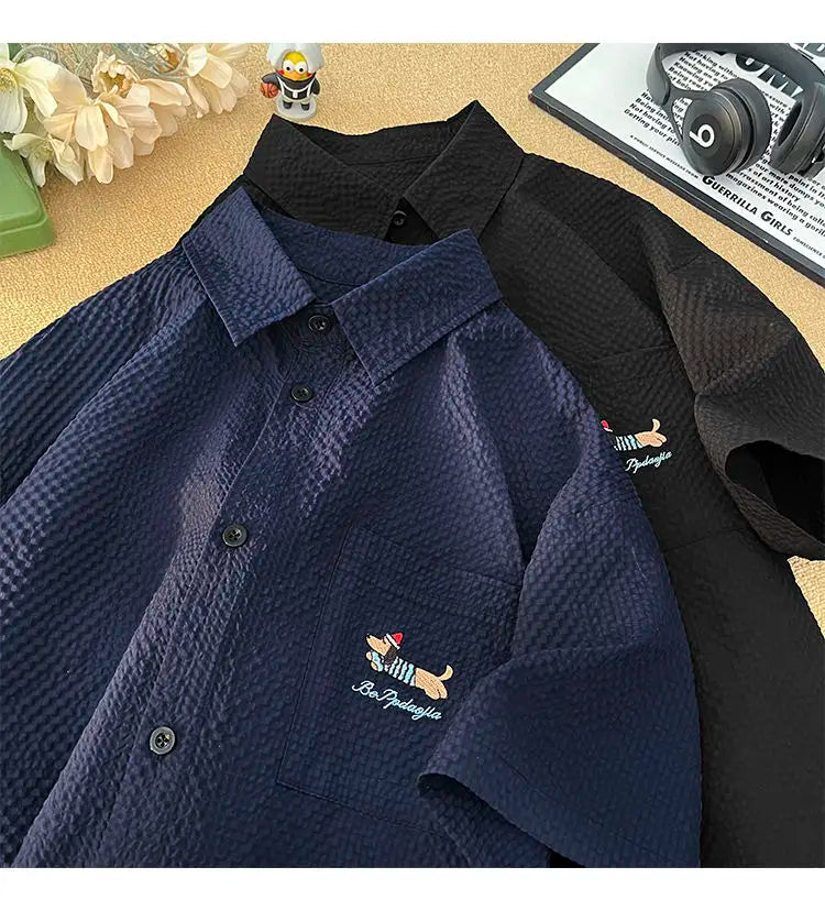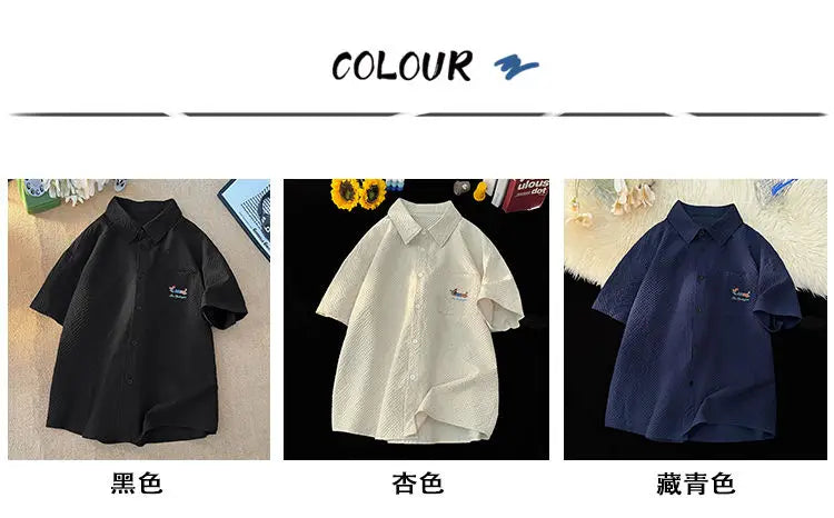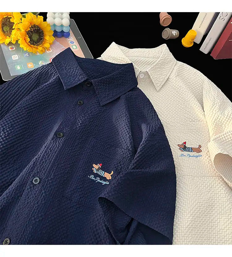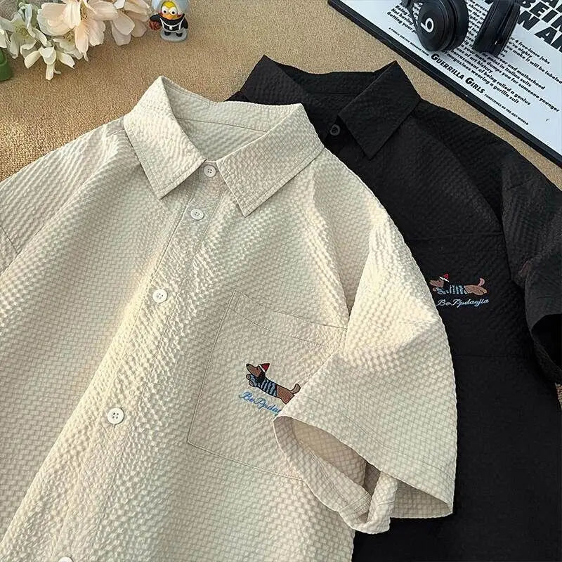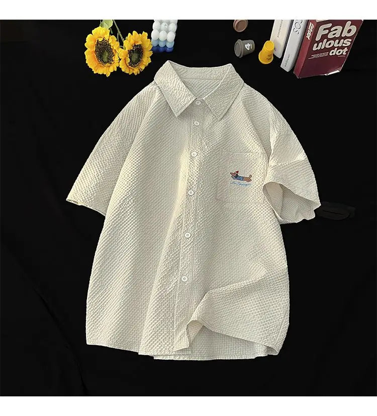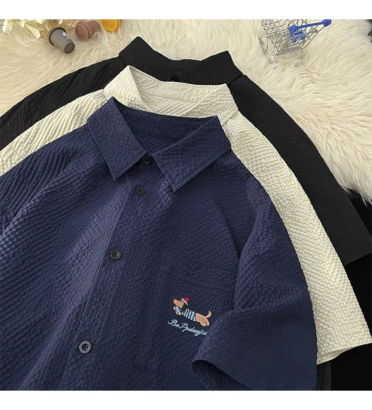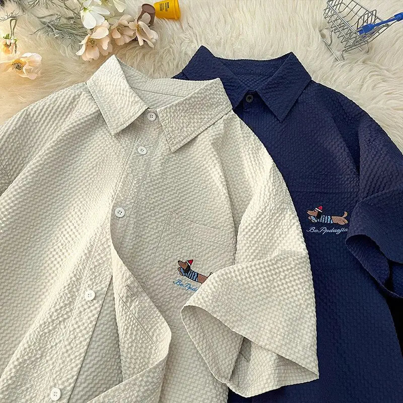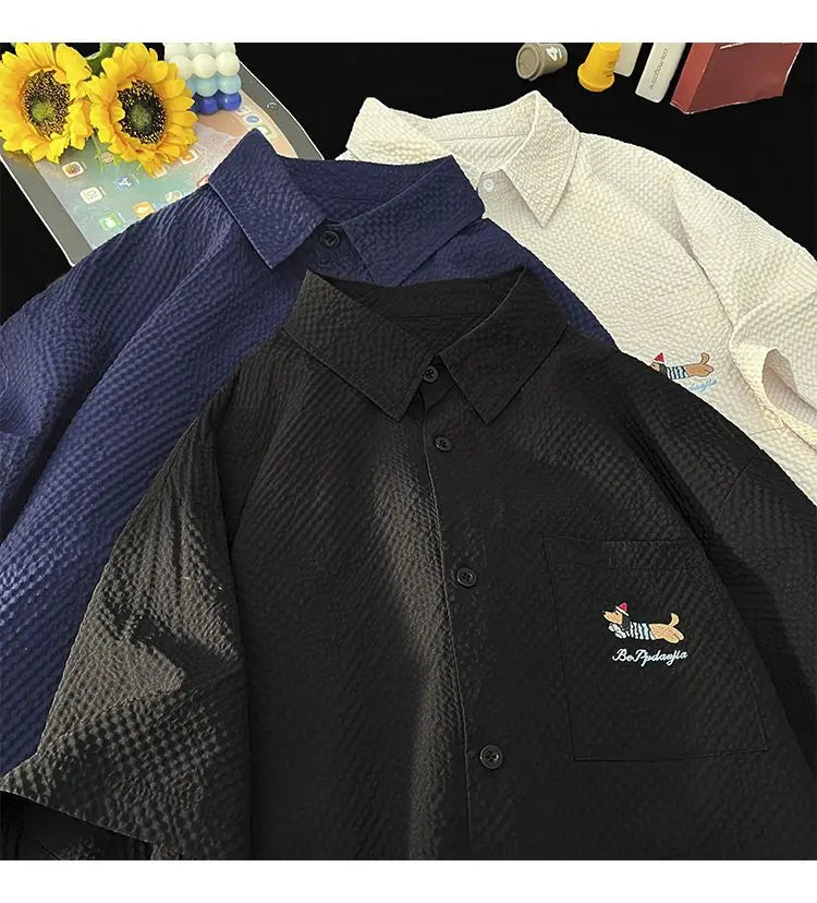 Gmiixder Bubble Yarn Embroidered Shirt Short-sleeved Summer Thin Breathable Quick-drying Beach Shirt Couple Half-sleeved Jacket