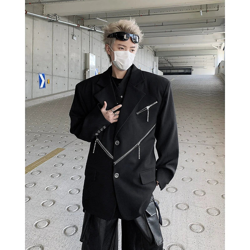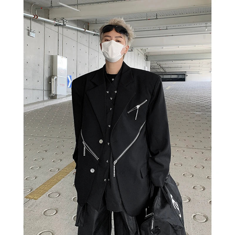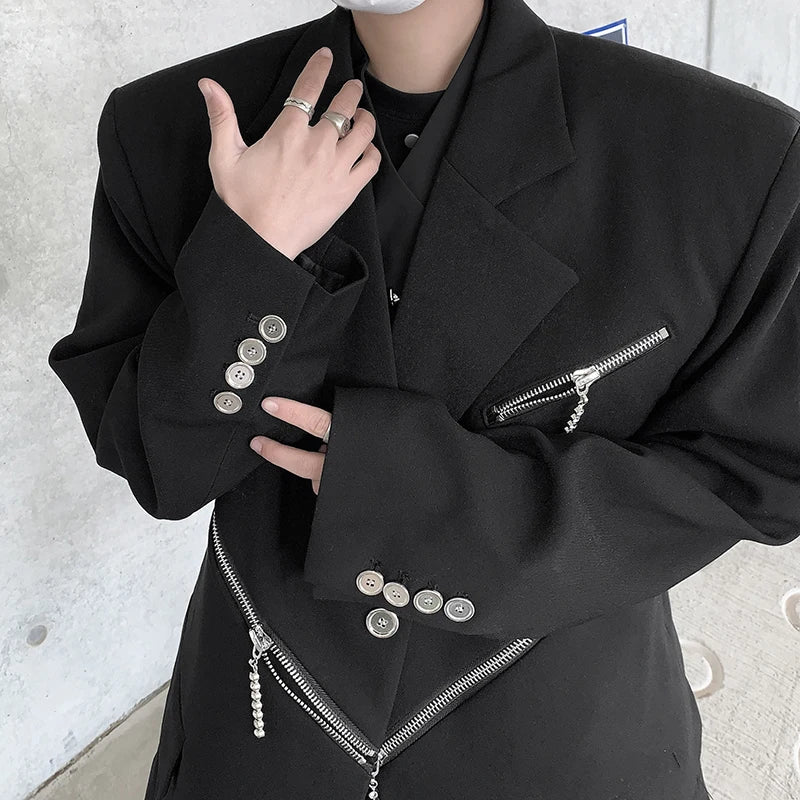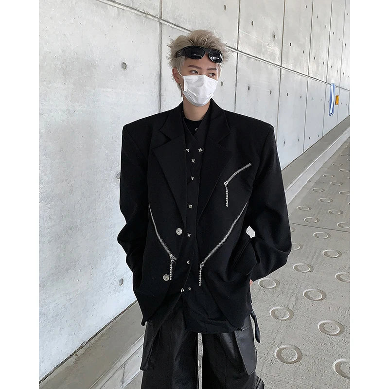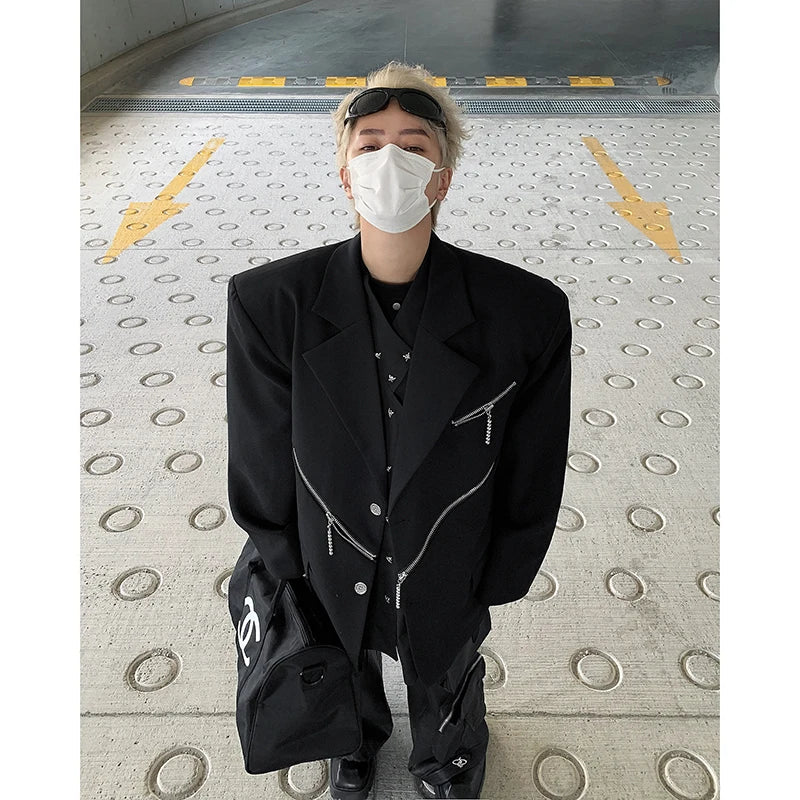 Oversized Black Blazer Men High-end Fashion Leisure Suit Jackets Multi-zippers Male Streetwear Casual Korean All-match Suit