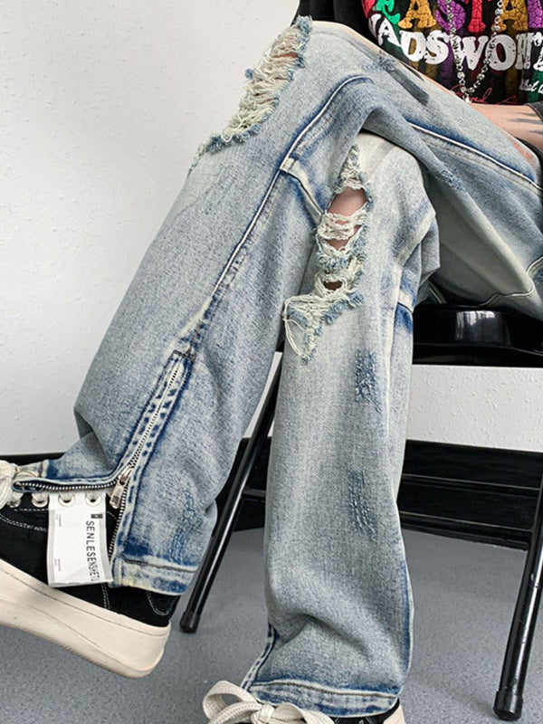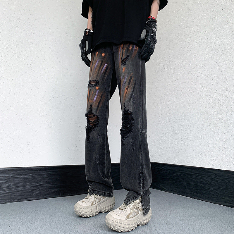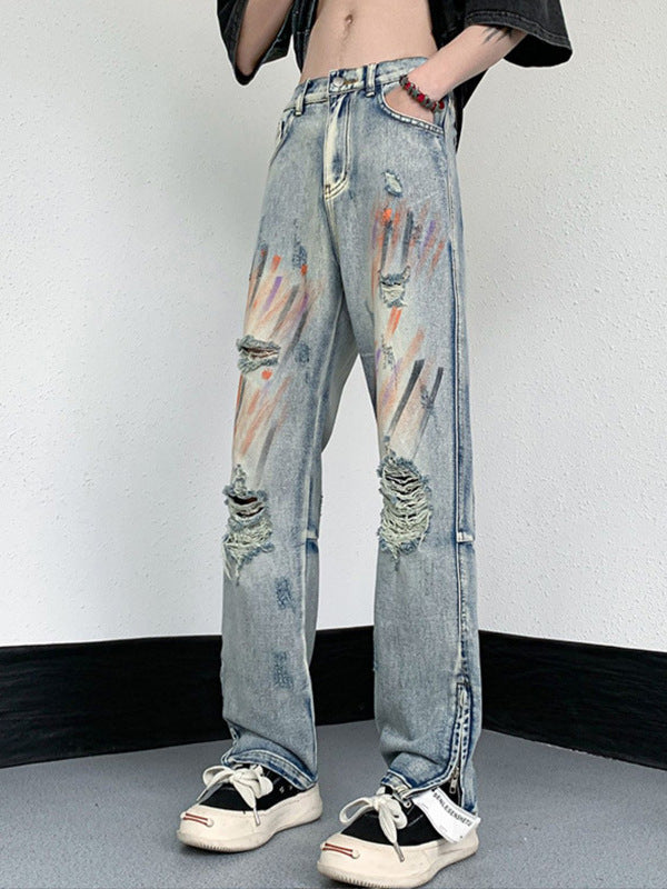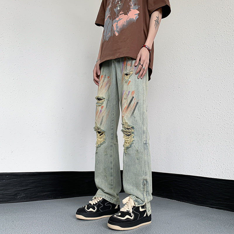 Color inkjet jeans men's summer dark high street handsome old pants washed holes youth casual pants