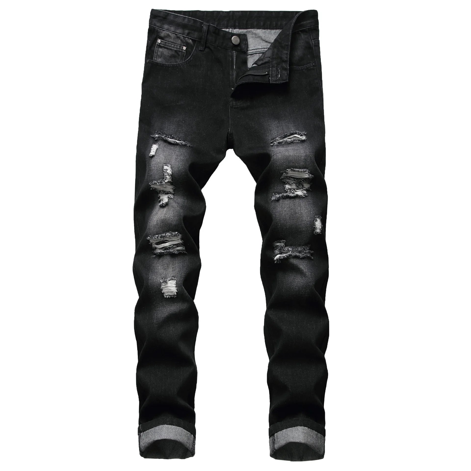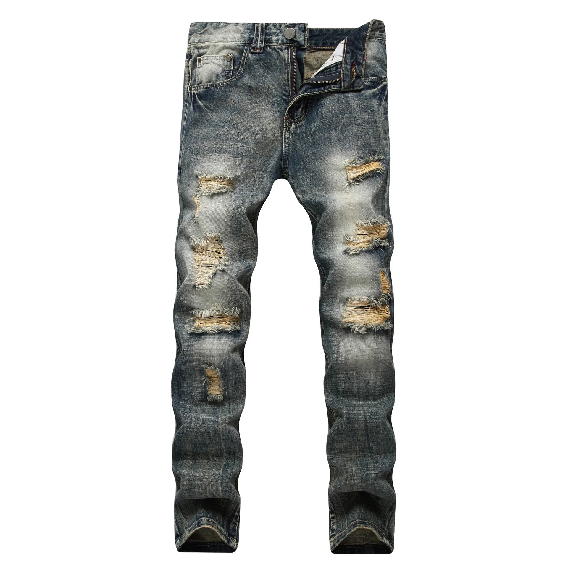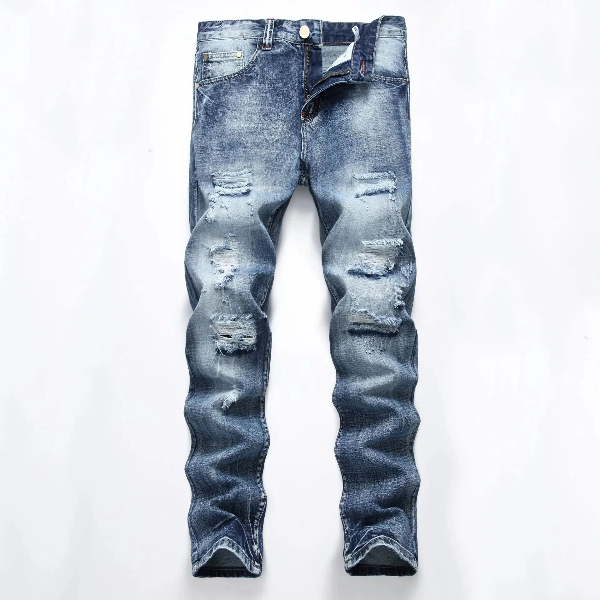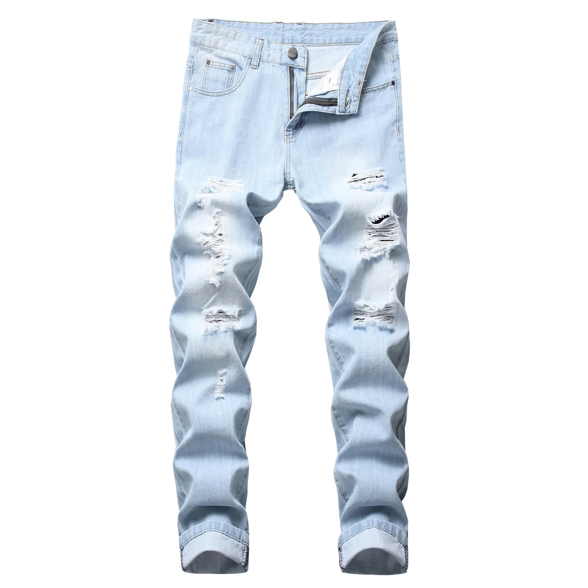 Cross-Border Men's Wear Ripped Straight-Leg Slim Fit Smooths Your Silhouette No Stretch Jeans Light-Colored Denim Trousers