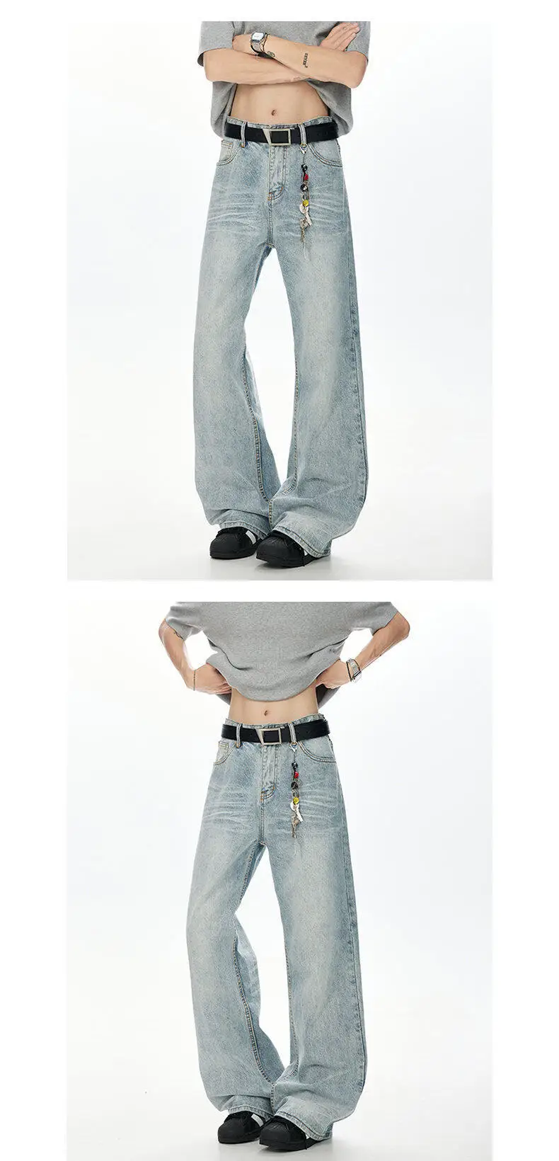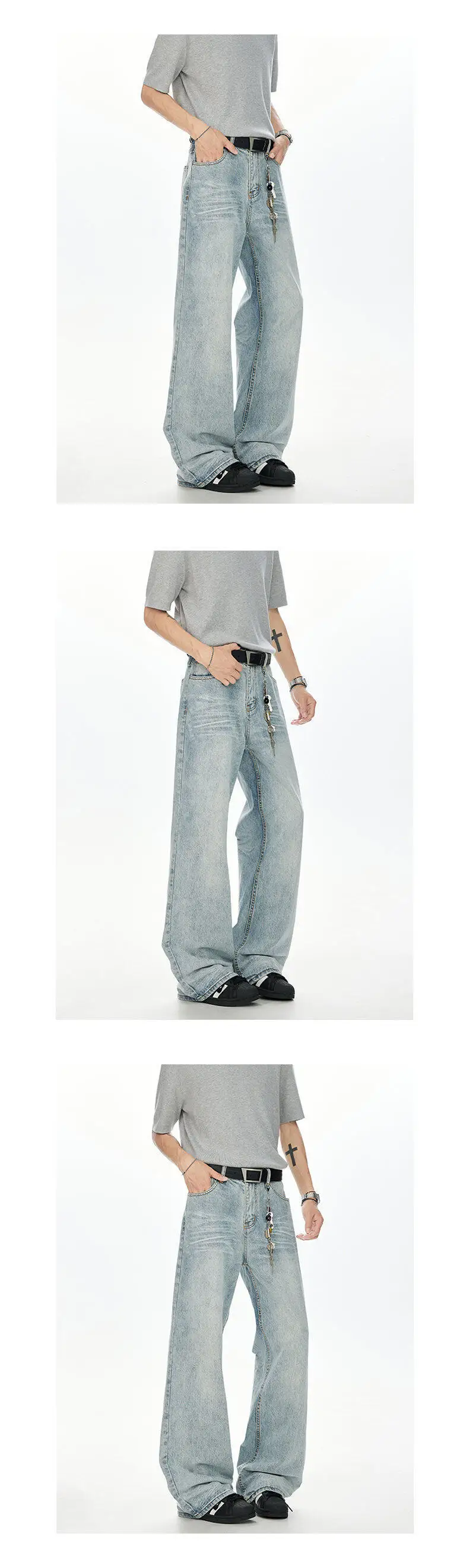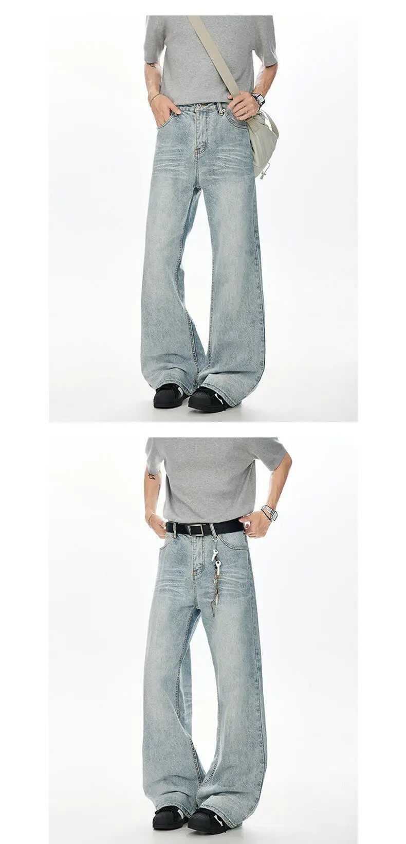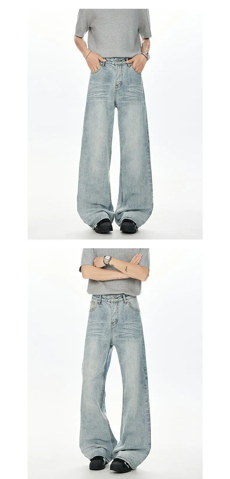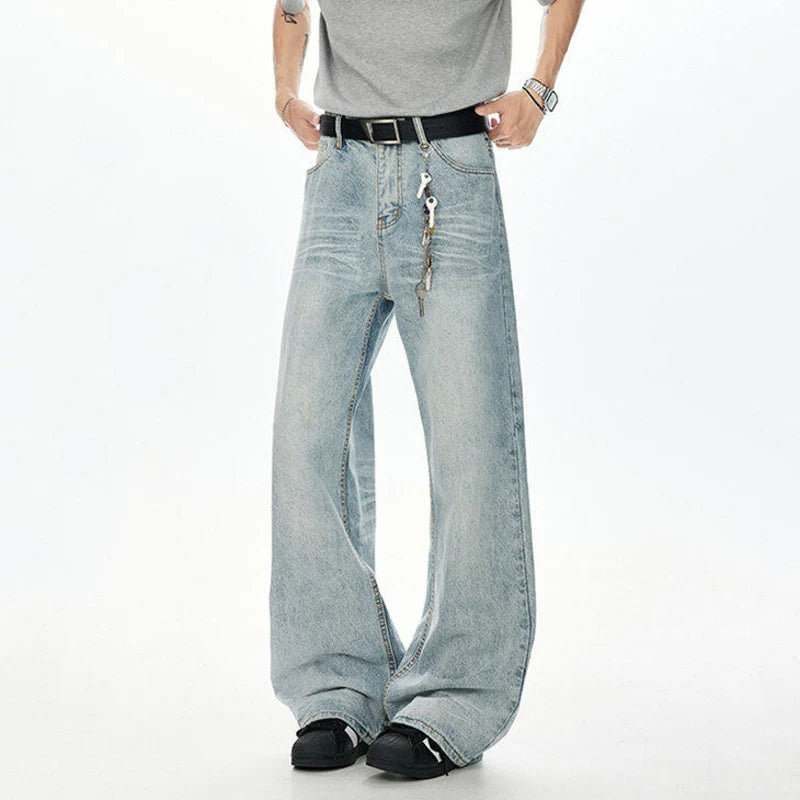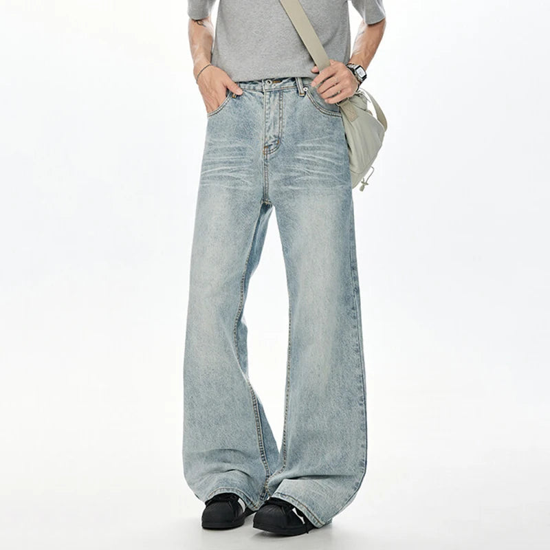 Korean Style Men Denim Pants Solid Color Washed Moustache Effect Wide Leg Trousers Loose Male Straight Jeans Summer