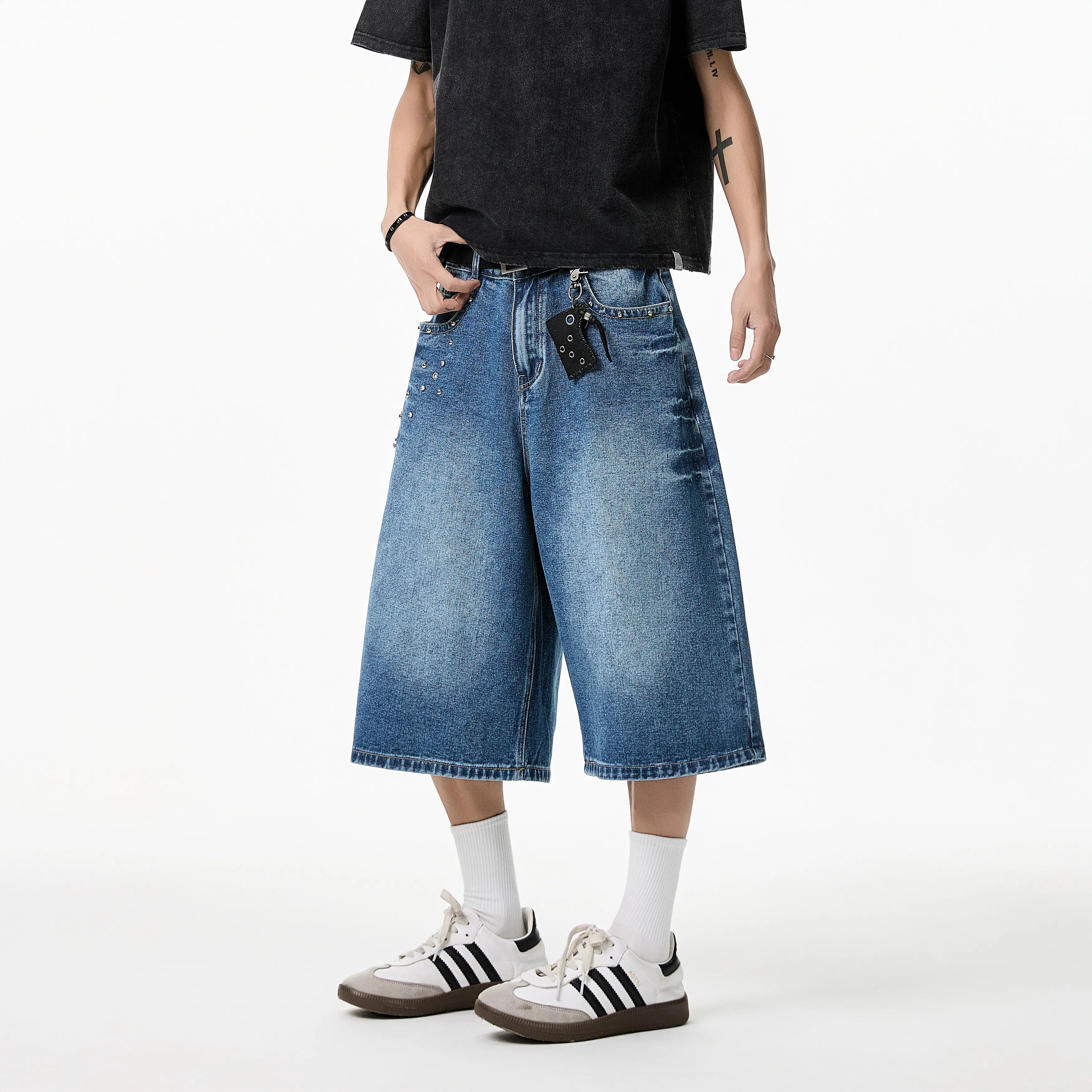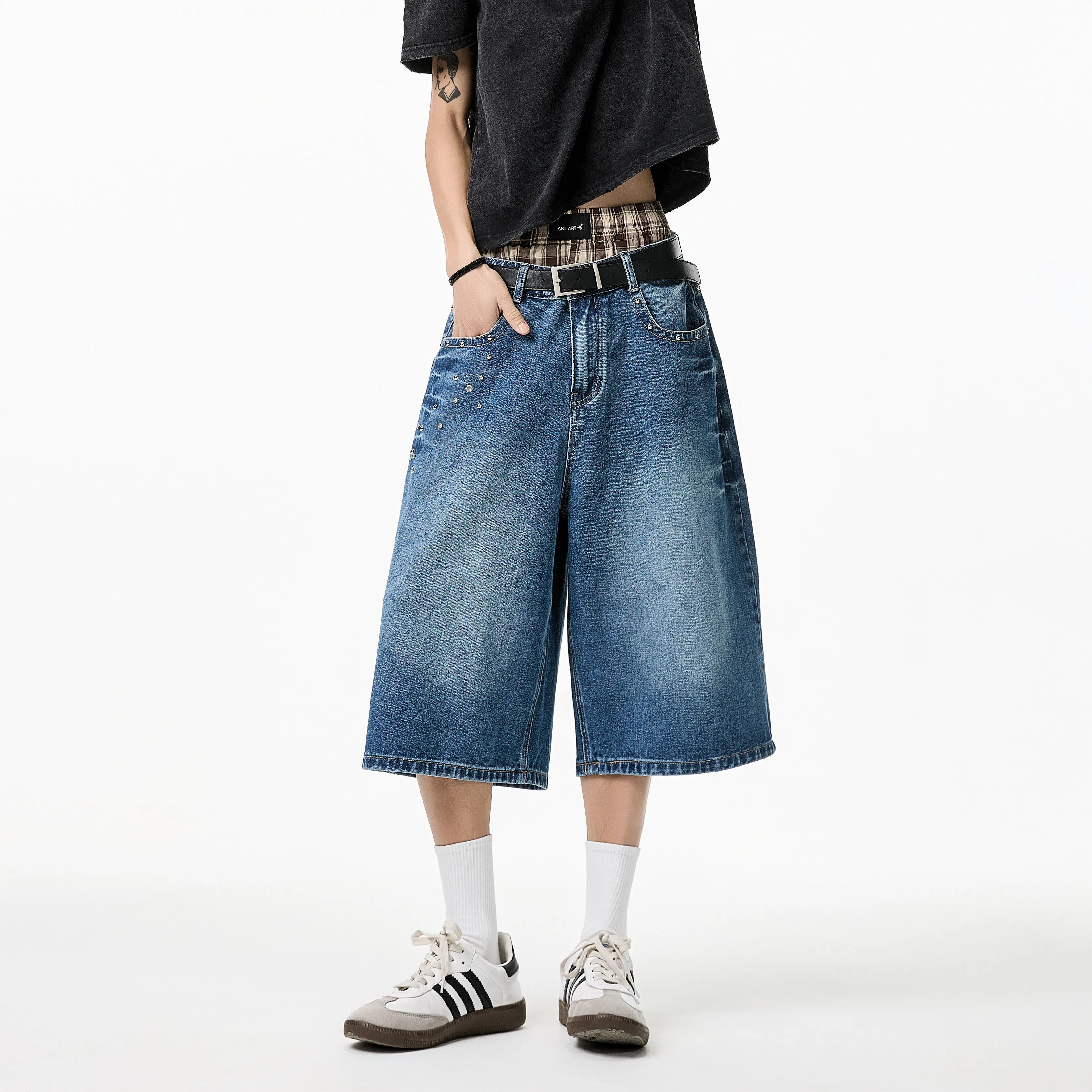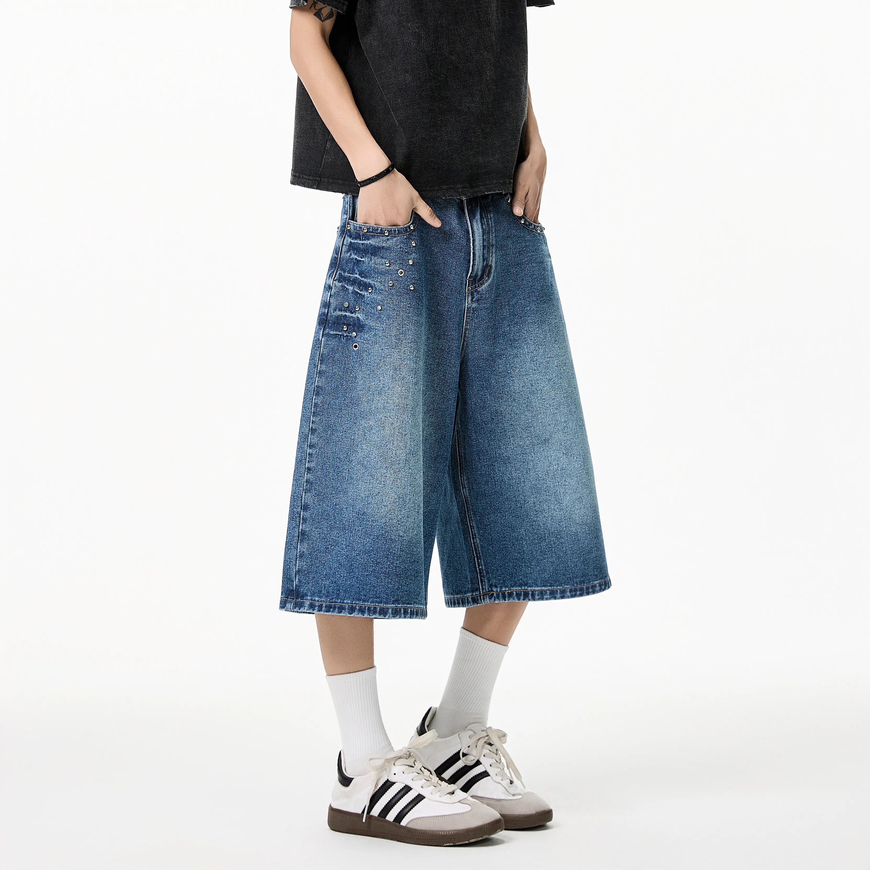 Mens Calf length jeans Loose Fit Summer Studded Rivet Casual Streetwear Lightweight Comfort Cool Trendy Fashion weid leg