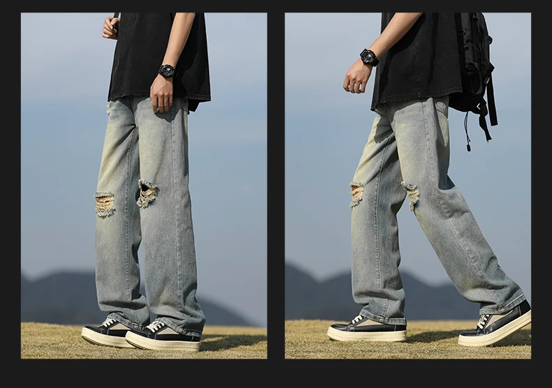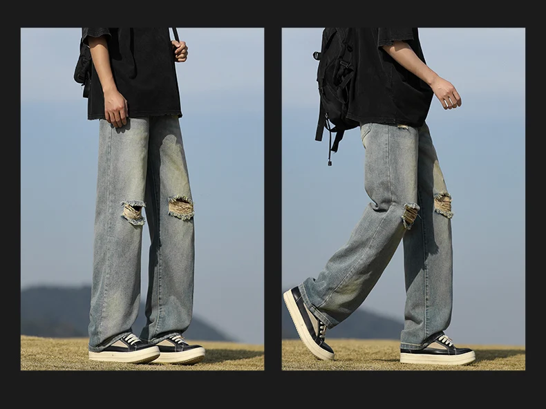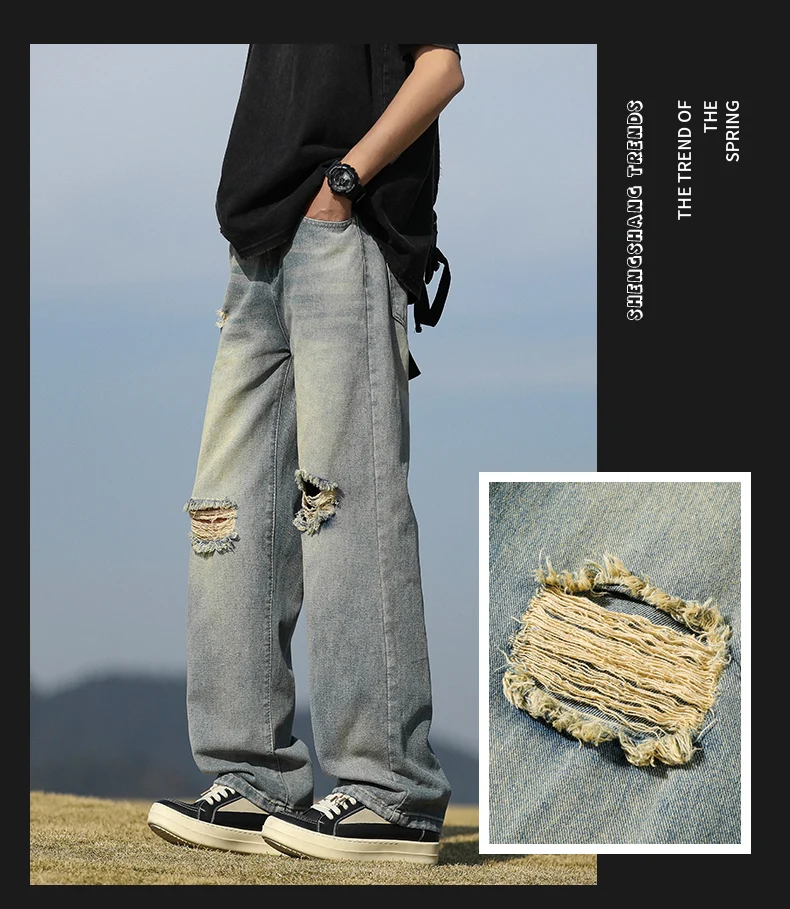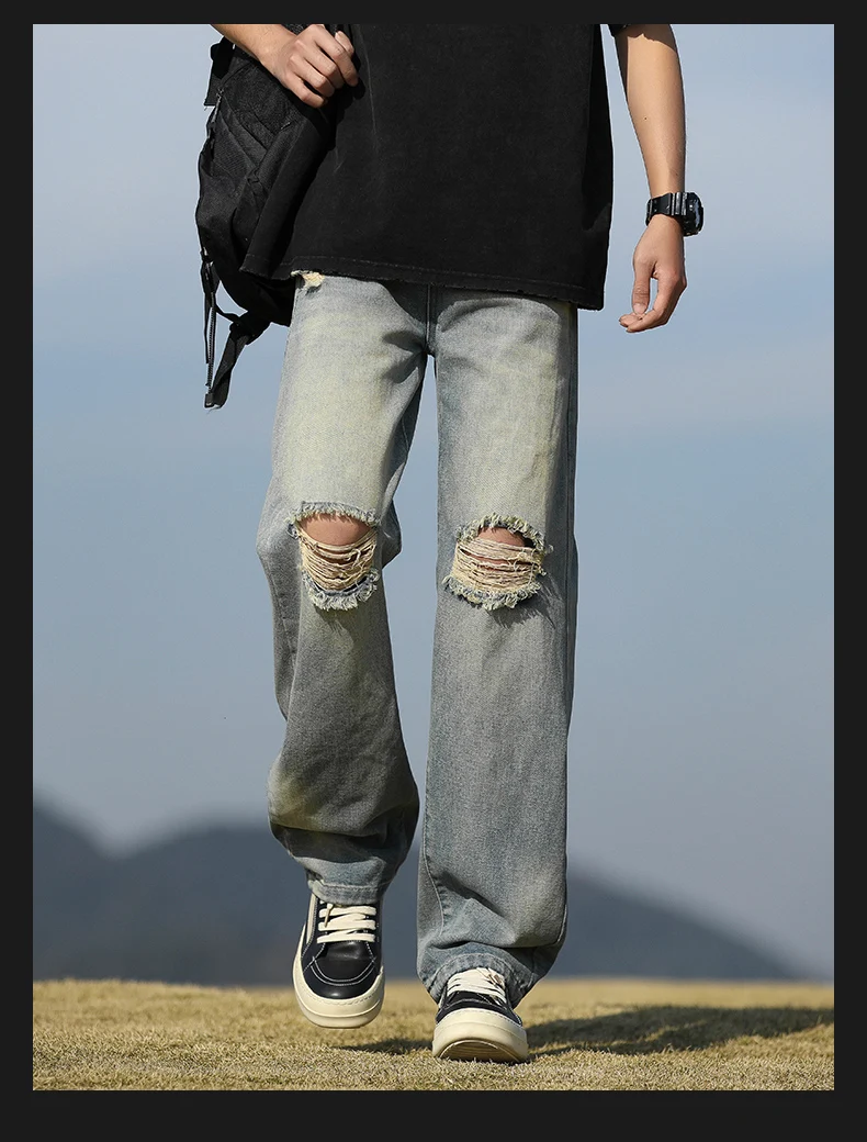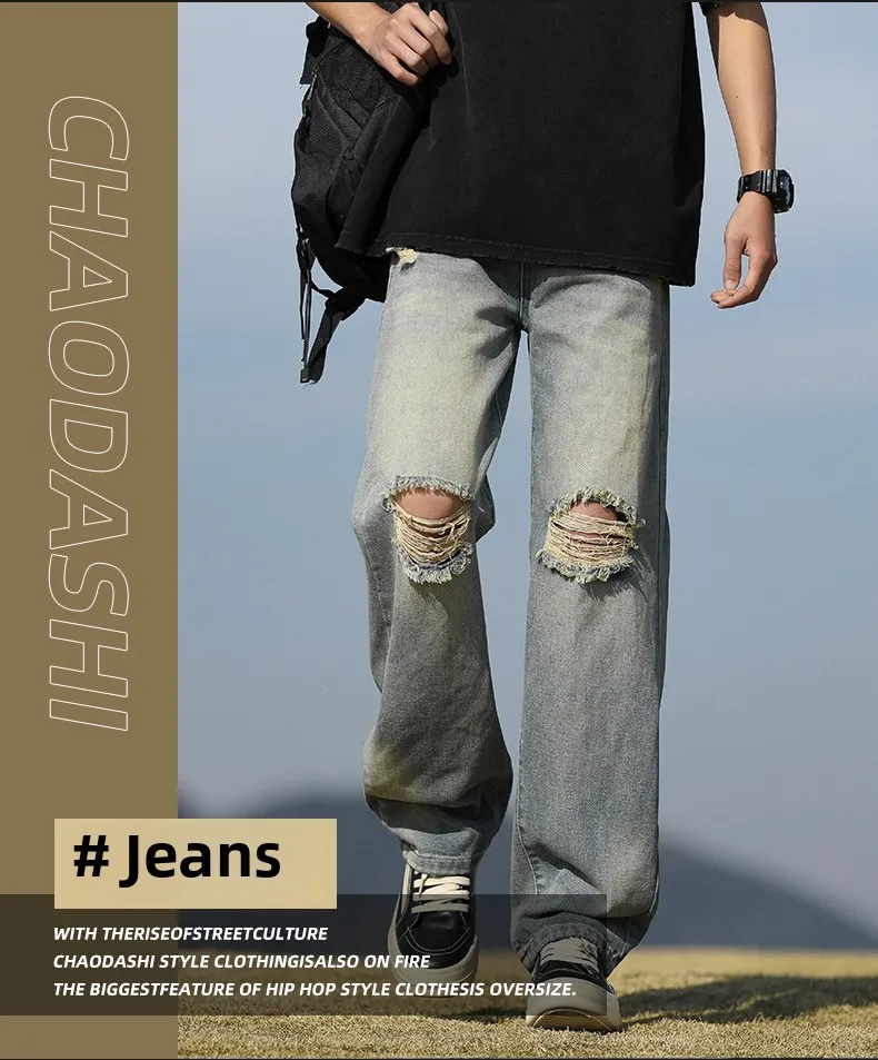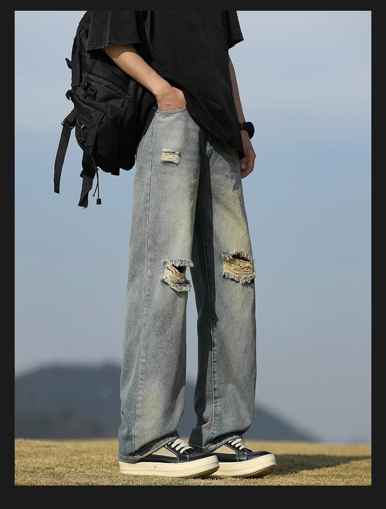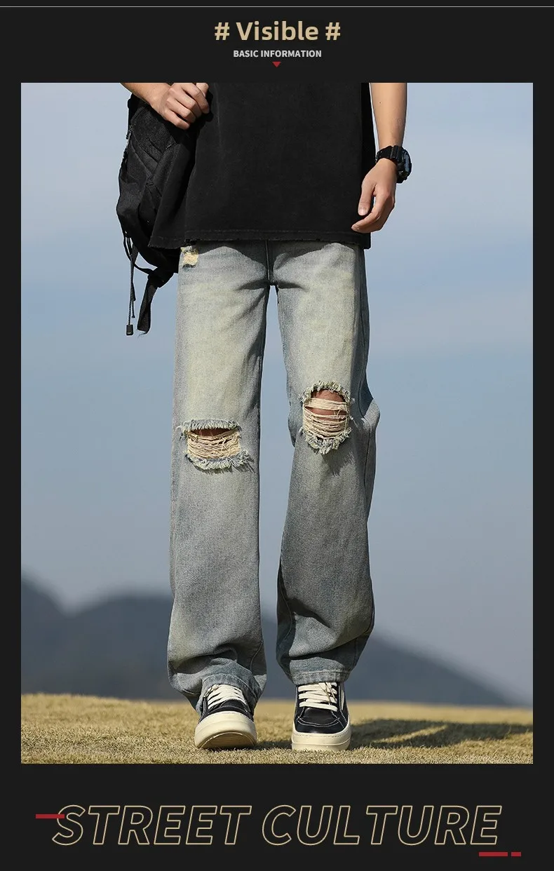 Men's denim pants - Summer American retro straight leg jeans loose and breathable high street fashion ripped casual pants