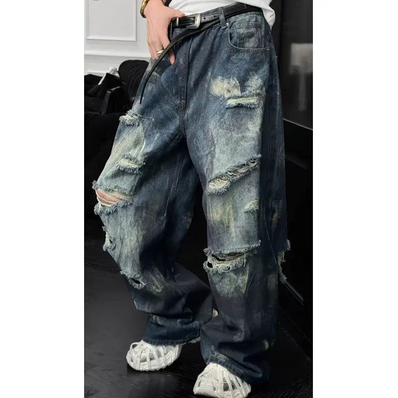 Mens Loose Fit Straight Leg Jeans Dark Blue Ripped Distressed Trendy Streetwear Fashion Casual Urban Denim Pants Hip Hop Style