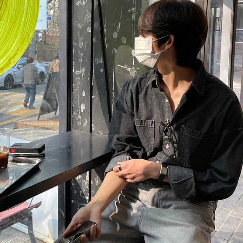 Spring Clothing Men's Denim Long-sleeved Pocket Shirt Casual Korean Turn down Button Streetwear Luxury Big Size Stylish