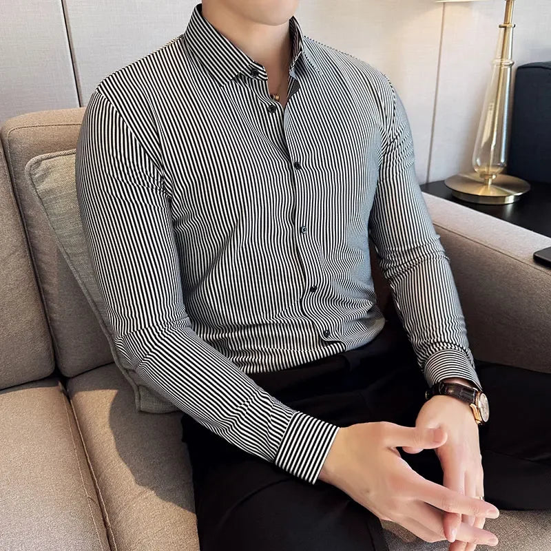 High Elasticity Men Stripe Shirt Spring British Style Anti-wrinkle High-EndSoft Solid Casual Slim Fit Long Sleeved Shirt