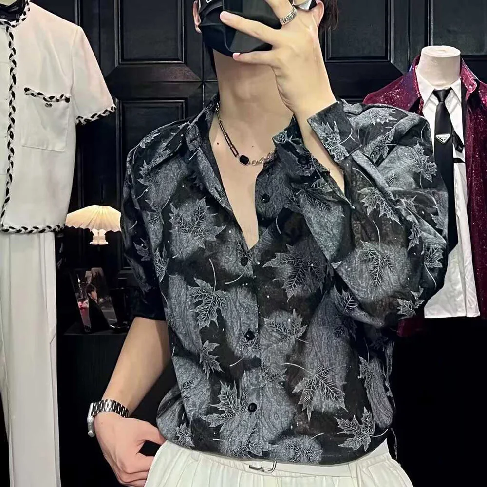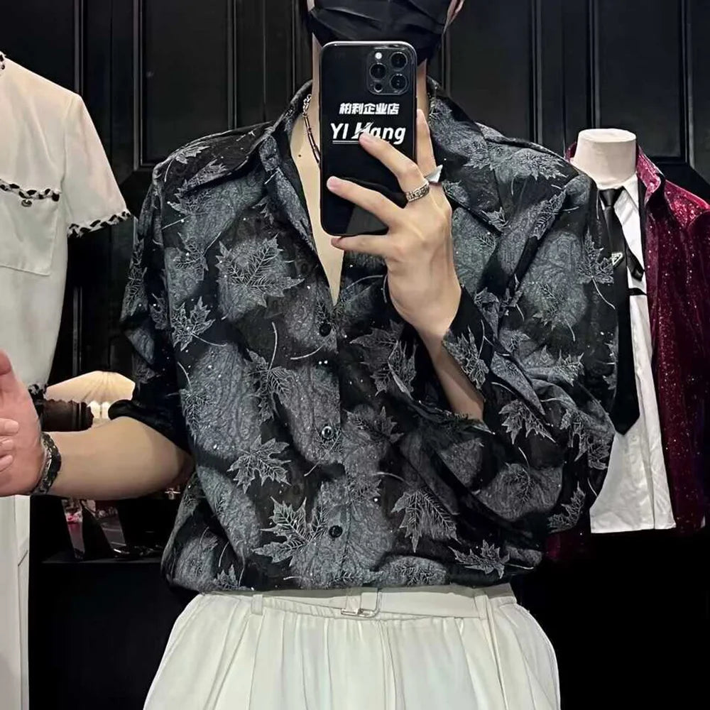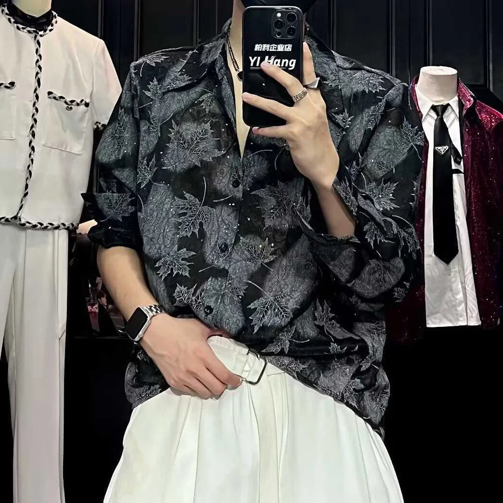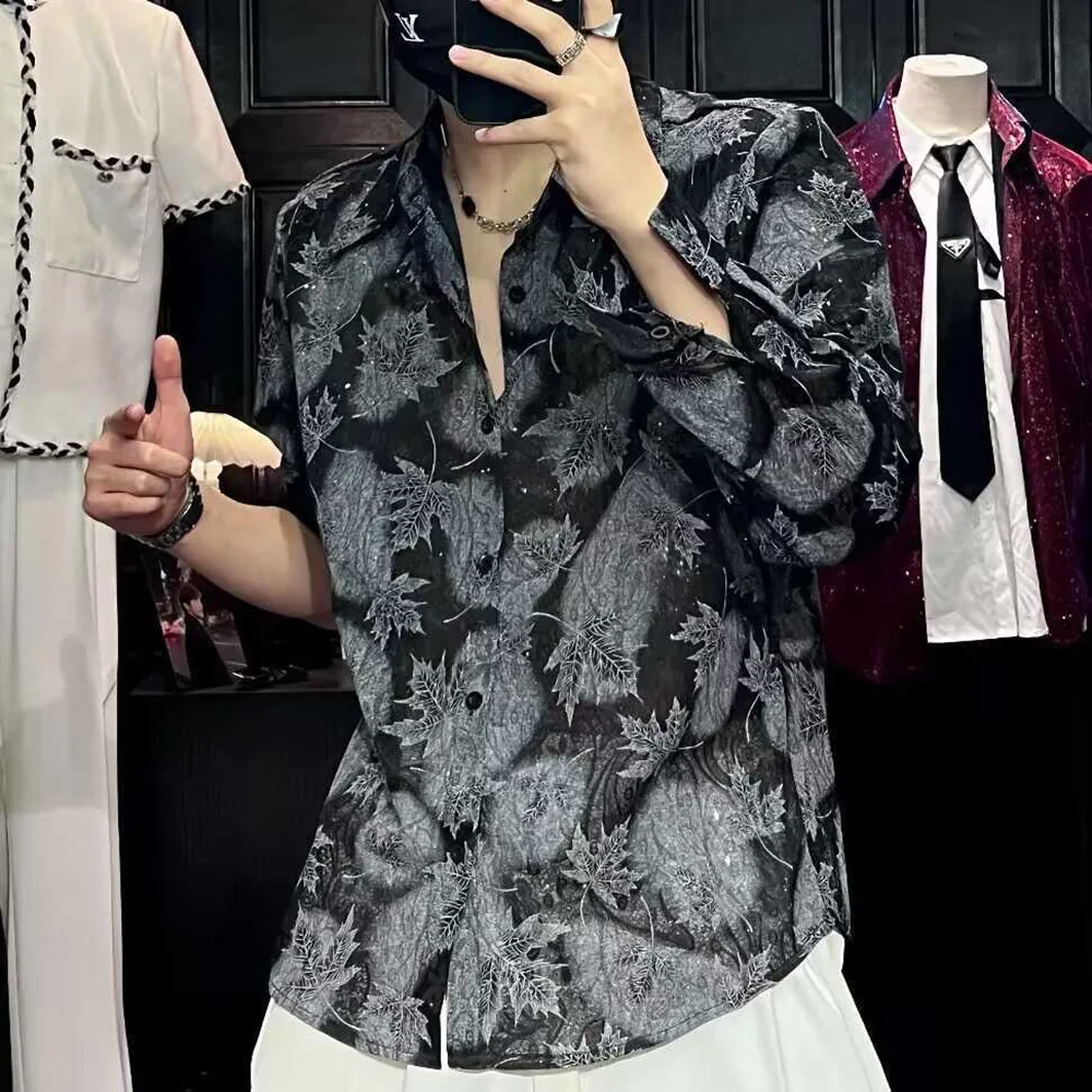 Mens Shirt Maple Leaf Printed Sophisticated Casual Shirt Summer Fashion Modern Youth Dark Style Loose Thin Long Sleeve Top