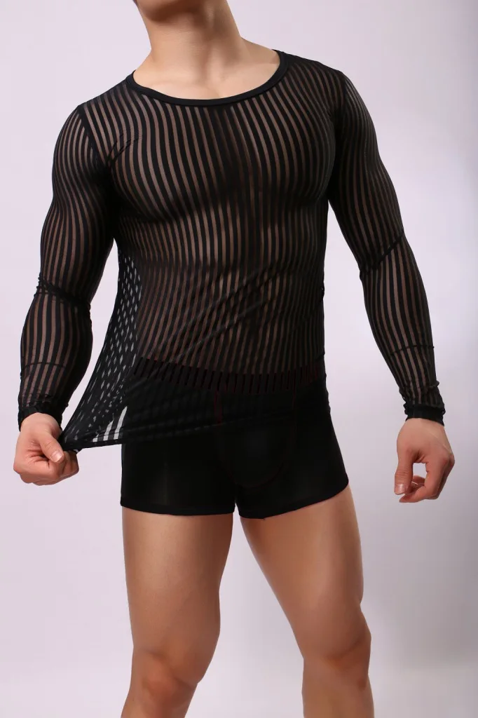 Mens Stripe Undershirt Breathable Slim Mesh Tees Shirt See Through Sheer Long Sleeves T Shirts Sexy Transparent Shirt Underwear