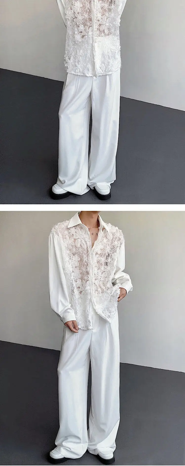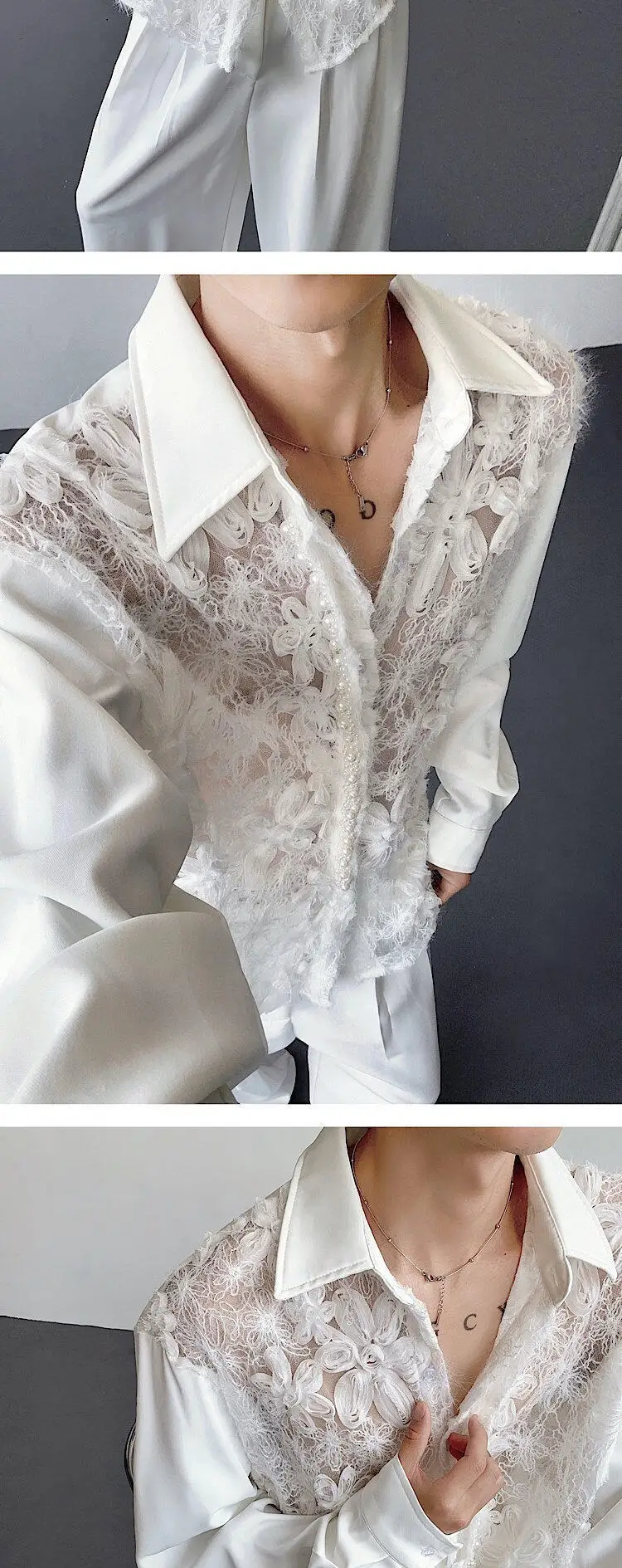 Niche Design Men Shirts Turn-down Collar Hollow Out Pearl Lace -up Patchwork Loose Solid Color Male Long Sleeved Top