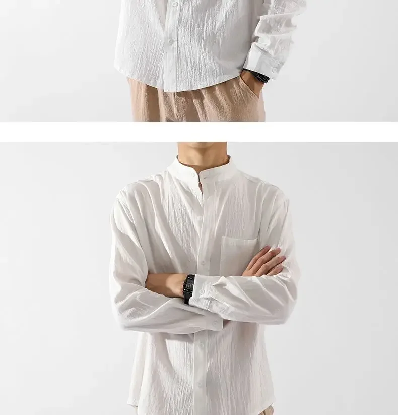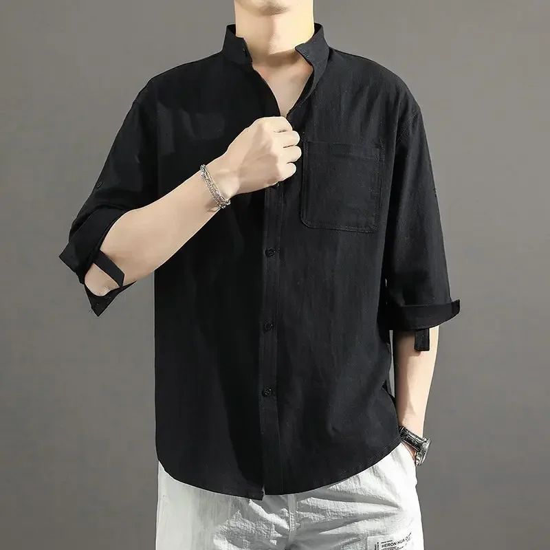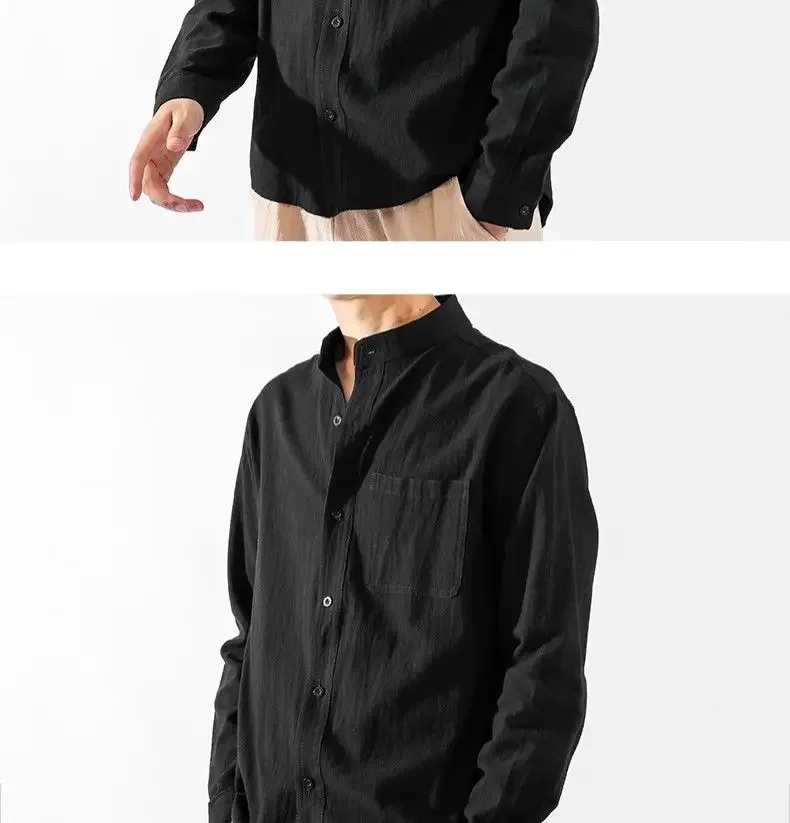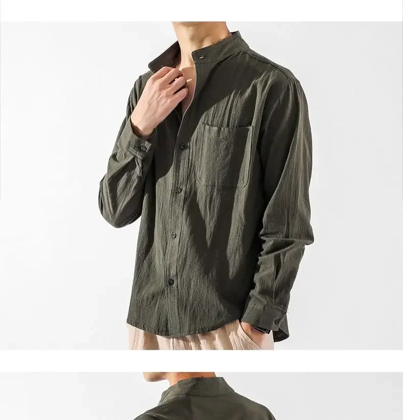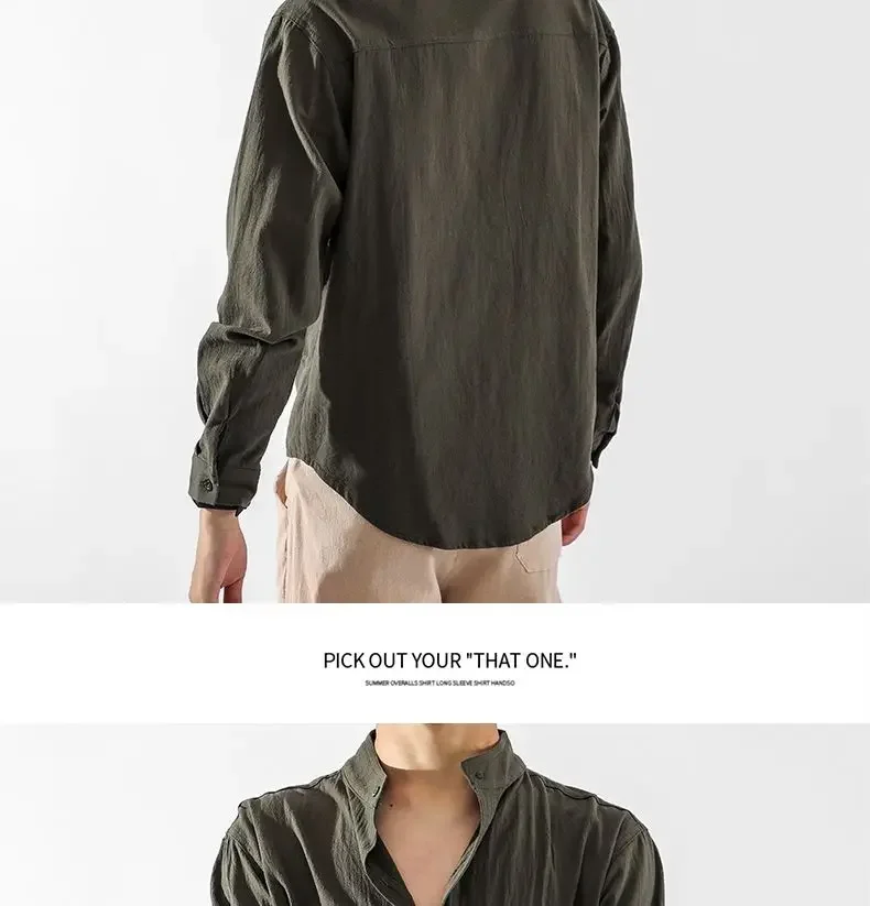Summer Temperament Versatile Men's Top with Patchwork Pockets Fashionable Buttons Solid Color Standing Collar Long Sleeves Shirt