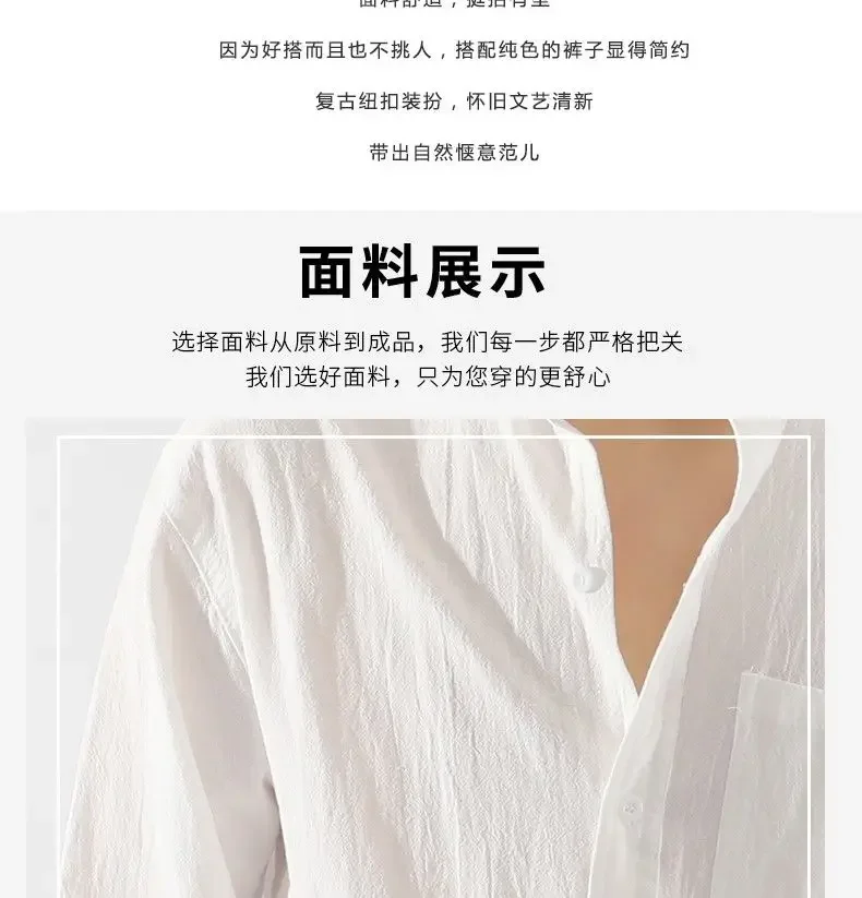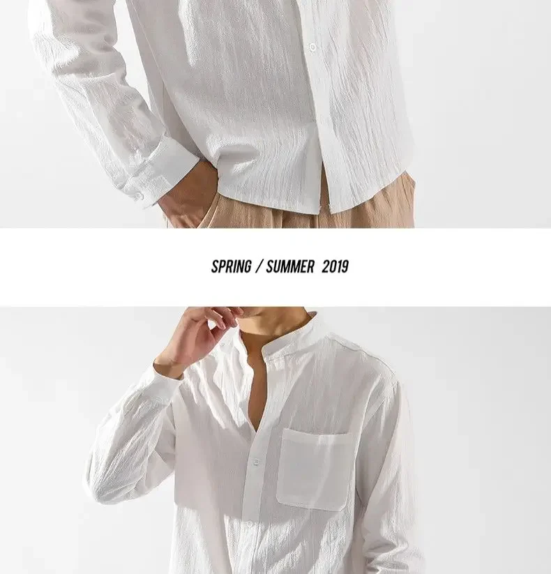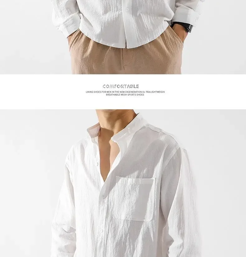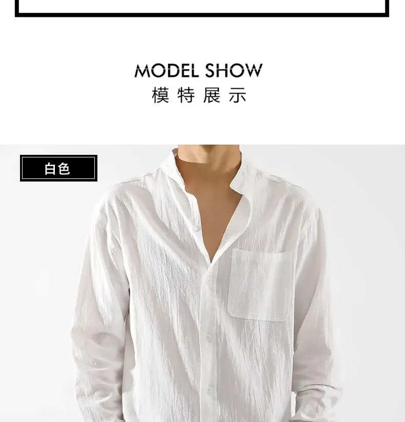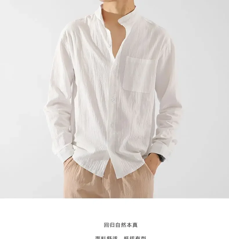 Summer Temperament Versatile Men's Top with Patchwork Pockets Fashionable Buttons Solid Color Standing Collar Long Sleeves Shirt