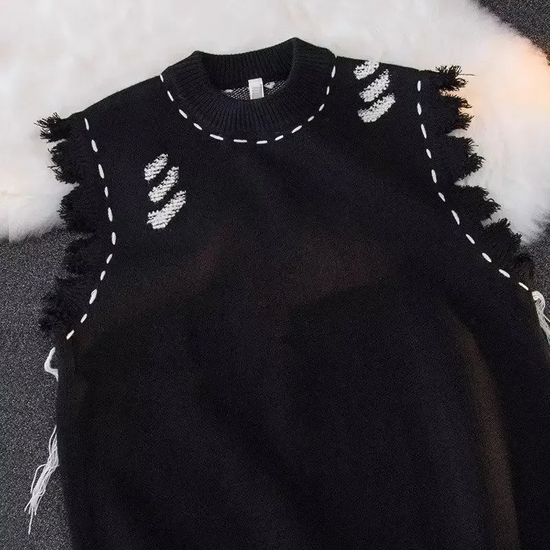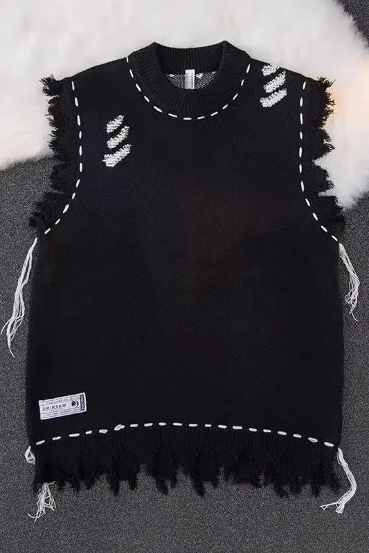 Autumn New Men's Fringe Vest Sweater American Style Street Destructive Sense Round Neck Knitted Top Jacket Casual Scene