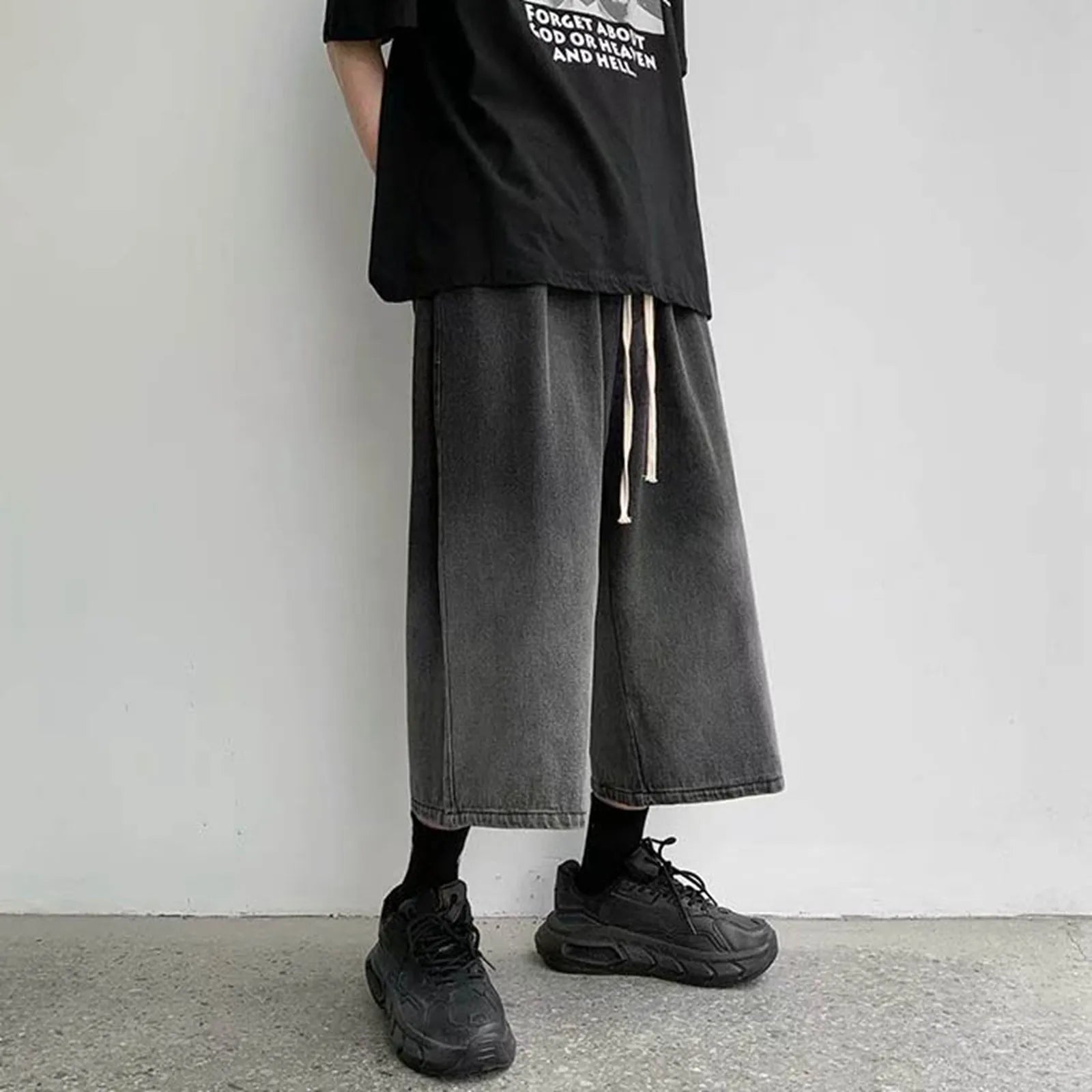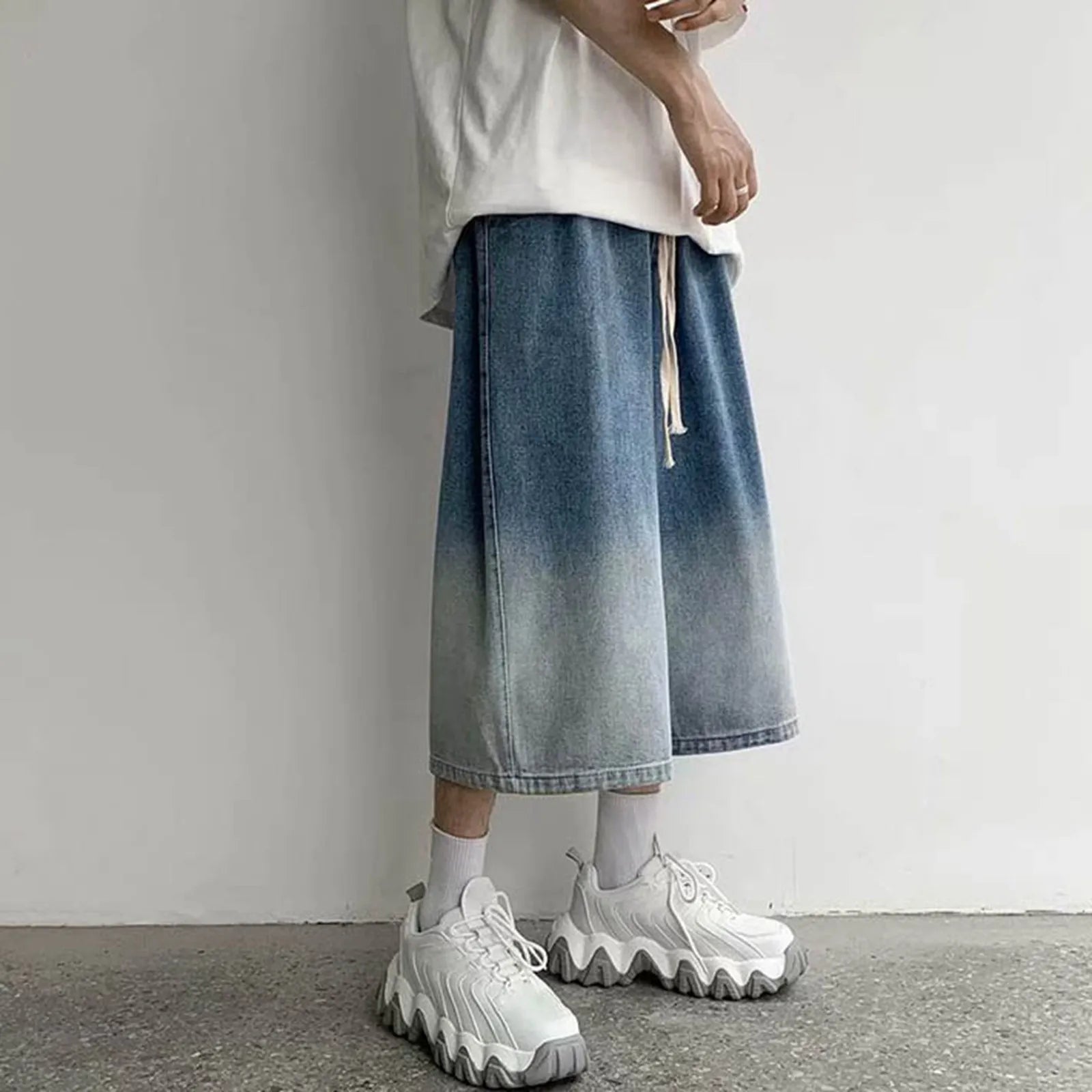 New Summer Men's Denim Shorts Casual Summer Shorts Elastic Waist Wide Leg Shorts Drawstring Baggy Jeans Shorts Male Summer