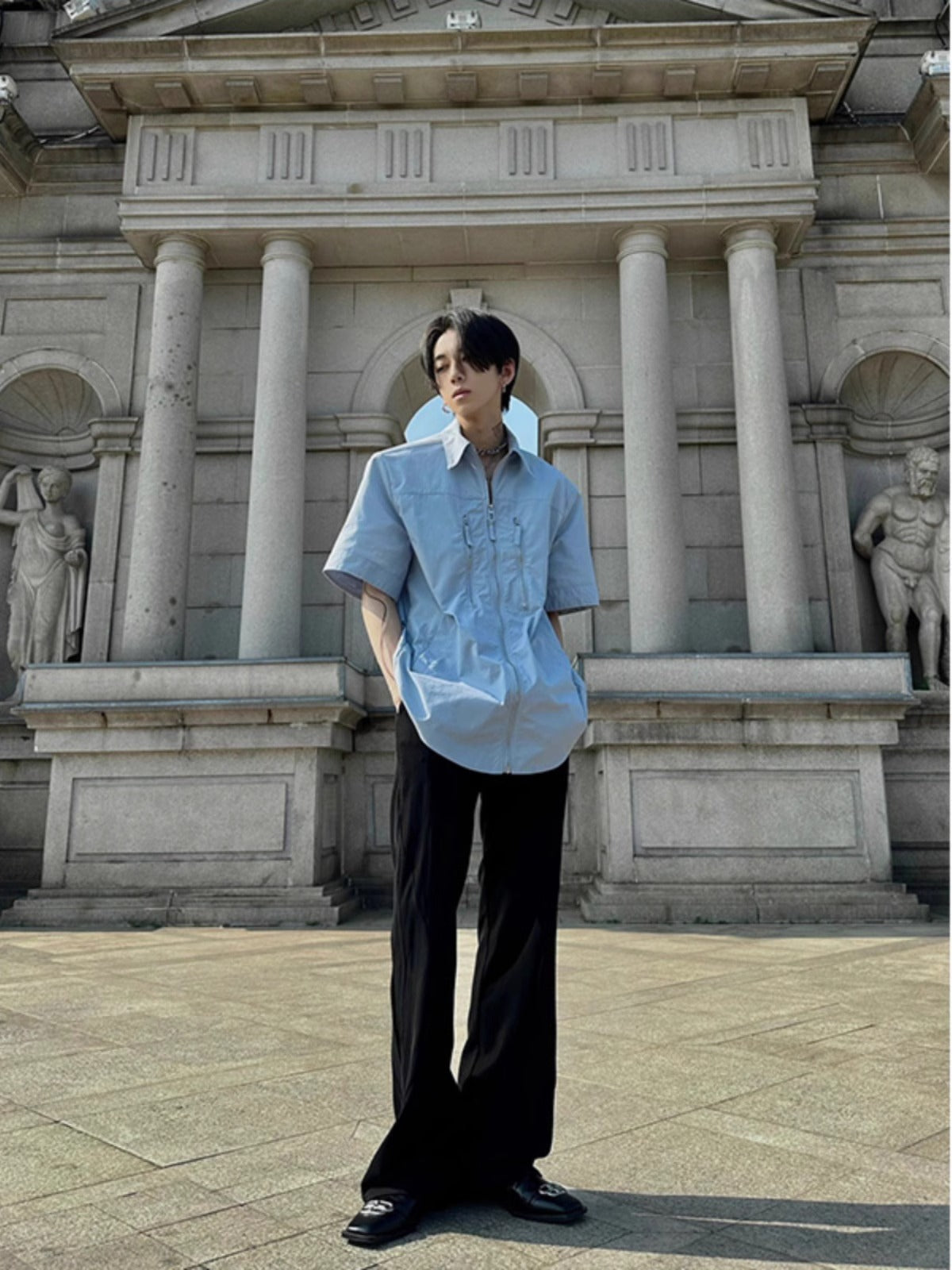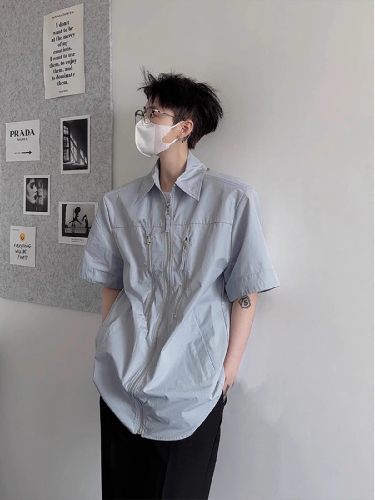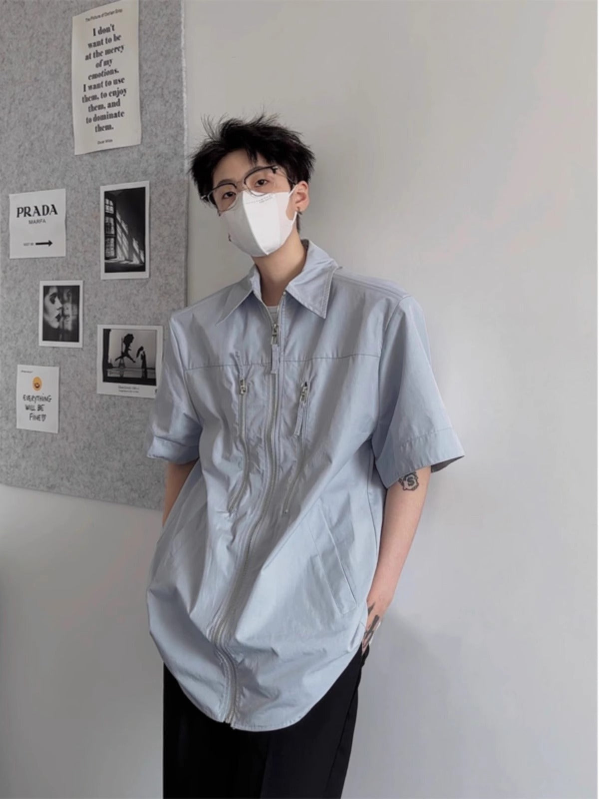 Korean style high-end shoulder pad short-sleeved shirt men's niche design zipper shirt summer new shirt jacket