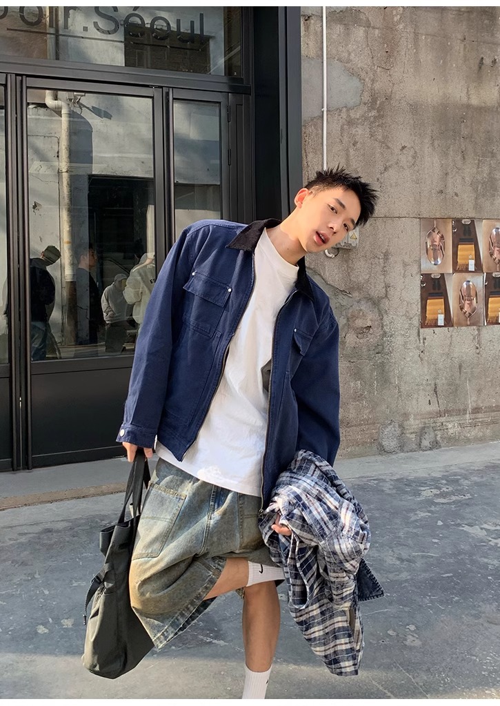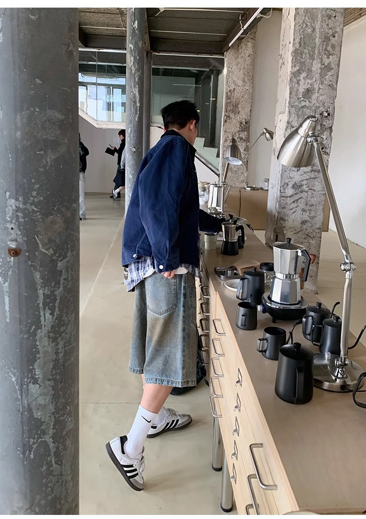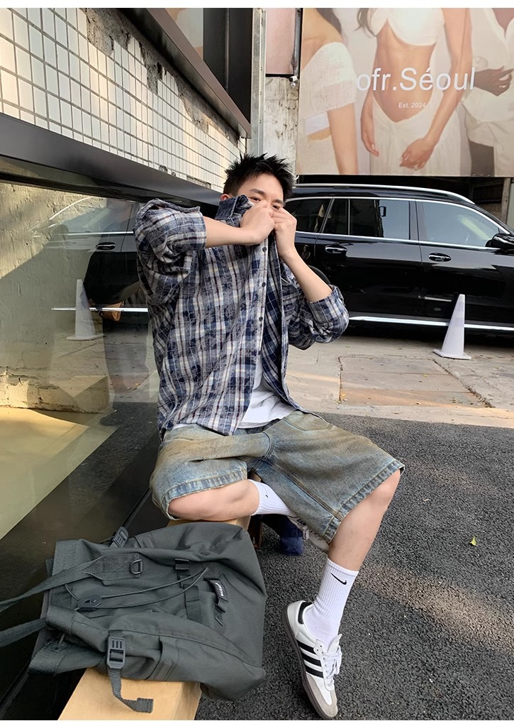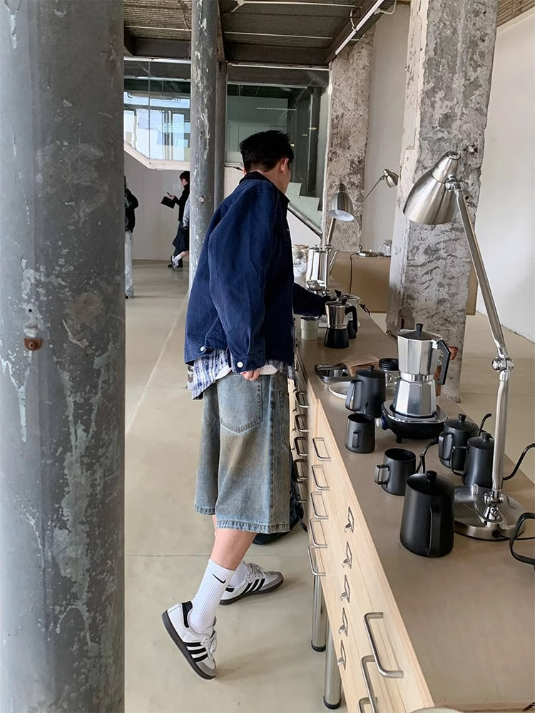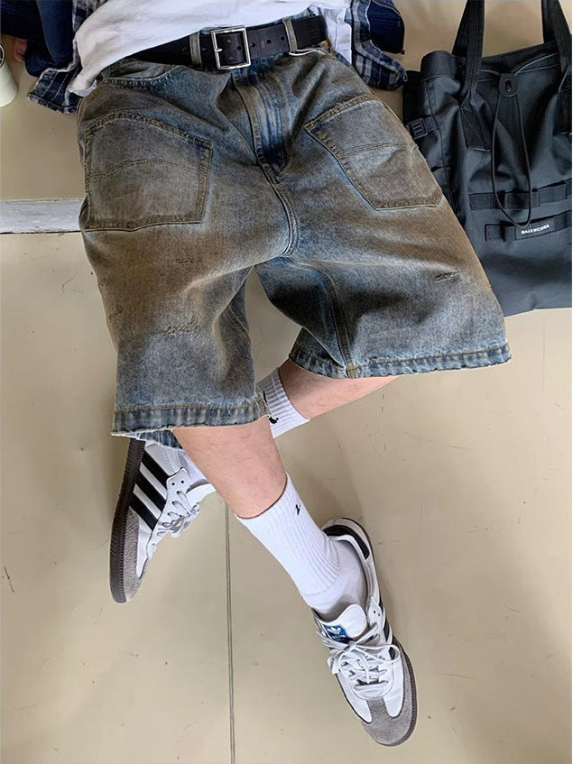 American retro high street old washed wasteland style pocket design denim shorts shorts men's summer new