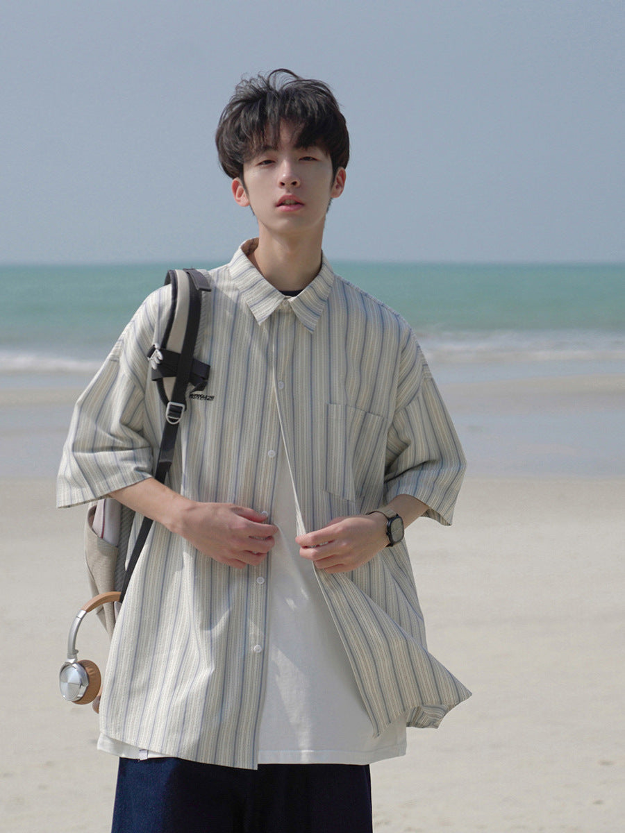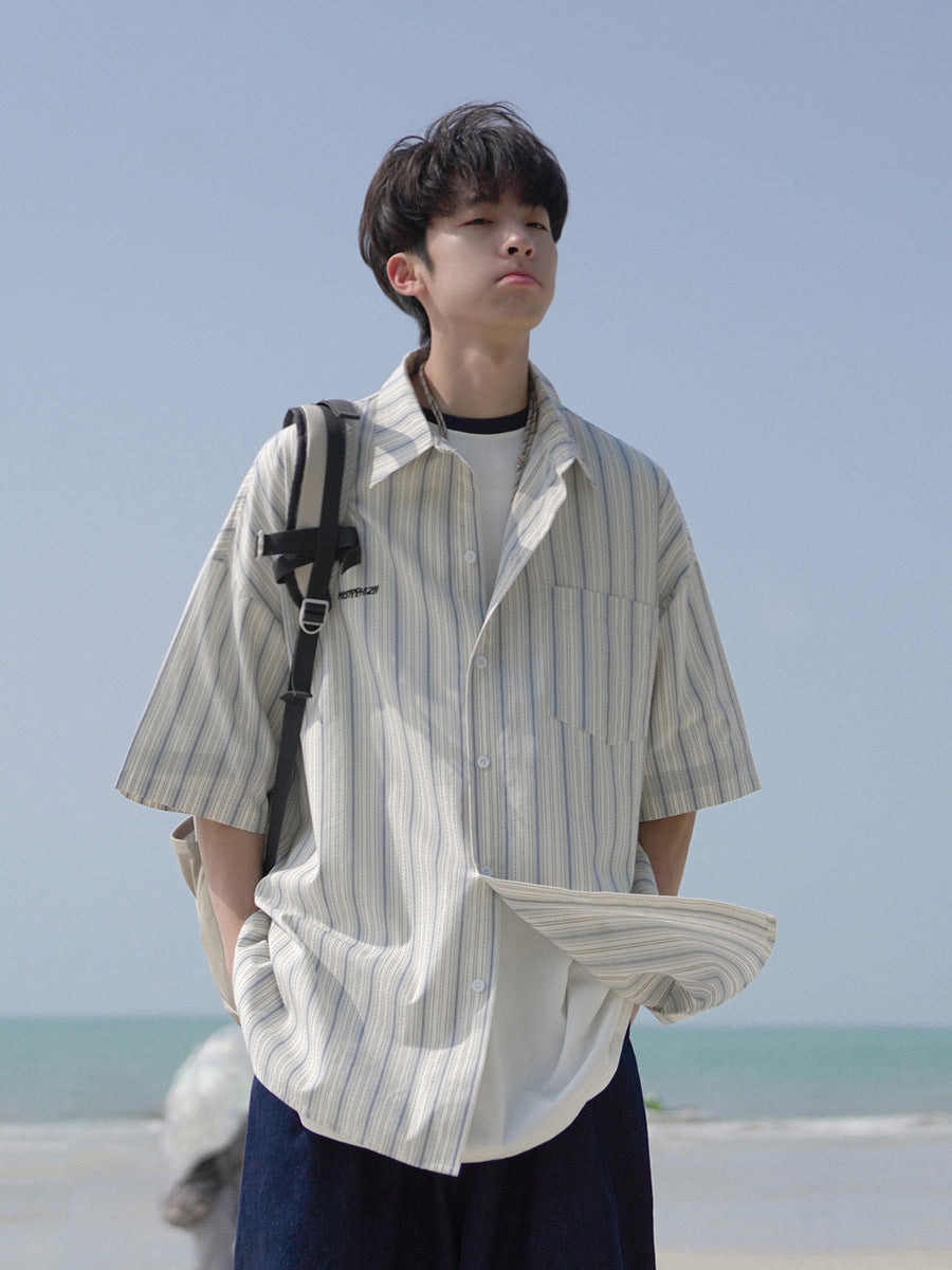 Korean style niche striped short-sleeved shirt summer new men's shirt jacket summer loose casual tops