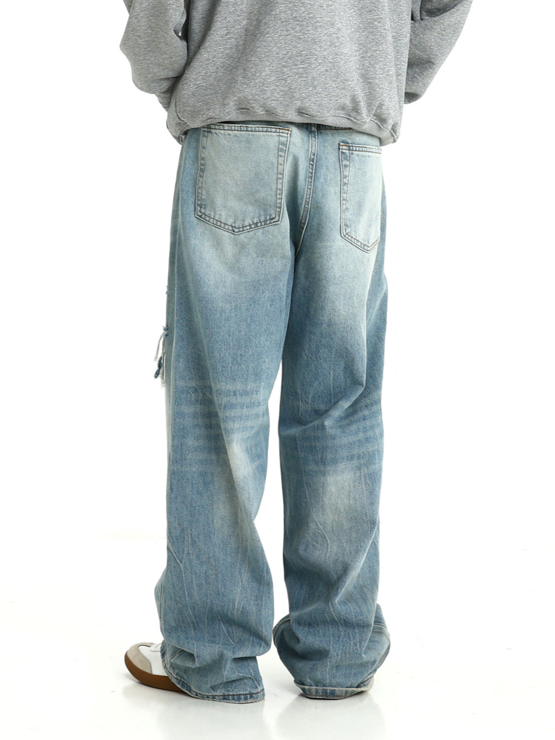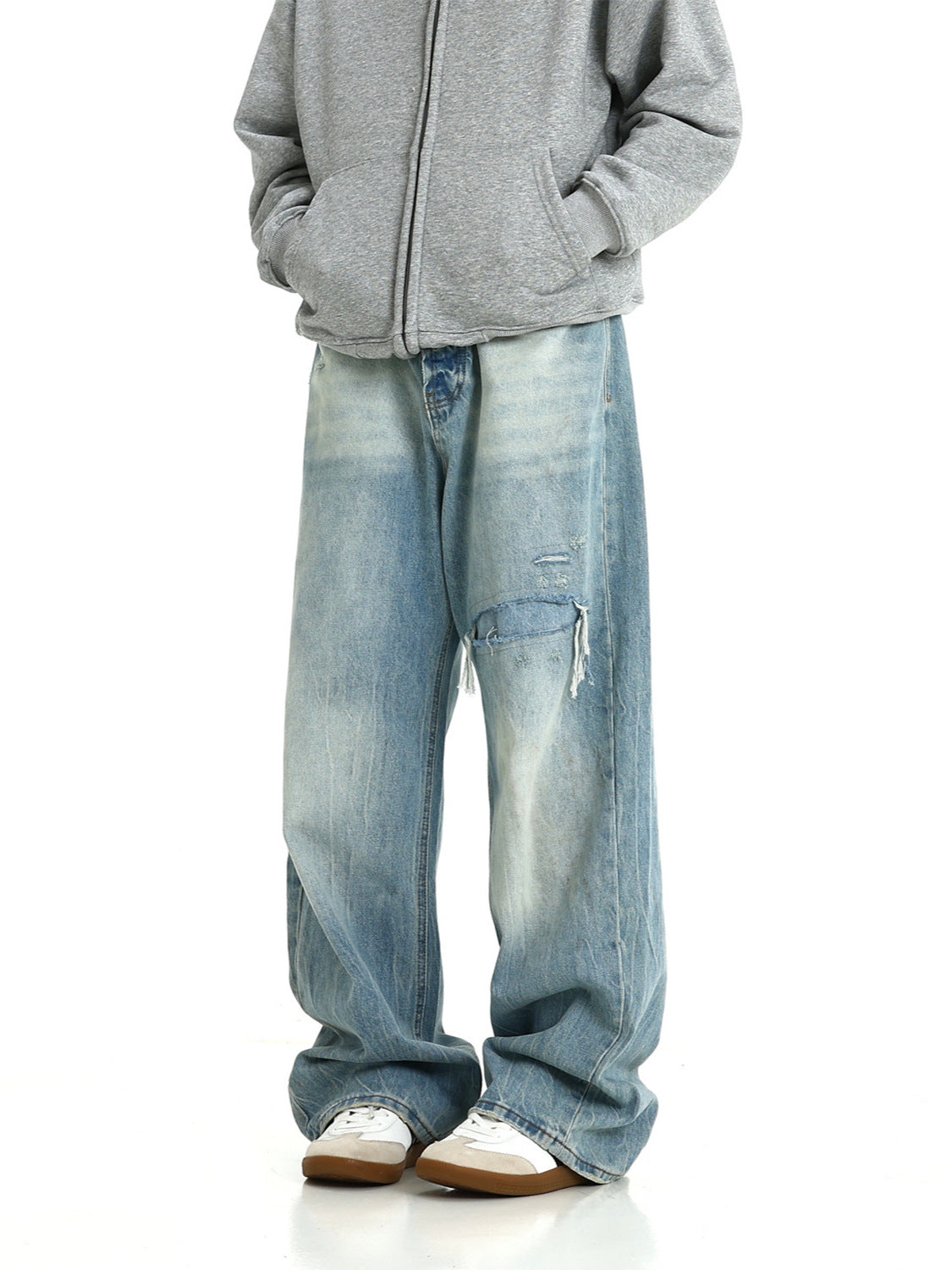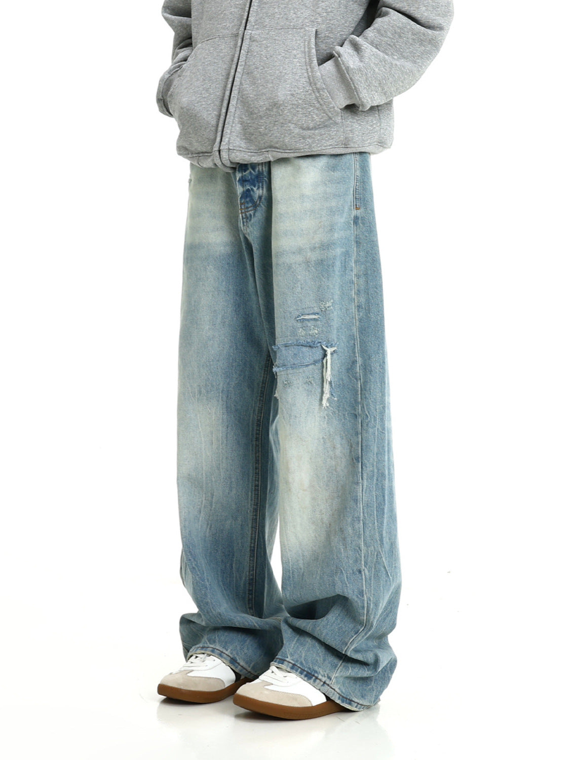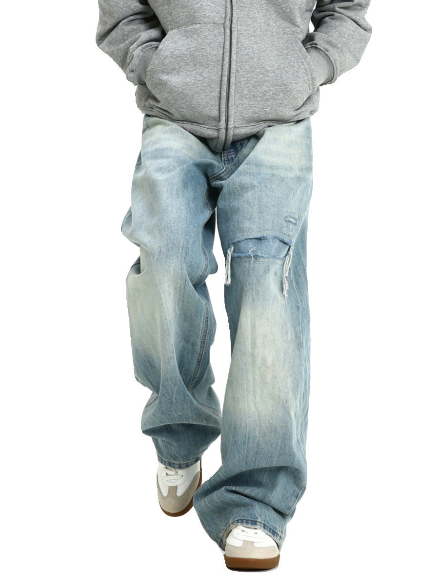 American retro ice blue straight jeans summer new vintage washed worn loose pants