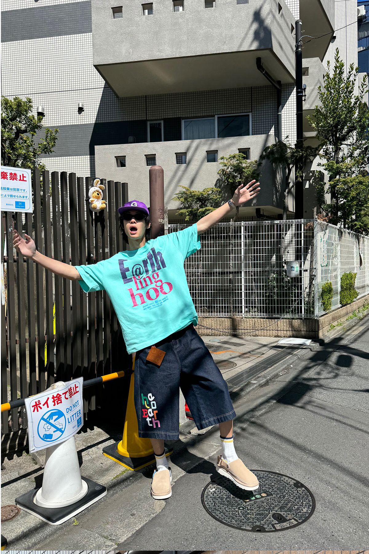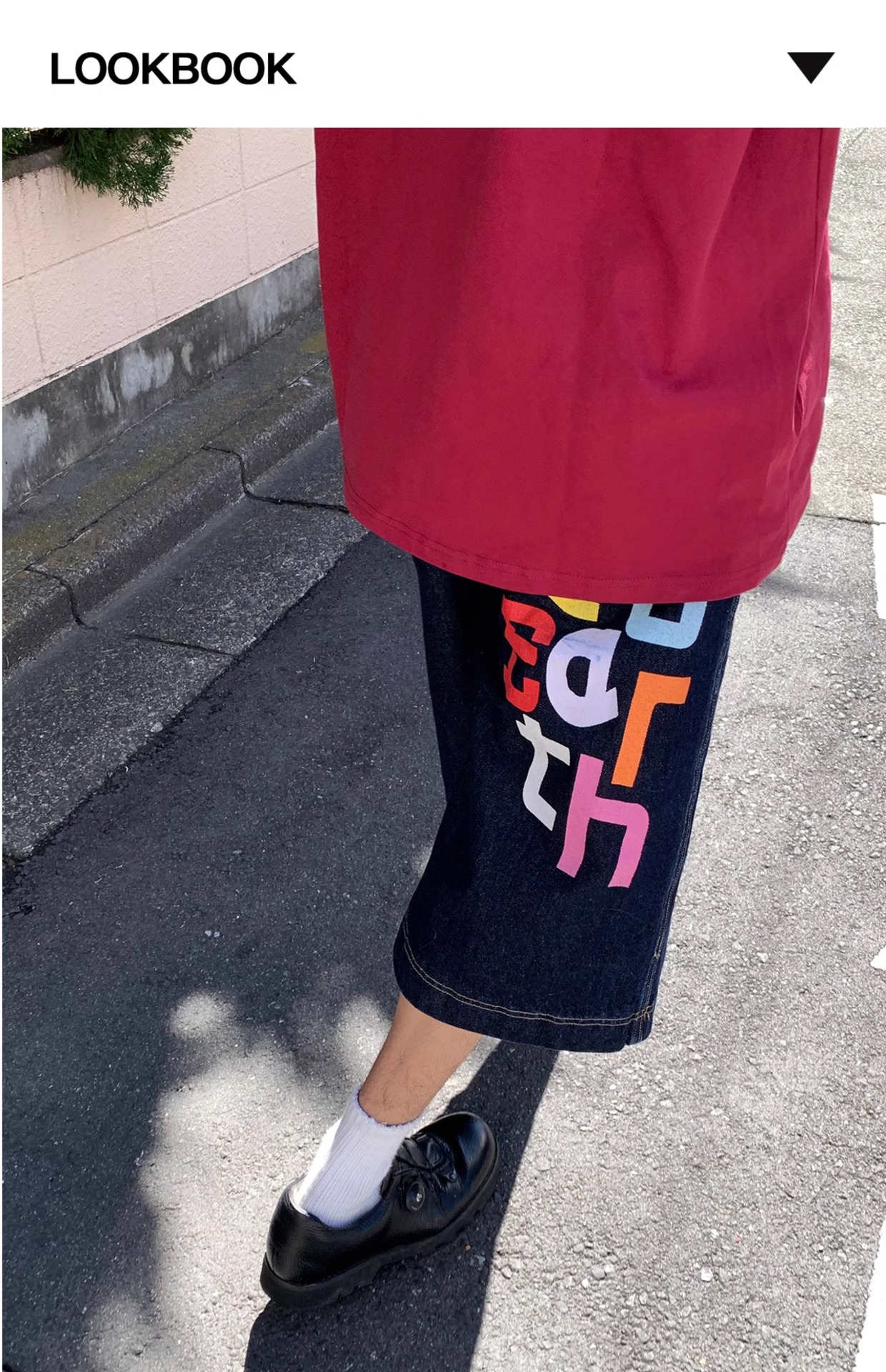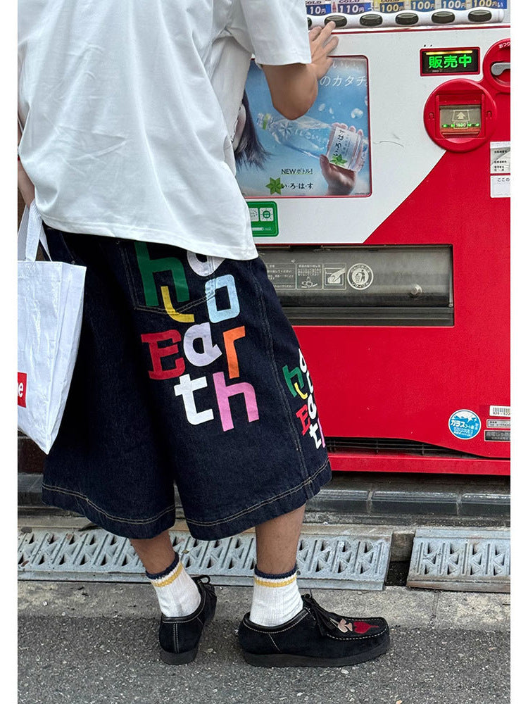 Colored printed washed seven-point denim shorts men's summer new straight loose versatile wide-leg pants