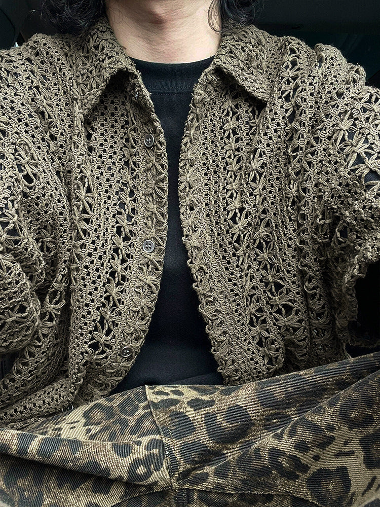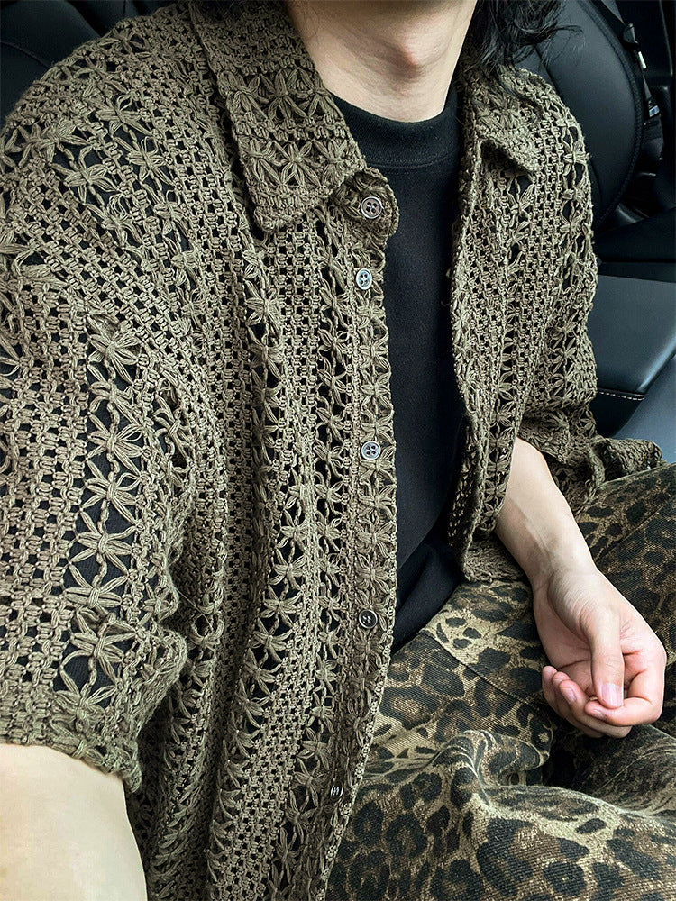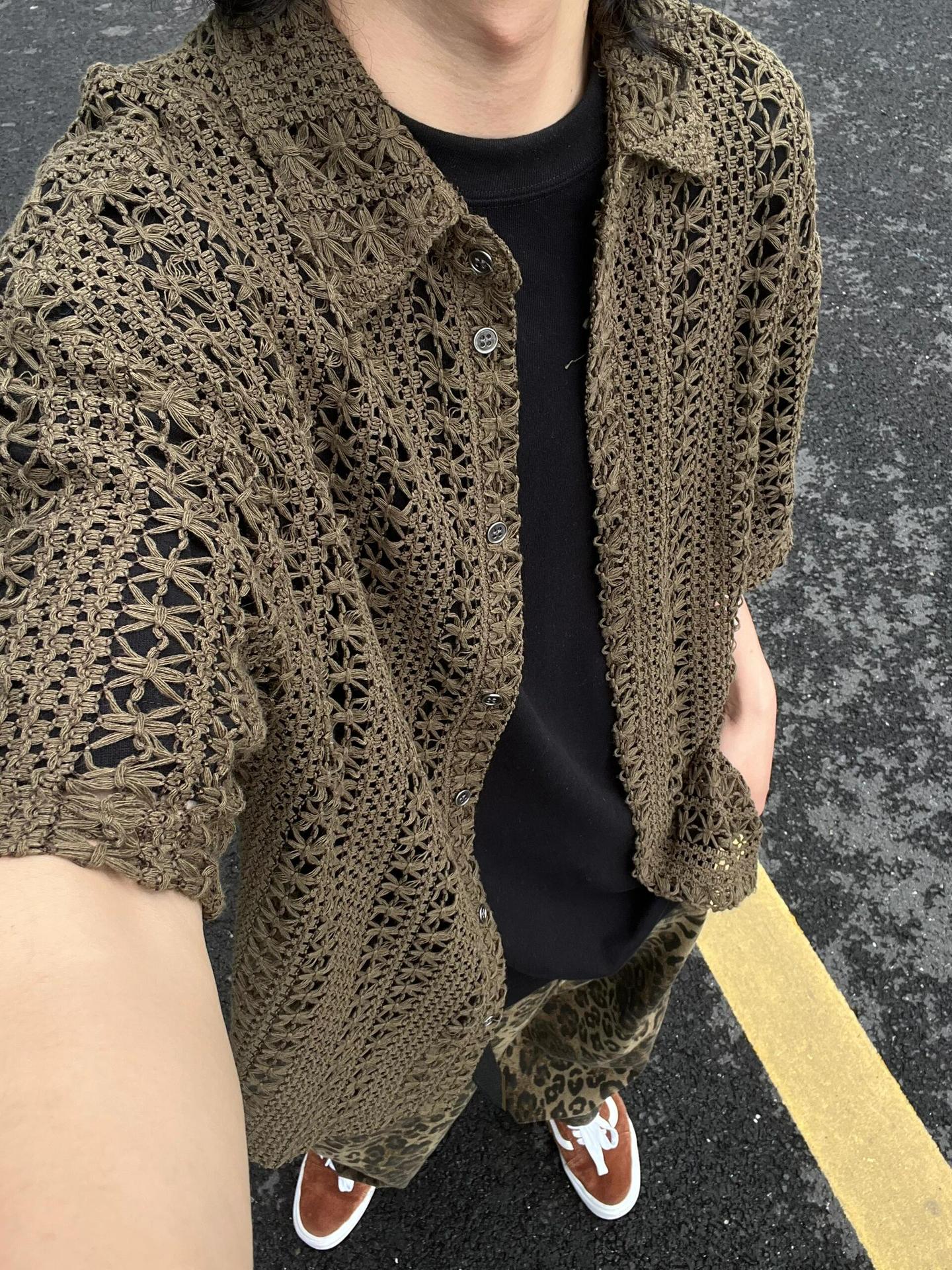 Cleanfit Army Green Hollow Knit Sweater Men's Short Sleeve Summer New American Retro Holiday Style Lapel Half Sleeve