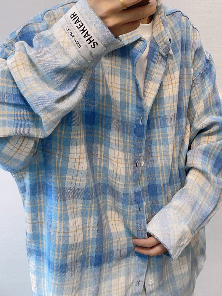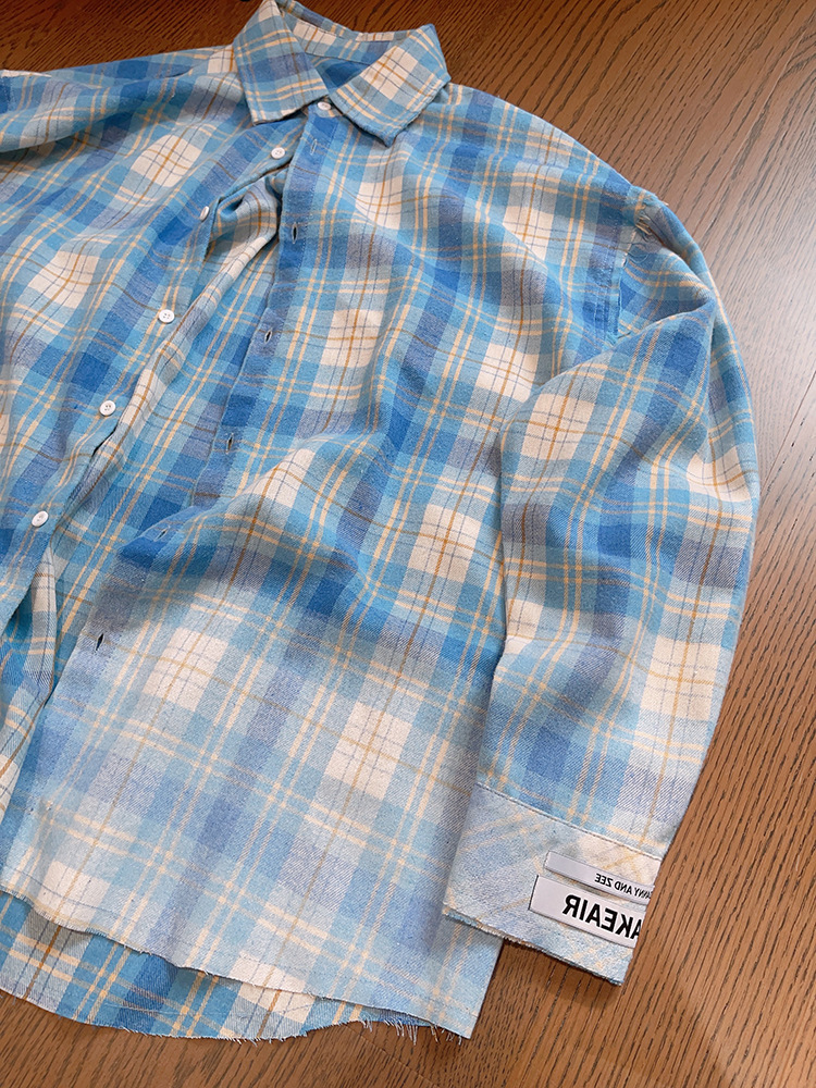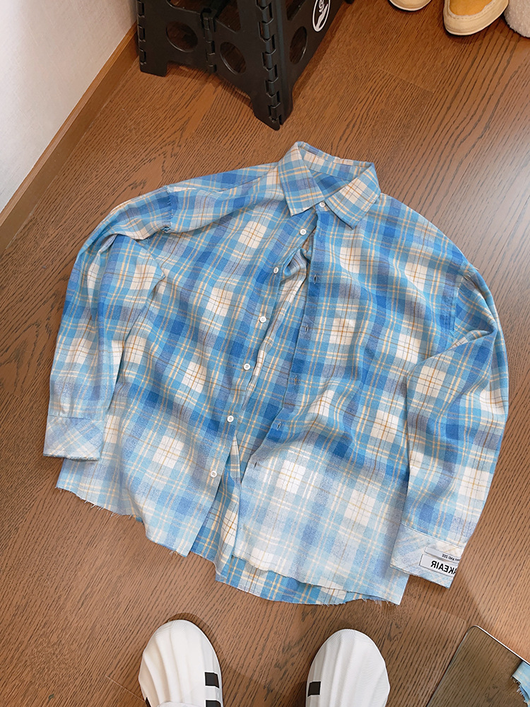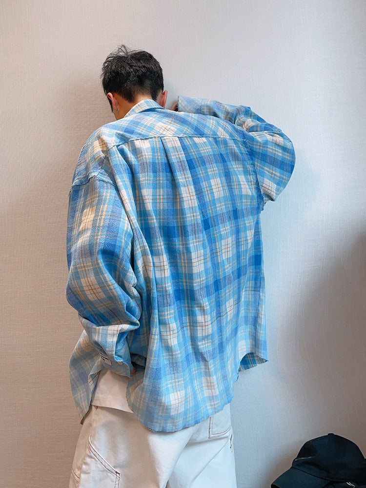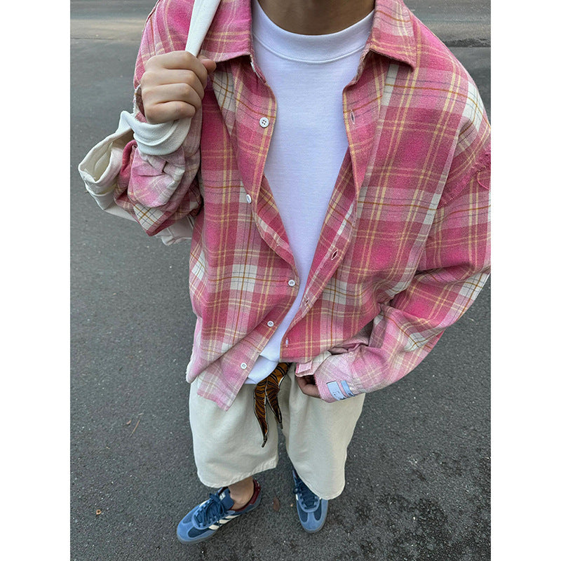 Retro distressed edge gradient printed plaid long-sleeved shirt new summer loose versatile casual shirt jacket