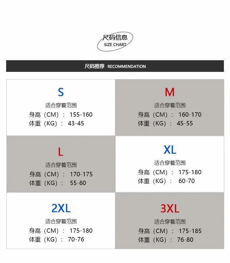Size 2XL: weight 65kg-70kg, height 175-180cm