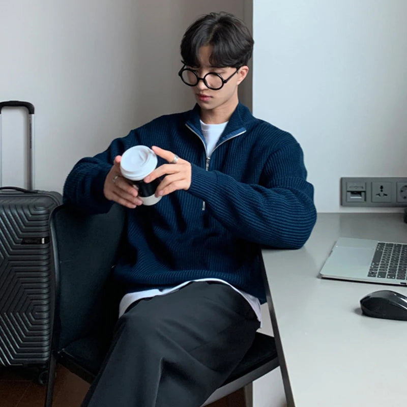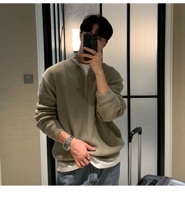 Autumn Clothing Men's Luxury Knitted Pullover Sweater Casual Stand Collar Zipper Solid Color Long Sleeve Loose Knitwear 2024 New