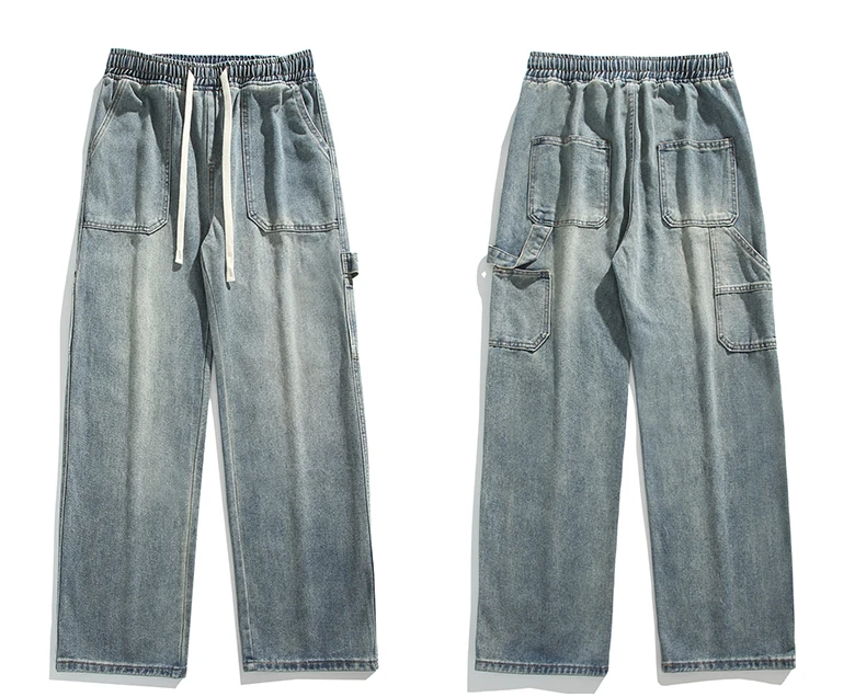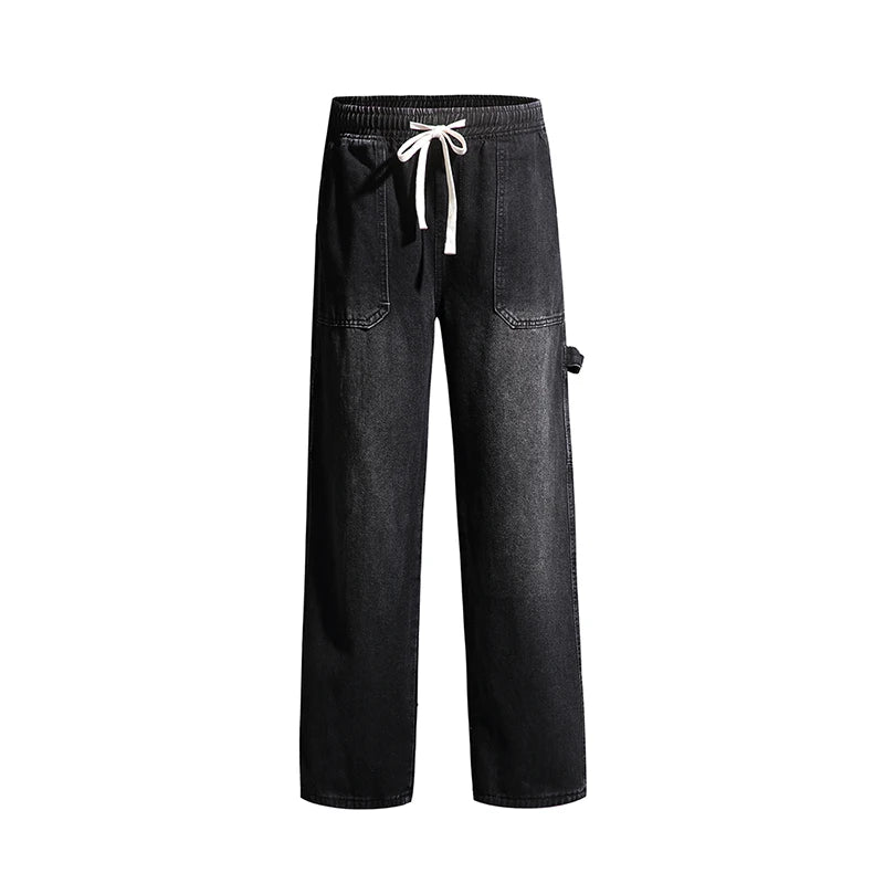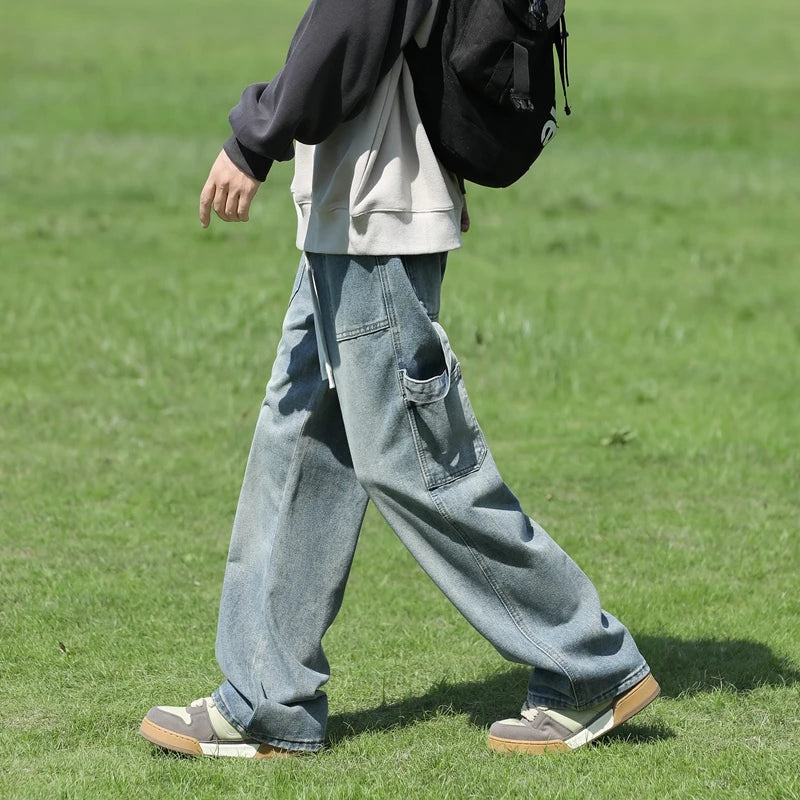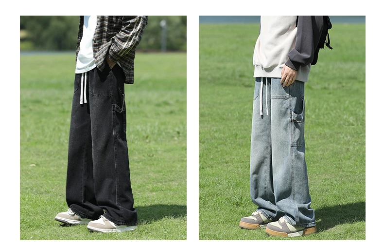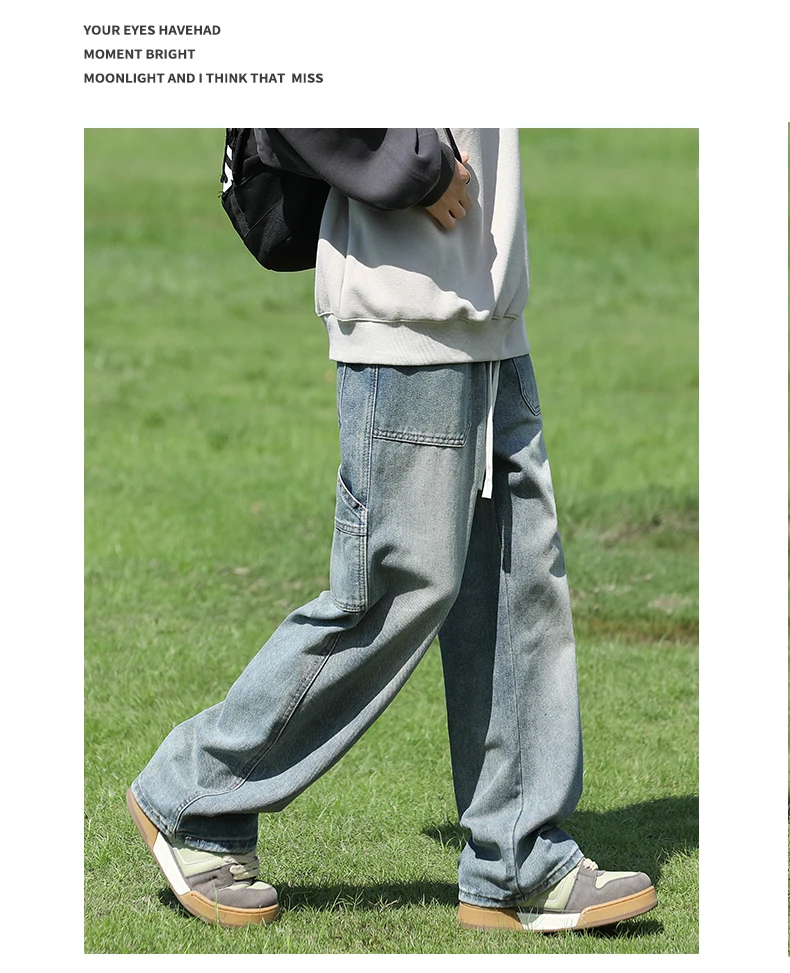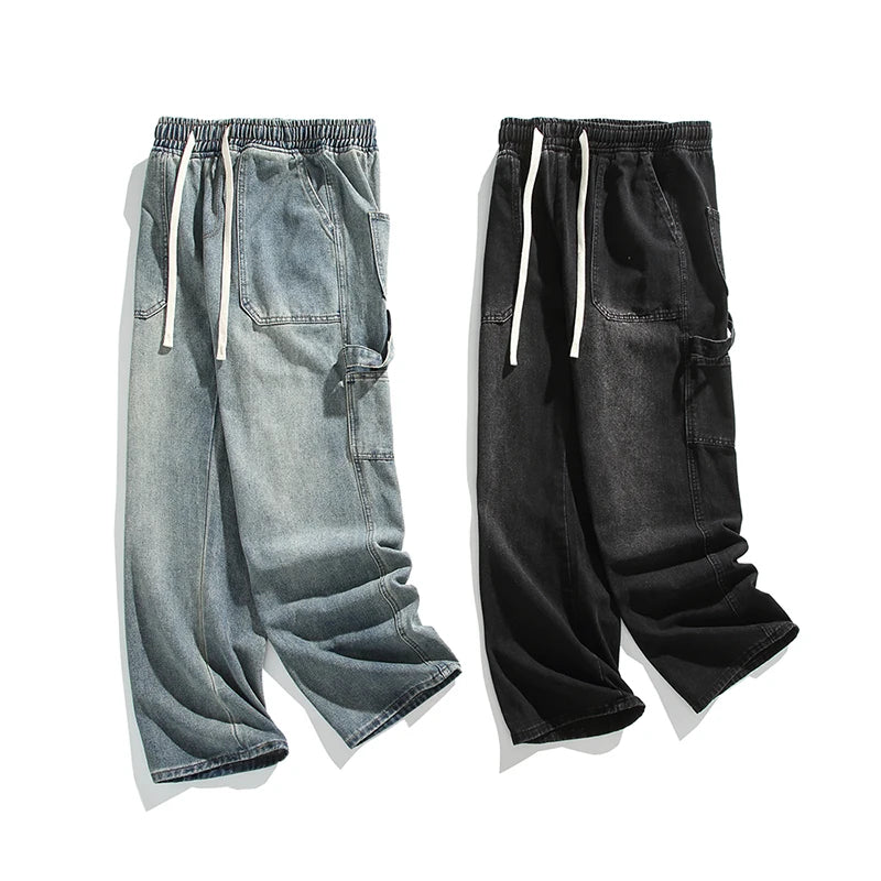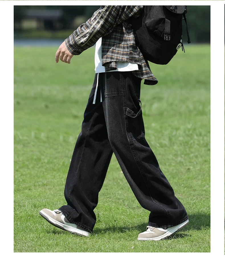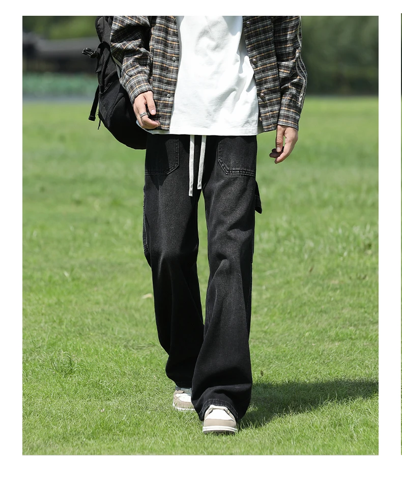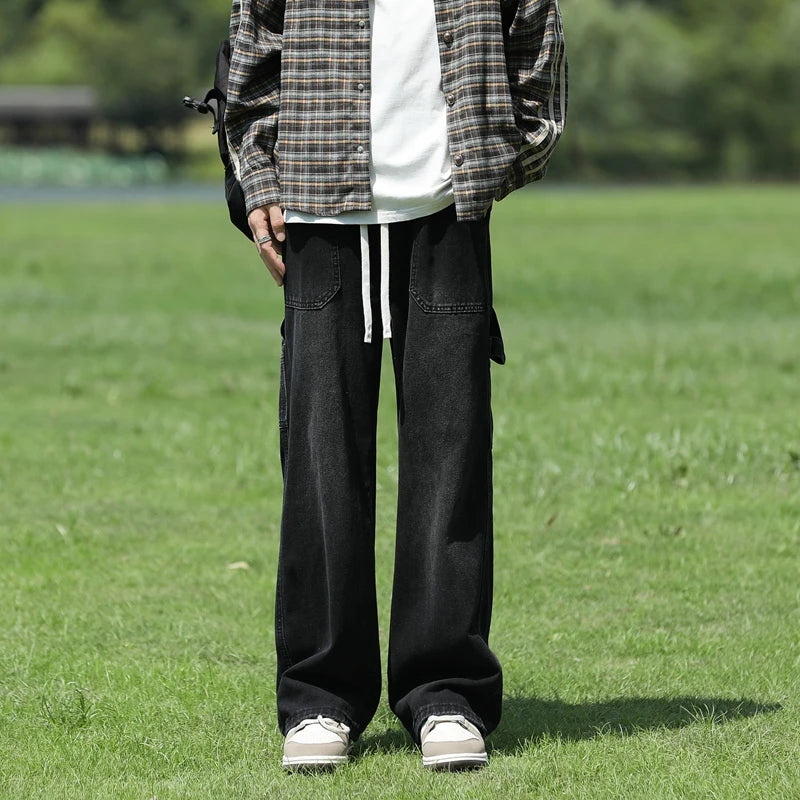 Autumn New Men's Fashion Jeans Patch Pockets Korean Wide Leg Loose Straight Trousers Drawstring Elastic Waist Pants Black Blue