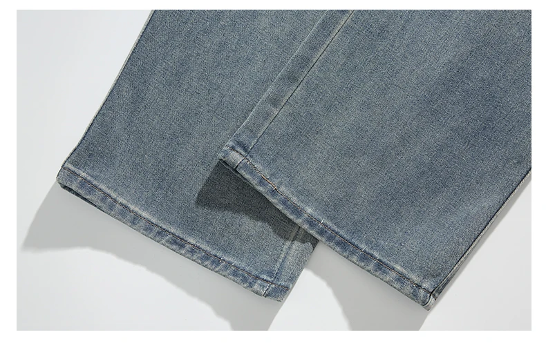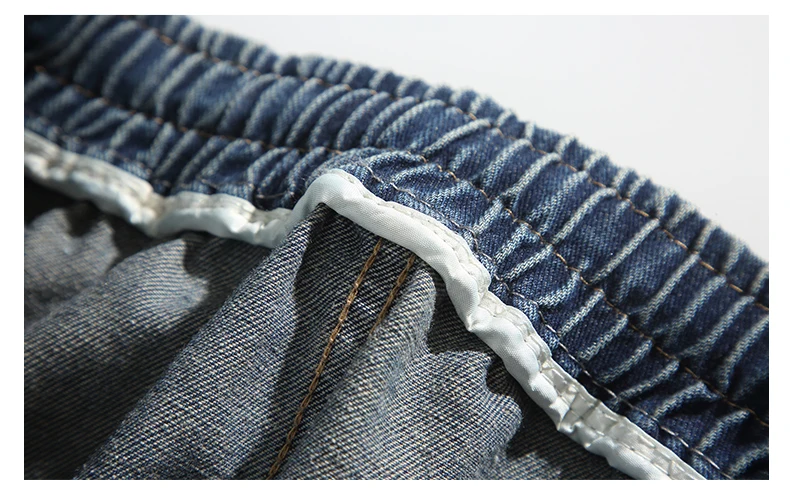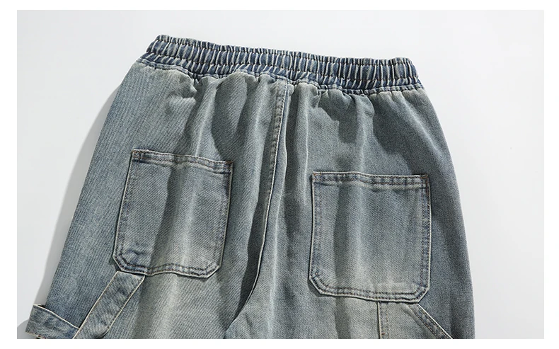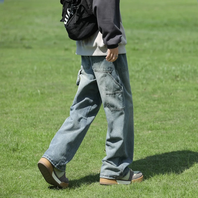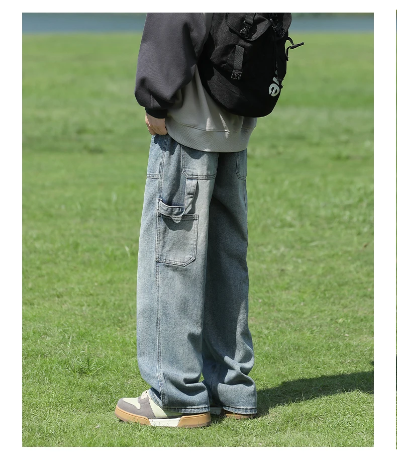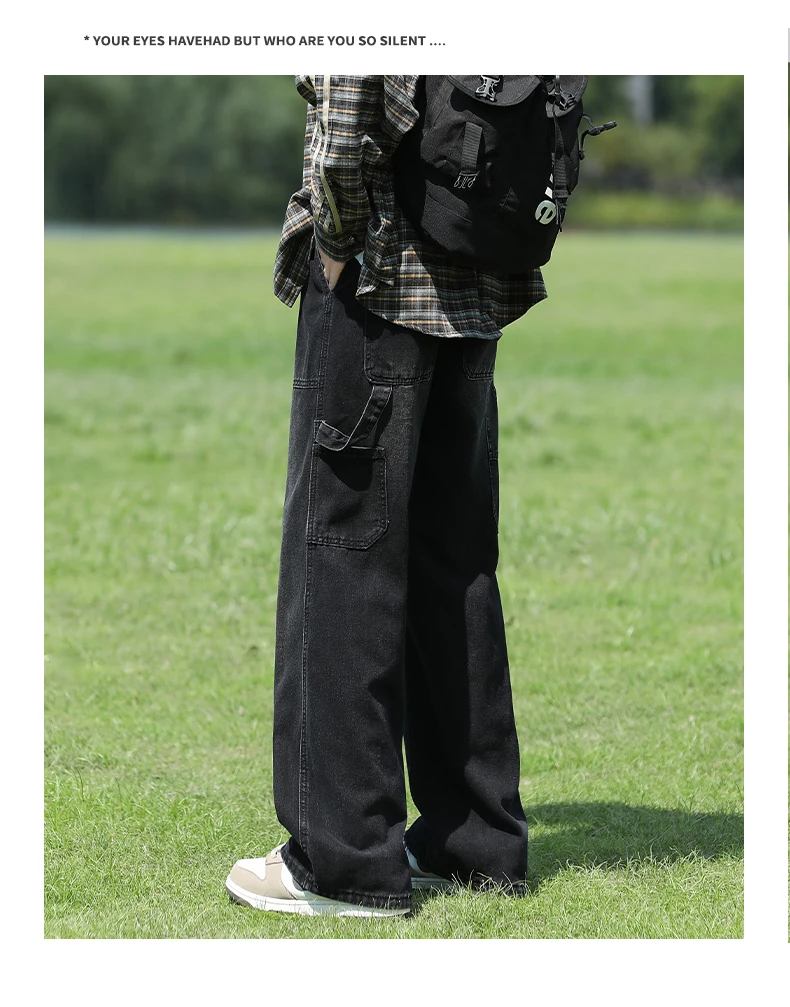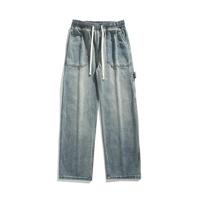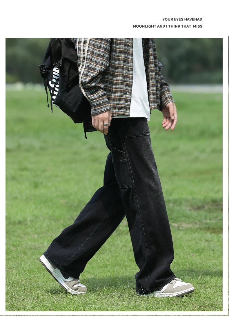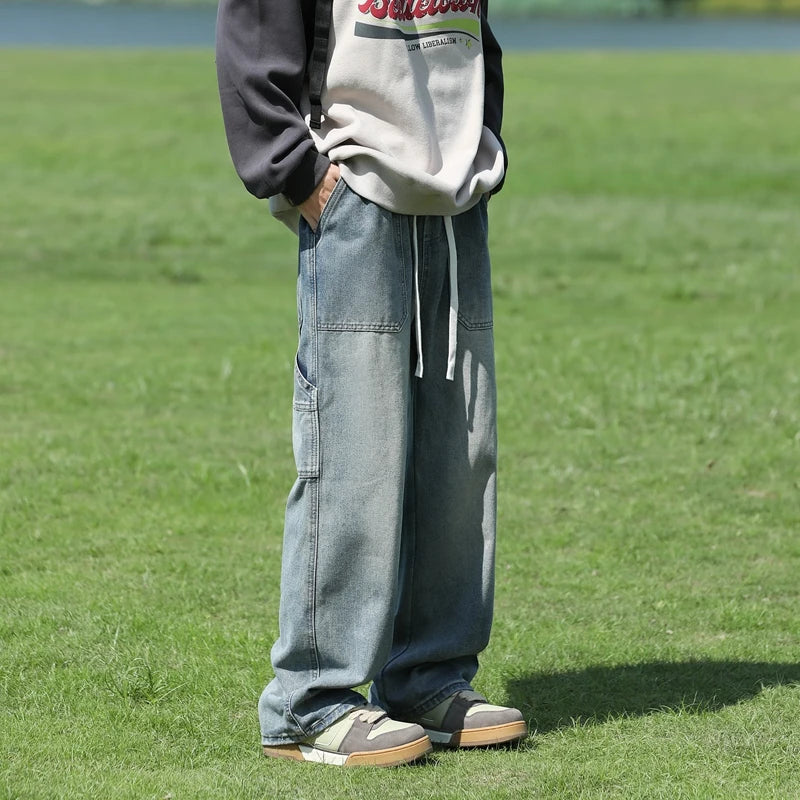 Autumn New Men's Fashion Jeans Patch Pockets Korean Wide Leg Loose Straight Trousers Drawstring Elastic Waist Pants Black Blue