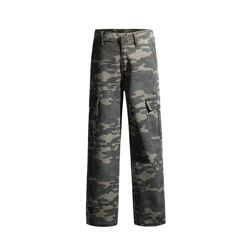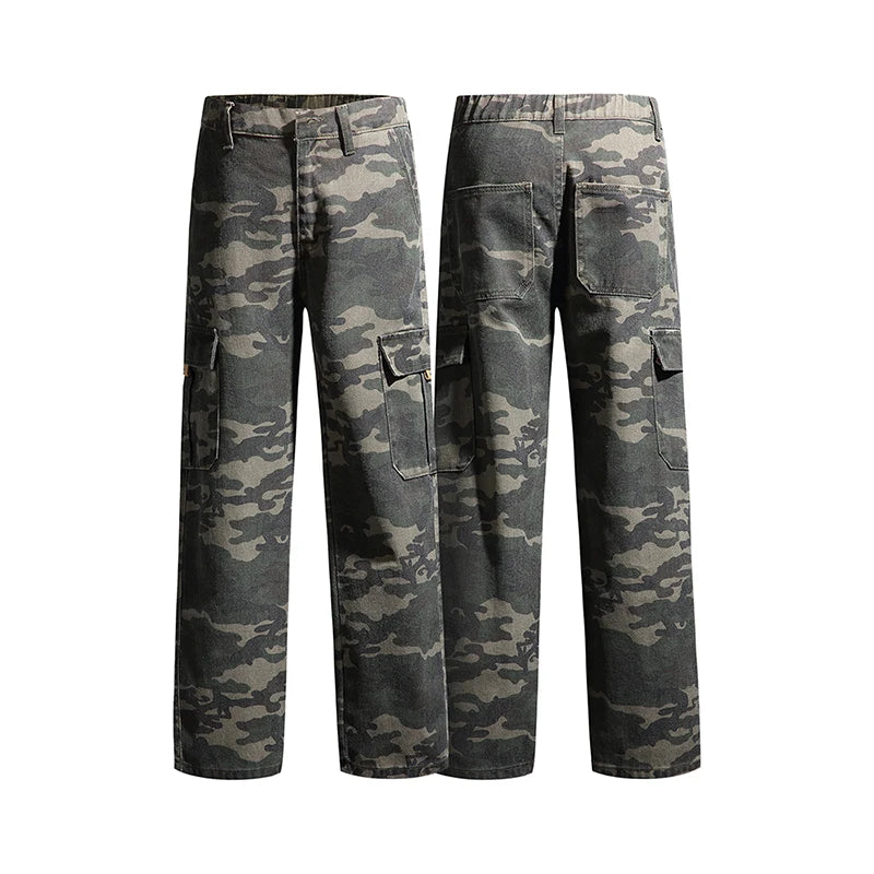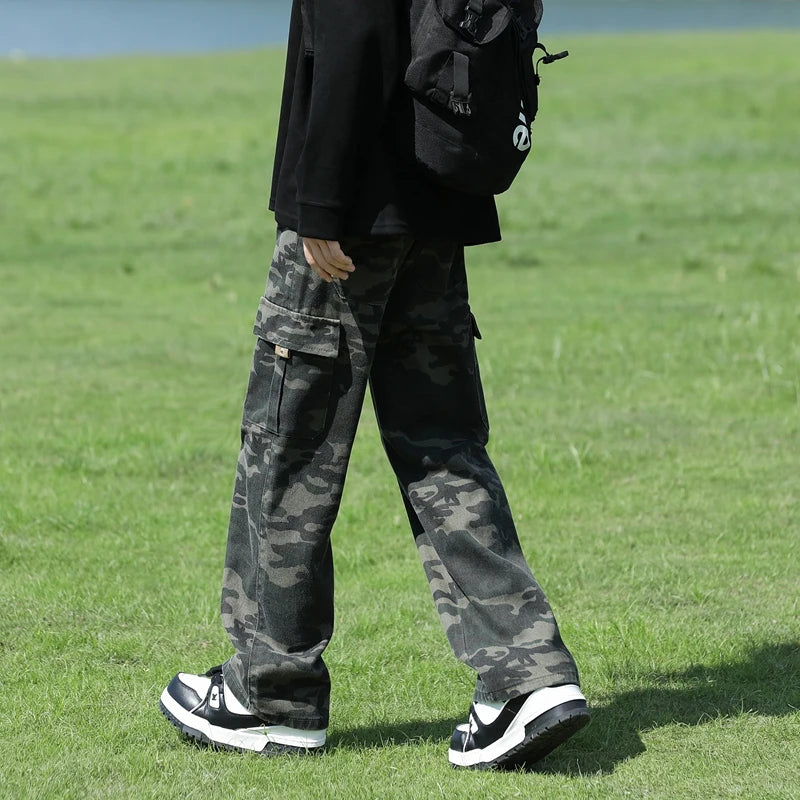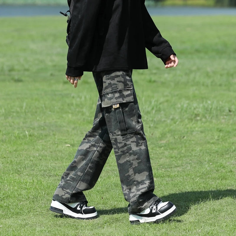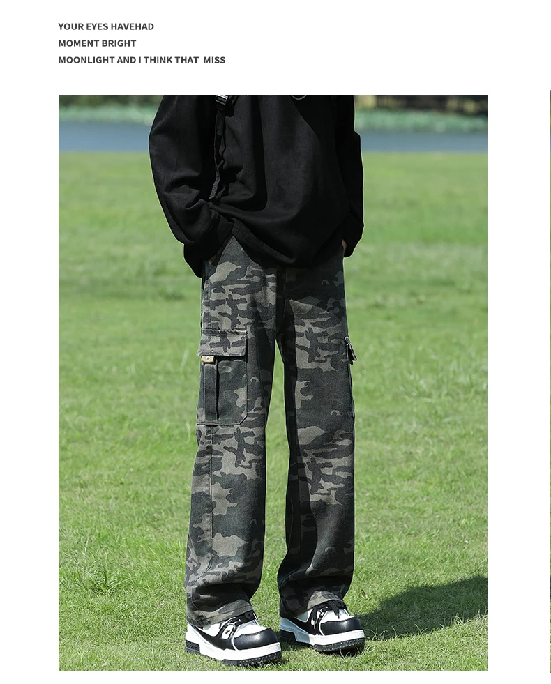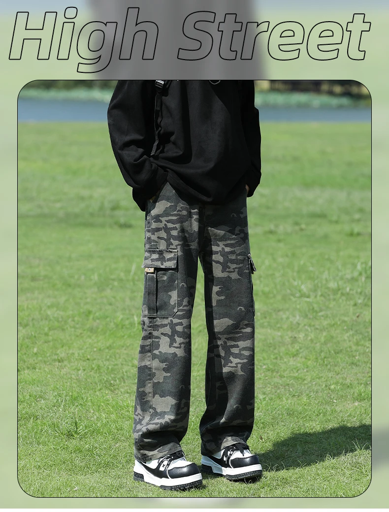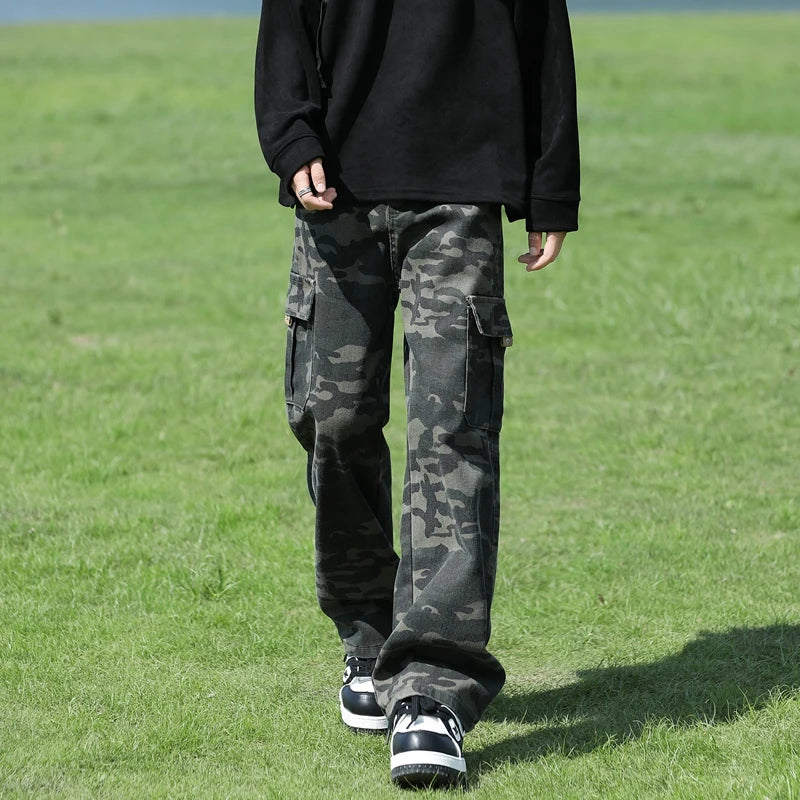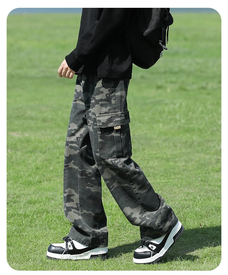 Autumn New Men's Fashion Korean Wide Leg Jeans Camouflage Patch Pocket Loose Straight Trousers Elastic Waist Pants Male