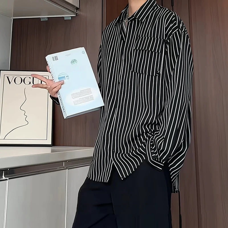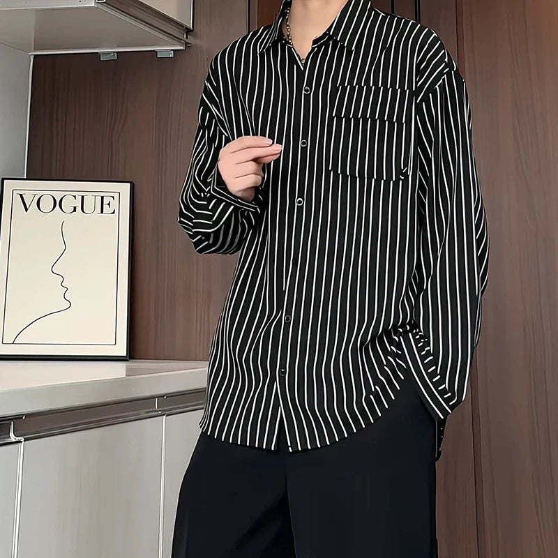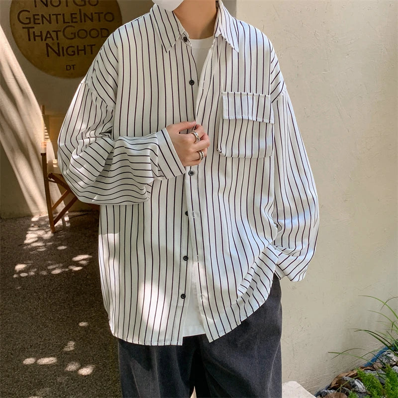 Autumn New Striped Shirt Handsome Long Sleeve Pocket Design Men's Clothing Button Loose Streetwear Casual Korean Autumn