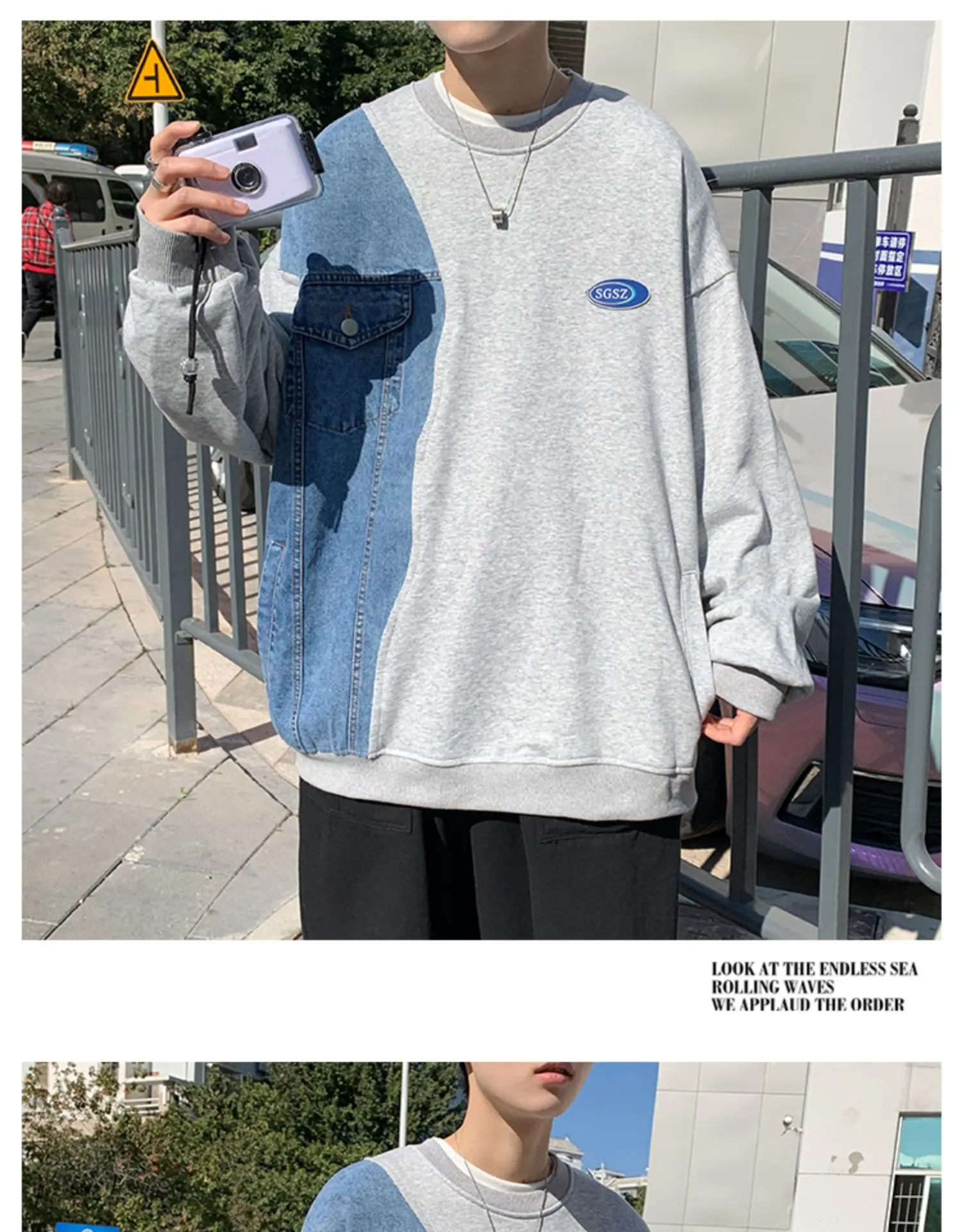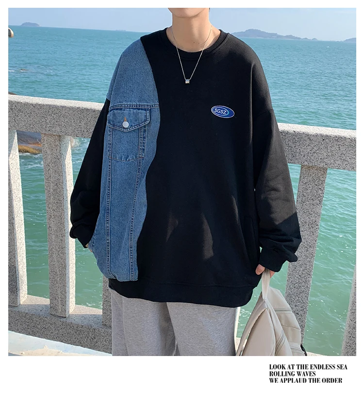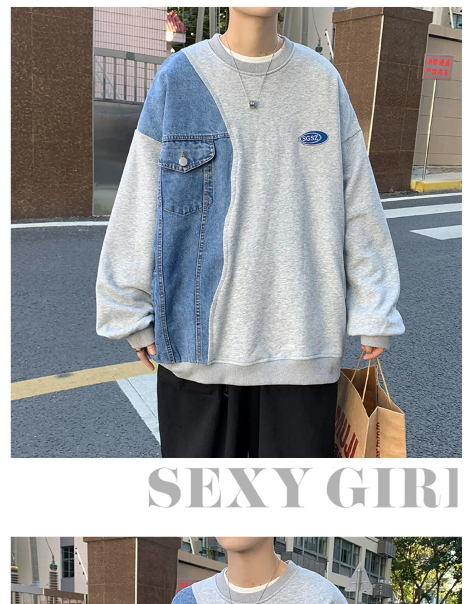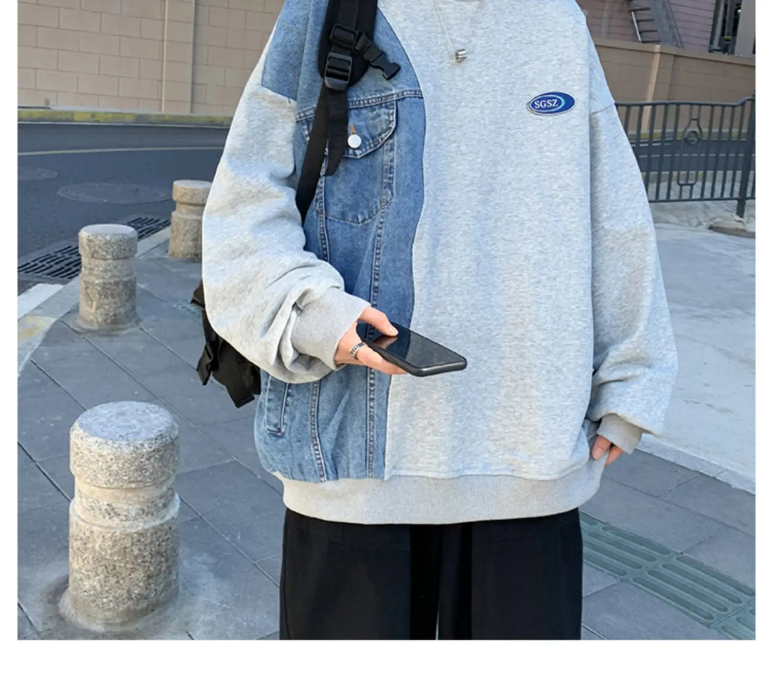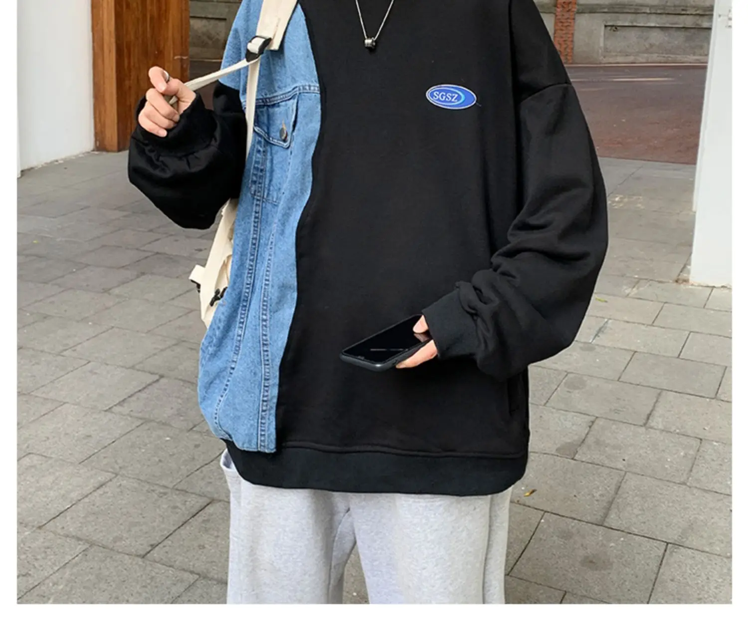 Denim Patchwork Sweatshirt for Men New Autumn Korean Fashion Loose Casual Round Neck Long Sleeve Harajuku Sweatshirt